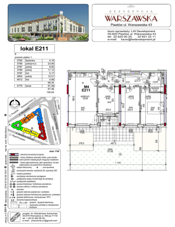 Piastów ul. Warszawska 43 biuro sprzedaży: LW Development 05-820 Piastów ul. Warszawska 43 tel: 22 625 00 25, 22 621 22 11 e-mail: [email protected] lokal E211 arkusz nr L E211 data wydania: 2016-07-22 08:18:51 opracował: C - elementy konstrukcji budynku - ściany działowe wewnątrz lokalu, poza obudowami pionów instalacyjnych mogą być rozebrane - ściana gips-kartonowa, jako opcjonalna, nie jest odejmowana od powierzchni mieszkania - odpływ deszczowy - rura spustowa 90 - oznaczenia otworów: szerokość 90, wysokość 200 200 - nawiew powietrza - wentylacja mechaniczna wyciągowa - podłączenie okapu kuchennego do wentylacji - przełączniki oświetlenia - oprawa kinkietowa / kinkietowa zewnętrzna - oprawa sufitowa / sufitowa zewnętrzna - domofon - gniazdo wtykowe pojedyncze / podwójne - gniazdo wtykowe hermetyczne pojedyncze / podwójne - gniazdo telefoniczne / komputerowe / RTV - skrzynka bezpiecznikowa - grzejnik / grzejnik łazienkowy - opcjonalny schodek w mieszkaniach z tarasami projekt: A1 Włodzimierz Kwieciński 00-679 Warszawa ul. Wilcza 71/18 tel. + 48 22 464 89 49 e-mail: [email protected] 254 80 200 80 200 493 225,5 282 416 11 146,5 352 pokój 12,51 487,5 taras 67,48 1 144 64 212 279,5 skala: 1/100 80 200 11 176,5 90 P 200 90 235 łazienka 4,10 245 B ul. B oha Węz teró wW eł P rusz olno ków ści 253,5 170 160 208 mgr inż. arch. Rafał Sienica A 342 80 200 pokój 11,13 563 r Wa ul. E pokój 8,92 612 hol 5,17 493,5 D pokój+a.k. 23,06 92 206 160 208 ów ka ws a z s M4 E211 252,5 323 szk Pru rs Węzeł d go ie k ls a-Zachó mskie jska Po Warszaw erozoli Al. Wo Aleje J Wa sus -Ur a zaw hol 4,46 160 208 taras 80 200 680,5 4779 4,10 23,06 8,92 11,13 5,17 12,51 4,46 69,35 67,48 67,48 136,83 180 208 E poziom piętra 1. 3785 łazienka 3786 pokój+a.k. 3787 pokój 3788 pokój 3797 hol 3855 pokój 4612 hol