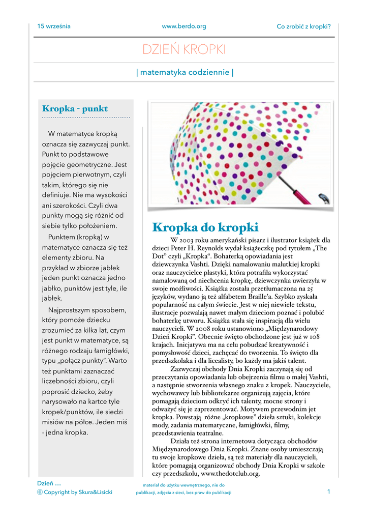 15 września www.berdo.org Co zrobić z kropki? DZIEŃ KROPKI | matematyka codziennie | Kropka - punkt W matematyce kropką oznacza się zazwyczaj punkt. Punkt to podstawowe pojęcie geometryczne. Jest pojęciem pierwotnym, czyli takim, którego się nie definiuje. Nie ma wysokości ani szerokości. Czyli dwa punkty mogą się różnić od siebie tylko położeniem. Punktem (kropką) w matematyce oznacza się też elementy zbioru. Na przykład w zbiorze jabłek jeden punkt oznacza jedno jabłko, punktów jest tyle, ile jabłek. Najprostszym sposobem, który pomoże dziecku zrozumieć za kilka lat, czym jest punkt w matematyce, są różnego rodzaju łamigłówki, typu „połącz punkty“. Warto też punktami zaznaczać liczebności zbioru, czyli poprosić dziecko, żeby narysowało na kartce tyle kropek/punktów, ile siedzi misiów na półce. Jeden miś - jedna kropka. Dzień … Copyright by Skura&Lisicki Kropka do kropki W 2003 roku amerykański pisarz i ilustrator książek dla dzieci Peter H. Reynolds wydał książeczkę pod tytułem „The Dot” czyli „Kropka“. Bohaterką opowiadania jest dziewczynka Vashti. Dzięki namalowaniu malutkiej kropki oraz nauczycielce plastyki, która potrafiła wykorzystać namalowaną od niechcenia kropkę, dziewczynka uwierzyła w swoje możliwości. Książka została przetłumaczona na 25 języków, wydano ją też alfabetem Braille’a. Szybko zyskała popularność na całym świecie. Jest w niej niewiele tekstu, ilustracje pozwalają nawet małym dzieciom poznać i polubić bohaterkę utworu. Książka stała się inspiracją dla wielu nauczycieli. W 2008 roku ustanowiono „Międzynarodowy Dzień Kropki”. Obecnie święto obchodzone jest już w 108 krajach. Inicjatywa ma na celu pobudzać kreatywność i pomysłowość dzieci, zachęcać do tworzenia. To święto dla przedszkolaka i dla licealisty, bo każdy ma jakiś talent. Zazwyczaj obchody Dnia Kropki zaczynają się od przeczytania opowiadania lub obejrzenia filmu o małej Vashti, a następnie stworzenia własnego znaku z kropek. Nauczyciele, wychowawcy lub bibliotekarze organizują zajęcia, które pomagają dzieciom odkryć ich talenty, mocne strony i odważyć się je zaprezentować. Motywem przewodnim jet kropka. Powstają różne „kropkowe” dzieła sztuki, kolekcje mody, zadania matematyczne, łamigłówki, filmy, przedstawienia teatralne. Działa też strona internetowa dotycząca obchodów Międzynarodowego Dnia Kropki. Znane osoby umieszczają tu swoje kropkowe dzieła, są też materiały dla nauczycieli, które pomagają organizować obchody Dnia Kropki w szkole czy przedszkolu, www.thedotclub.org. materiał do użytku wewnętrznego, nie do publikacji, zdjęcia z sieci, bez praw do publikacji 1 15 września Przygotujcie kartki, duży arkusz papieru długopis, ołówek, kredki, pisaki, farby okrągła podkładka pod kubek nożyczki, klej komputer i drukarkę Warto Poszukać na portalach społecznościowych zdarzeń związanych z Międzynarodowym Dniem Kropki. Ubierzcie się dzisiaj w ubrania w kropki - spódniczki, spodenki czy bluzki w groszki to ubrania na dzisiaj. Znajdźcie słowa i melodię do piosenki śpiewnej przez www.berdo.org Co zrobić z kropki? Biedroneczki są w kropeczki Możecie zorganizować obchody Dnia Kropki w Waszym domu. Sposobów świętowania jest wiele, wszystko zależy od Waszych pomysłów. Namalujcie biedroneczki w kropeczki, muchomory w kropki, kropkowane motyle, piegi na nosie. Zróbcie długopisem na białej kartce kropkę. Wykonajcie jej zdjęcie i w komputerze powiększajcie kropkę do jak największych rozmiarów. Wydrukujcie i dokładnie obejrzyjcie. Zauważycie różnego rodzaju szczegóły, których nie można dostrzec, gdy kropka jest mała. Kropki mogą być różnej wielkości, w różnych kolorach, zrobione w różny sposób - pędzlem lub palcem. Ozdóbcie powiększone kropki tak jak chcecie. Oprawcie w ramkę i powieście na ścianie. Przykryjcie okrągły stół arkuszem papieru. Cały papier pokropkujcie, jak chcecie, na jaki kolor chcecie, czym chcecie (mogą być farby, pisaki, stemple, kredki). W ten sposób uzyskacie dużą kropkę z wieloma mniejszymi, kolorowymi kropkami. Na kartce obrysujcie kilka razy okrągły przedmiot, na przykład podkładkę pod kubek. Wytnijcie koła - Katarzynę Sobczyk na Festiwalu w Sopocie w 1964 roku Biedroneczki są w kropeczki. Pokazać dziecku Alfabet Morse’a, który cały składa się z kropek i kresek. Zapiszcie Alfabetem Morse’a swoje imiona. Możecie każdą kreskę i kropkę napisać innym kolorem, wtedy będziecie mieć bardzo kolorowy kropkowy zapis. Dziecko uczy się zaznaczać kropką punkt obrysowywać szablony kół nazywać i rozpoznawać przedmioty o kształcie koła wycinać po linii dzielić koło na pół i składać koło z połówek rozumieć, co znaczy coś powiększyć Dzień … Copyright by Skura&Lisicki kropki i ozdóbcie je jak chcecie. Koła też możecie pokropkować. Każde koło złóżcie na pół i przetnijcie tak, aby otrzymać dwie połówki. Następnie przyklejcie jedną połowę każdej kropki. Trzeba teraz dopasować drugą połowę - nie koniecznie od pary. W ten sposób uzyskacie bardzo ciekawe kropki. Pokażcie palcem na kartce, gdzie ma być kropka, ale jej nie zaznaczajcie. Za to rysujcie wokół takiej kropki na niby. Kropki nie widać, trzeba ją sobie wyobrazić. materiał do użytku wewnętrznego, nie do publikacji, zdjęcia z sieci, bez praw do publikacji 2
