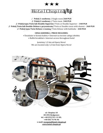♪ Pokój 1-osobowy / Single room 260 PLN ♫ Pokój 2-osobowy / Twin room 340 PLN ♫ Pokój typu Twin lub Double Superior/ Twin or Double Superior – 340 PLN ♫ Pokój Twin lub Double Deluxe z prysznicem/ Twin or Double room with shower - 360 PLN ♫ Pokój typu Twin Deluxe z wanną/ Twin Deluxe with bathtube - 440 PLN CENA ZAWIERA / PRICE INCLUDES: • Śniadanie w formie bufetu • Internet na terenie całego obiektu • Buffet breakfast • Internet access throughout hotel Jesteśmy 1,5 km od Opery Nova! We are located only 1,5 km from Opera Nova! ul. Chopina 10 85-092 Bydgoszcz tel. +48 (52) 521 12 00; +48 602 76 96 46 e-mail: [email protected] www.hotel-chopin.pl