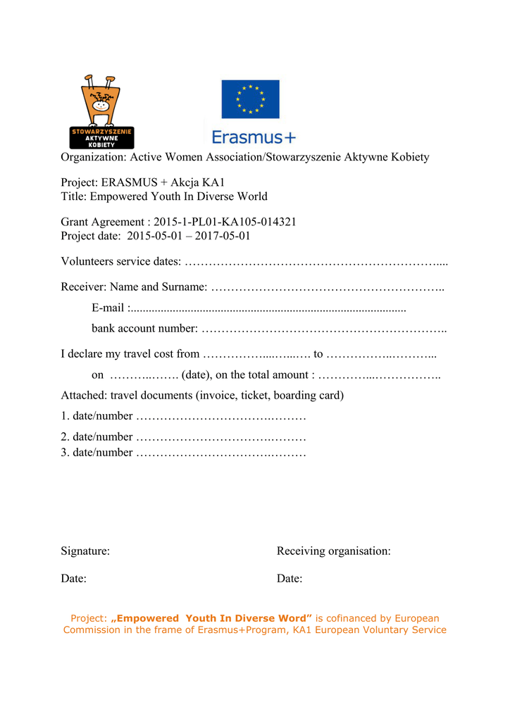 Organization: Active Women Association/Stowarzyszenie Aktywne Kobiety Project: ERASMUS + Akcja KA1 Title: Empowered Youth In Diverse World Grant Agreement : 2015-1-PL01-KA105-014321 Project date: 2015-05-01 – 2017-05-01 Volunteers service dates: ……………………………………………………….... Receiver: Name and Surname: ………………………………………………….. E-mail :............................................................................................ bank account number: …………………………………………………….. I declare my travel cost from ……………....…...…. to ……………..………... on ………..……. (date), on the total amount : …………...…………….. Attached: travel documents (invoice, ticket, boarding card) 1. date/number …………………………….……… 2. date/number …………………………….……… 3. date/number …………………………….……… Signature: Receiving organisation: Date: Date: Project: „Empowered Youth In Diverse Word” is cofinanced by European Commission in the frame of Erasmus+Program, KA1 European Voluntary Service