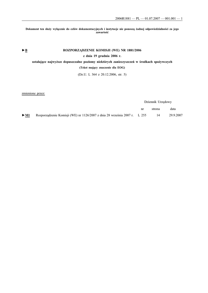 2006R1881 — PL — 01.07.2007 — 001.001 — 1 Dokument ten służy wyłącznie do celów dokumentacyjnych i instytucje nie ponoszą żadnej odpowiedzialności za jego zawartość ►B ROZPORZĄDZENIE KOMISJI (WE) NR 1881/2006 z dnia 19 grudnia 2006 r. ustalające najwyższe dopuszczalne poziomy niektórych zanieczyszczeń w środkach spożywczych (Tekst mający znaczenie dla EOG) (Dz.U. L 364 z 20.12.2006, str. 5) zmienione przez: Dziennik Urzędowy nr ►M1 Rozporządzenie Komisji (WE) nr 1126/2007 z dnia 28 września 2007 r. L 255 strona 14 data 29.9.2007 2006R1881 — PL — 01.07.2007 — 001.001 — 2 ▼B ROZPORZĄDZENIE KOMISJI (WE) NR 1881/2006 z dnia 19 grudnia 2006 r. ustalające najwyższe dopuszczalne poziomy zanieczyszczeń w środkach spożywczych niektórych (Tekst mający znaczenie dla EOG) KOMISJA WSPÓLNOT EUROPEJSKICH, uwzględniając Traktat ustanawiający Wspólnotę Europejską, uwzględniając rozporządzenie Rady (EWG) nr 315/93 z dnia 8 lutego 1993 r. ustanawiające procedury Wspólnoty w odniesieniu do substancji skażających w żywności (1), w szczególności jego art. 2 ust. 3, a także mając na uwadze, co następuje: (1) Rozporządzenie Komisji (WE) nr 466/2001 z 8 marca 2001 r. ustalające najwyższe dopuszczalne poziomy dla niektórych zanieczyszczeń w środkach spożywczych (2) było wielokrotnie i w sposób znaczący zmieniane. Konieczna jest kolejna zmiana najwyższych dopuszczalnych poziomów niektórych zanieczyszczeń w środkach spożywczych w celu uwzględnienia nowych informacji i zmian zawartych w Kodeksie żywnościowym (Codex Alimentarius). Jednocześnie tekst należy, w odpowiednich przypadkach, uczynić bardziej zrozumiałym. Należy zatem zastąpić rozporządzenie (WE) nr 466/2001. (2) Dla ochrony zdrowia publicznego jest rzeczą zasadniczą, by zanieczyszczenia te nie przekraczały poziomów, które są dopuszczalne z toksykologicznego punktu widzenia. (3) Z uwagi na różnice w ustawodawstwie poszczególnych państw członkowskich oraz wiążące się z tym ryzyko zakłócenia konkurencji niezbędne jest wprowadzenie środków wspólnotowych w odniesieniu do niektórych zanieczyszczeń w celu zapewnienia jednolitości rynku przy poszanowaniu zasady proporcjonalności. (4) Najwyższe dopuszczalne poziomy powinny być określone na możliwie rygorystycznym poziomie, który jest rozsądnie osiągalny przy zastosowaniu dobrej praktyki rolniczej, w zakresie rybołówstwa i produkcji, oraz z uwzględnieniem ryzyka związanego z konsumpcją żywności. W przypadku zanieczyszczeń uznanych za genotoksyczne substancje rakotwórcze lub w przypadkach, gdy aktualne narażenie ludności lub najbardziej wrażliwych na skutki narażenia grup ludności jest bliskie czy też przekracza tolerowane pobranie, najwyższe poziomy powinny być określone na najniższym rozsądnie osiągalnym poziomie (ALARA). Takie podejście zapewni, że przedsiębiorcy branży żywnościowej będą stosować środki mające w jak największym stopniu zapobiegać zanieczyszczeniom i je ograniczać w celu ochrony zdrowia publicznego. Ponadto, dla ochrony zdrowia niemowląt i małych dzieci, grupy szczególnie wrażliwej, właściwe jest ustalenie najniższych dopuszczalnych poziomów zanieczyszczeń, które można osiągnąć poprzez staranny dobór surowców stosowanych do produkcji żywności dla niemowląt i małych dzieci. Staranny dobór surowców jest także właściwy w przypadku produkcji niektórych specjalnych środków spożywczych, takich jak otręby przeznaczone do bezpośredniego spożycia przez ludzi. (1) Dz.U. L 37 z 13.2.1993, str. 1. Rozporządzenie zmienione rozporządzeniem (WE) nr 1882/2003 Parlamentu Europejskiego i Rady (Dz.U. L 284 z 31.10.2003, str. 1). 2 ( ) Dz.U. L 77 z 16.3.2001, str. 1. Rozporządzenie ostatnio zmienione rozporządzeniem (WE) nr 199/2006 (Dz.U. L 32 z 4.2.2006, str. 32). 2006R1881 — PL — 01.07.2007 — 001.001 — 3 ▼B (5) Aby najwyższe dopuszczalne poziomy mogły mieć zastosowanie do suszonych, rozcieńczonych, przetworzonych lub złożonych środków spożywczych, w przypadku gdy na szczeblu wspólnotowym nie ma ustalonych najwyższych dopuszczalnych poziomów, przedsiębiorcy branży spożywczej powinni udostępnić konkretne współczynniki zatężenia i rozcieńczenia wraz z właściwymi danymi doświadczalnymi uzasadniającymi te proponowane współczynniki. (6) W celu zapewnienia skutecznej ochrony zdrowia publicznego, do obrotu handlowego nie mogą być wprowadzane ani same produkty zawierające zanieczyszczenia w ilościach przekraczających najwyższe dopuszczalne poziomy, ani mieszaniny tych produktów z innymi środkami spożywczymi; produkty te nie mogą też być stosowane jako składniki innych środków spożywczych. (7) Uznaje się, że sortowanie lub inne metody fizycznej obróbki umożliwiają zmniejszenie zawartości aflatoksyn w przesyłkach zawierających orzechy arachidowe, orzechy, suszone owoce i kukurydzę. W celu zminimalizowania wpływu na handel właściwe jest dopuszczenie wyższej zawartości aflatoksyn w tych produktach, które nie są przeznaczone do bezpośredniego spożycia przez ludzi, lub też użycia jako składnik środka spożywczego. W takich przypadkach najwyższe dopuszczalne poziomy aflatoksyn powinnny być ustalane przy uwzględnieniu skuteczności wspomnianej powyżej obróbki w zmniejszaniu zawartości aflatoksyn w orzechach arachidowych, orzechach, suszonych owocach i kukurydzy, na poziomach poniżej najwyższych dopuszczalnych poziomów ustalonych dla tych produktów przeznaczonych do spożycia przez ludzi lub do zastosowania jako składniki w środkach spożywczych. (8) Aby umożliwić skuteczne egzekwowanie najwyższych dopuszczalnych poziomów niektórych zanieczyszczeń w niektórych środkach spożywczych, należy dla tych przypadków wprowadzić odpowiednie przepisy dotyczące etykietowania. (9) Z uwagi na warunki klimatyczne panujące w niektórych państwach cz