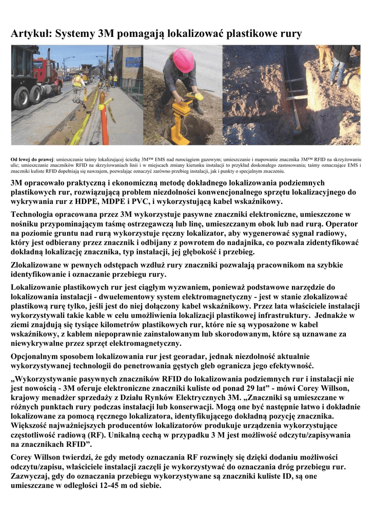 Artykuł: Systemy 3M pomagają lokalizować plastikowe rury Od lewej do prawej: umieszczanie taśmy lokalizującej ścieżkę 3M™ EMS nad rurociągiem gazowym; umieszczanie i mapowanie znacznika 3M™ RFID na skrzyżowaniu ulic; umieszczanie znaczników RFID na skrzyżowaniach linii i w miejscach zmiany kierunku instalacji to przykład doskonałego zastosowania; taśmy oznaczające EMS i znaczniki kuliste RFID dopełniają się nawzajem, pozwalając oznaczyć zarówno przebieg instalacji, jak i punkty o specjalnym znaczeniu. 3M opracowało praktyczną i ekonomiczną metodę dokładnego lokalizowania podziemnych plastikowych rur, rozwiązującą problem niezdolności konwencjonalnego sprzętu lokalizacyjnego do wykrywania rur z HDPE, MDPE i PVC, i wykorzystującą kabel wskaźnikowy. Technologia opracowana przez 3M wykorzystuje pasywne znaczniki elektroniczne, umieszczone w nośniku przypominającym taśmę ostrzegawczą lub linę, umieszczanym obok lub nad rurą. Operator na poziomie gruntu nad rurą wykorzystuje ręczny lokalizator, aby wygenerować sygnał radiowy, który jest odbierany przez znacznik i odbijany z powrotem do nadajnika, co pozwala zidentyfikować dokładną lokalizację znacznika, typ instalacji, jej głębokość i przebieg. Zlokalizowane w pewnych odstępach wzdłuż rury znaczniki pozwalają pracownikom na szybkie identyfikowanie i oznaczanie przebiegu rury. Lokalizowanie plastikowych rur jest ciągłym wyzwaniem, ponieważ podstawowe narzędzie do lokalizowania instalacji - dwuelementowy system elektromagnetyczny - jest w stanie zlokalizować plastikową rurę tylko, jeśli jest do niej dołączony kabel wskaźnikowy. Przez lata właściciele instalacji wykorzystywali takie kable w celu umożliwienia lokalizacji plastikowej infrastruktury. Jednakże w ziemi znajdują się tysiące kilometrów plastikowych rur, które nie są wyposażone w kabel wskaźnikowy, z kablem niepoprawnie zainstalowanym lub skorodowanym, które są uznawane za niewykrywalne przez sprzęt elektromagnetyczny. Opcjonalnym sposobem lokalizowania rur jest georadar, jednak niezdolność aktualnie wykorzystywanej technologii do penetrowania gęstych gleb ogranicza jego efektywność. „Wykorzystywanie pasywnych znaczników RFID do lokalizowania podziemnych rur i instalacji nie jest nowością - 3M oferuje elektroniczne znaczniki kuliste od ponad 29 lat” - mówi Corey Willson, krajowy menadżer sprzedaży z Działu Rynków Elektrycznych 3M. „Znaczniki są umieszczane w różnych punktach rury podczas instalacji lub konserwacji. Mogą one być następnie łatwo i dokładnie lokalizowane za pomocą ręcznego lokalizatora, identyfikującego dokładną pozycję znacznika. Większość najważniejszych producentów lokalizatorów produkuje urządzenia wykorzystujące częstotliwość radiową (RF). Unikalną cechą w przypadku 3 M jest możliwość odczytu/zapisywania na znacznikach RFID”. Corey Willson twierdzi, że gdy metody oznaczania RF rozwinęły się dzięki dodaniu możliwości odczytu/zapisu, właściciele instalacji zaczęli je wykorzystywać do oznaczania dróg przebiegu rur. Zazwyczaj, gdy do oznaczania przebiegu wykorzystywane są znaczniki kuliste ID, są one umieszczane w odległości 12-45 m od siebie. „Wykorzystując naszą wiedzę i doświadczenie w zakresie systemów oznaczania RF” - mówi Willson „zdołaliśmy opracować pakiet produktów umożliwiających rozłożenie znaczników w odległości mniej niż 3 m od siebie, co pozwoliło nam odpowiedzieć na niezaspokojone dotąd potrzeby związane z lokalizowaniem instalacji niemetalowych”. Elementy wpuszczane Corey Willson twierdzi, że oznaczanie ścieżki ma być alternatywą zastępującą obecne instalacje wykorzystujące taśmę ostrzegawczą i kabel wskaźnikowy. Jedną z korzyści oferowanych przez tę technologię jest to, że nie wymaga ona ciągłości - można rozdzielać ciągi znaczników lub usuwać sekcje bez wpływu na możliwości lokalizacji. Korzyści oferowane przez znaczniki ścieżki W zakresie lokalizowania podziemnych plastikowych rur i przewodów, technologia oznaczania ścieżki 3M oferuje wiele korzyści w porównaniu z metodami elektromagnetycznymi i opierającymi się na wykorzystaniu georadaru: Łatwość instalacji, szybkie, łatwe i dokładne lokalizowanie Znaczniki nie wymagają konserwacji, są odporne na korozję i funkcjonują tak długo jak rura; W odróżnieniu od konwencjonalnych systemów lokalizacji kabla wskaźnikowego, nie jest potrzebny nadajnik; Znaczniki nie posiadają elementów elektrycznych i nie przekazują energii w przypadku uderzenia pioruna; Wysoka tolerancja na przeciążenie, pobliskie urządzenia nie zakłócają sygnału RF; Ciągłość nie jest wymagana - usunięcie segmentu znaczników nie wpływa na możliwość lokalizacji innych znaczników; oraz Mniejsza złożoność lokalizatora sprawia, że nauka jest łatwiejsza. Dzięki podwójnym częstotliwościom, lokalizatory mogą odbierać sygnały zarówno ze znaczników kulistych, jak i znaczników ścieżki. Pod wieloma względami lokalizowanie ścieżki z wykorzystaniem technologii EMS jest podobne do technologii oznaczania RF, jednak istnieją pewne ważne różnice. „Dostosowane znaczniki ścieżki są umieszczane w nośniku takim jak taśma ostrzegawcza lub lina, nie są stosowane, jako indywidualne znaczniki” - wyjaśnia Willson. „Znaczniki nie są urządzeniami elektrycznymi i nie płynie w nich prąd. Są one wykonane z rezonujących mechanicznie materiałów magnetycznych, które mogą oddziaływać z pobliskimi polami magnetycznymi. Znaczniki są umieszczane z osią anteny ustawianą pionowo, co zapewnia wydłużone pole detekcji, tworzące ścieżkę oznaczania podziemnych instalacji”. Kiedy lokalizator wygeneruje w pobliżu znacznika pole magnetyczne w częstotliwości jego rezonansu mechanicznego, podłużny element magnetyczny znacznika zaczyna wibrować, wykorzystując zgromadzoną en