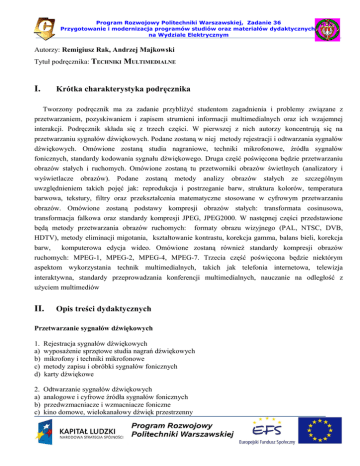 Program Rozwojowy Politechniki Warszawskiej, Zadanie 36 Przygotowanie i modernizacja programów studiów oraz materiałów dydaktycznych na Wydziale Elektrycznym Autorzy: Remigiusz Rak, Andrzej Majkowski Tytuł podręcznika: TECHNIKI MULTIMEDIALNE I. Krótka charakterystyka podręcznika Tworzony podręcznik ma za zadanie przybliżyć studentom zagadnienia i problemy związane z przetwarzaniem, pozyskiwaniem i zapisem strumieni informacji multimedialnych oraz ich wzajemnej interakcji. Podręcznik składa się z trzech części. W pierwszej z nich autorzy koncentrują się na przetwarzaniu sygnałów dźwiękowych. Podane zostaną w niej metody rejestracji i odtwarzania sygnałów dźwiękowych. Omówione zostaną studia nagraniowe, techniki mikrofonowe, źródła sygnałów fonicznych, standardy kodowania sygnału dźwiękowego. Druga część poświęcona będzie przetwarzaniu obrazów stałych i ruchomych. Omówione zostaną tu przetworniki obrazów świetlnych (analizatory i wyświetlacze obrazów). Podane zostaną metody analizy obrazów stałych ze szczególnym uwzględnieniem takich pojęć jak: reprodukcja i postrzeganie barw, struktura kolorów, temperatura barwowa, tekstury, filtry oraz przekształcenia matematyczne stosowane w cyfrowym przetwarzaniu obrazów. Omówione zostaną podstawy kompresji obrazów stałych: transformata cosinusowa, transformacja falkowa oraz standardy kompresji JPEG, JPEG2000. W następnej części przedstawione będą metody przetwarzania obrazów ruchomych: formaty obrazu wizyjnego (PAL, NTSC, DVB, HDTV), metody eliminacji migotania, kształtowanie kontrastu, korekcja gamma, balans bieli, korekcja barw, komputerowa edycja wideo. Omówione zostaną również standardy kompresji obrazów ruchomych: MPEG-1, MPEG-2, MPEG-4, MPEG-7. Trzecia część poświęcona będzie niektórym aspektom wykorzystania technik multimedialnych, takich jak telefonia internetowa, telewizja interaktywna, standardy przeprowadzania konferencji multimedialnych, nauczanie na odległość z użyciem multimediów II. Opis treści dydaktycznych Przetwarzanie sygnałów dźwiękowych 1. a) b) c) d) Rejestracja sygnałów dźwiękowych wyposażenie sprzętowe studia nagrań dźwiękowych mikrofony i techniki mikrofonowe metody zapisu i obróbki sygnałów fonicznych karty dźwiękowe 2. a) b) c) Odtwarzanie sygnałów dźwiękowych analogowe i cyfrowe źródła sygnałów fonicznych przedwzmacniacze i wzmacniacze foniczne kino domowe, wielokanałowy dźwięk przestrzenny Program Rozwojowy Politechniki Warszawskiej, Zadanie 36 Przygotowanie i modernizacja programów studiów oraz materiałów dydaktycznych na Wydziale Elektrycznym 3. a) b) c) d) Standardy kodowania sygnału dźwięku kontenery multimedialne elementy psychoakustyki podstawy kompresji sygnałów dźwiękowych formaty kodowania, kompresji, przechowywania dźwięku (np. PCM, MP3, OGG, AAC) Przetwarzanie obrazów 1. Przetworniki obrazów świetlnych a) analizatory obrazów CCD, CMOS b) wyświetlacze obrazów: ekrany plazmowe, ekrany ciekłokrystaliczne c) projektory multimedialne 2. Obrazy stałe a) Analiza obrazów cyfrowych - reprodukcja i postrzeganie barw, struktura kolorów - przekształcenia matematyczne stosowane w cyfrowym przetwarzaniu obrazów b) Kompresja obrazów stałych - transformata kosinusowa - JPEG - JPEG2000 3. Obrazy ruchome a) Cyfrowe przetwarzanie sekwencji obrazów - formaty obrazu wizyjnego: PAL, NTSC, DVB, HDTV - kształtowanie kontrastu, korekcja gamma, balans bieli, korekcja barw, eliminacja migotania - algorytmy poprawy jakości obrazu - komputerowa edycja wideo b) Kompresja obrazów ruchomych - MPEG-1, MPEG-2, MPEG-4, MPEG-7 Wykorzystanie technik multimedialnych 1. a) b) c) Media strumieniowe rola mediów strumieniowych w Internecie sposoby dostępu do mediów strumieniowych radio i telewizja internetowa 2. Telefonia internetowa a) pakietyzacja sygnału mowy b) architektura sieci VoIP c) kodeki stosowane w sieciach VoIP d) protokoły stosowane w sieciach VoIP 3. Telewizja interaktywna a) elementy telewizji interaktywnej b) protokoły, budowa, zasada działania telewizji interaktywnej Program Rozwojowy Politechniki Warszawskiej, Zadanie 36 Przygotowanie i modernizacja programów studiów oraz materiałów dydaktycznych na Wydziale Elektrycznym 4. a) b) c) Standardy przeprowadzania konferencji multimedialnych protokoły transmisji danych oprogramowanie i sprzęt potrzebny do zestawienia konferencji multimedialnej rozwiązania praktyczne 5. Nauczanie na odległość z użyciem multimediów a) techniki stosowane w nauczaniu na odległość b) laboratoria z dostępem zdalnym c) zalety i wady nauczania na odległość III. Zasady ogólne zaliczania przedmiotu Techniki Multimedialne 1. Zasady zaliczenia przedmiotu zostają przedstawione na pierwszych zajęciach. 2. Aby zaliczyć przedmiot student musi zdobyć 51% możliwych do otrzymania punktów. 3. Podstawową formą zaliczenia przedmiotu jest kolokwium obejmujące całość przedstawionego na wykładzie materiału. Kolokwium może mieć postać pisemną lub ustną. 4. Dodatkowo punkty mogą być przyznawane za: - wykonanie sprawozdań lub projektów - aktywność studenta na wykładzie 5. Liczba punktów jest przeliczana na ocenę wg następującej skali: Zakres punktów - Ocena do 50% 2,0 51% - 60% 3,0 61% - 70% 3,5 71% - 80% 4,0 81% - 90% 4,5 pow. 91% 6. IV. 5,0 W trakcie trwania semestru nie ma możliwości zmian w punktacji. Lista wyposażenia, oprogramowania, dodatków multimedialnych W przyswojeniu treści podręcznika może być pomocne oprogramowanie do przetwarzania sygnałów dźwiękowych typu Audacity, kodek Lame, oprogramowanie do przetwarzania obrazów stałych np. GIMP, oprogramowanie do montażu filmów typu Windows Movie Maker, uniwersalne środowisko programistyczne Matlab. Program Rozwojowy Politechniki Warszawskiej, Zadanie 36 Przygotowanie i modernizacja programów studiów oraz materiałów dydaktycznych na Wydziale Elektrycznym