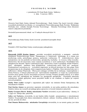 P R O T O K Ó Ł Nr V/20/09 z posiedzenia XX Sesji Rady Gminy Subkowy w dniu 9 czerwca 2009 r. Ad 1 Otwarcia Sesji Rady Gminy dokonał Przewodniczący Rady Gminy Pan Jacek Lisewski witając wszystkich przybyłych na obrady, a w szczególności Przewodniczącego Rady Powiatu Waldemara Pawluska oraz członka Zarządu Powiatu Tczewskiego Henryka Nowickiego (lista obecności stanowi załącznik do protokołu). Stwierdził prawomocność obrad: na 15 radnych obecnych było 14. Ad 2 Przewodniczący Rady Gminy Jacek Lisewski przedstawił porządek obrad. Ad 3 Protokół z XIX Sesji Rady Gminy został przyjęty jednogłośnie. Ad 4 Kierownik GOPS Karina Janusz powitała wszystkich przybyłych, a następnie omówiła działalność Środowiskowego Domu Samopomocy w Narkowach informując, że w domu tym przebywają osoby, potrzebujące pomocy, społecznie wykluczone. W środowiskowym domu samopomocy nie ma podziału na kierownika, sprzątaczkę, kucharkę - tu wszyscy robią wszystko. Domownicy tak ich nazywamy coraz częściej uczestniczą w życiu społecznym. Przykładem były ubiegłoroczne dożynki. Oprócz codziennych zajęć domownicy często wyjeżdżają. Dzięki Wójtowi, który udostępnia autobusu. Inną działalnością wykonywaną przez Dom jest promocja. Pensjonariusze uczestniczą we wszystkich imprezach, na których powinna być taka grupa Teraz przygotowują się do olimpiady, która zorganizowana będzie w Pelplinie. Dom utrzymywany jest w całkowicie z dotacji Wojewody. Obawą jest czekające od kilku lat na realizację rozporządzenie o Domu Pomocy, w którym planowane jest wprowadzenie standardów, co wiąże się z poniesieniem kosztów przez gminę. Koszty utrzymania na pewno wzrosną. Przepisy projektu mówią, że w takim domu musi być zatrudniona np. kucharka czy sprzątaczka sprzątaczka. Chcieliśmy placówkę rozbudować, jednak gdybyśmy nawet pozyskali środki to nie wiadomo co będzie po wejściu nowych przepisów. Radny Piotr Łańko wystąpił z zapytaniem jaki wpływ ma istnienie Domu Samopomocy dla mieszkańców Narków Pani Karina Janusz na powyższe zapytanie stwierdziła, że jest pełna podziwu dla mieszkańcy Narków, którzy nie wyrazili ani jednego głosu sprzeciwu w kwestii istnienia te placówki. Radny Grzegorz Borris Radny, mieszkaniec Narków stwierdził, że jest zadowolony i dumny, iż w jego wsi istnieje taka placówka. Sołtys wsi Narkowy, stwierdziła, że jest bardzo dobry kontakt pensjonariuszy z mieszkańcami Narków. Na początku były obawy mieszkańców, którym zabrano świetlicę, jednak okazało się, że nie ma powodu do obaw. Pani Danuta Bielaszewska miszkanka Gorzędzieja stwierdziła, że na terenie gminy jest duża ilość osób potrzebujących pomocy, którzy ze względu na brak miejsca nie mogą skorzystać z tego domu. Zaproponowała, aby taką placówkę utworzyć w Gorzędzieju, w budynku po byłej szkole podstawowej. Ad 5 Z analizę stanu bezpieczeństwa i porządku publicznego zebranych zapoznał Kierownik Posterunku Policji w Subkowach Marek Cejner Z zapytaniami do powyższej analizy wystąpili: Radny Jan Juwa – czy na terenie gminy odbywają się patrole wieczorne i nocne ? Pan Marek Cejner w odpowiedzi na powyższe stwierdził, że typowych patrolowców zatrudnionych w Posterunku Policji w Subkowach jest 2. Staramy się wykonywać patrole w godzinach wieczornych lub nocnych z piątku na sobotę lub z soboty na niedzielę. Wystawiane są patrole nocne również po otrzymaniu od sołtysa wiadomość o mających się odbyć imprezach. Dyrektor ZKPP w Małej Słońcy Marceli Kwiatek zwrócił uwagę na fakt, iż na ulicy Długiej w Małej Słońcy w pobliżu szkoły ustawiony jest znak ograniczenia prędkości, jednak pojazdy przejeżdżające tą ulicą rzadko przestrzegają ograniczenia. Sołtys wsi Brzuśce Piotr Lipski stwierdził, iż bardzo dobrym jest posiadanie przez nasz Posterunek radaru. Od chwili jego zakupu pojazdy przejeżdżają przez teren zabudowany trochę wolniej. Ad 5a Projekt uchwały w sprawie zmiany w uchwale budżetowej na 2009 r. przedstawiła Skarbnik Gminy Pani Aleksandra Rajska. Przewodniczący Komisji Budżetu i Mienia Komunalnego Mirosław Rudnik stwierdził, że komisja projekt powyższej uchwały zaopiniowała pozytywne. Projekt uchwały poddano pod głosowanie. Głosowało: 14 radnych – za 13, - wstrzymał się 1 Uchwała Nr XX/177 /09 w sprawie zmiany w uchwale budżetowej na 2009 r. została podjęta. Ad 5 b Projekt uchwały w sprawie zasad udzielania i rozmiaru zniżek w realizacji tygodniowego obowiązkowego wymiaru godzin zajęć dydaktycznych, wychowawczych i opiekuńczych nauczycielom, którym powierzono stanowiska kierownicze oraz tygodniowy obowiązkowy wymiar godzin zajęć nauczycieli zatrudnionych na stanowiskach pedagogów w szkołach prowadzonych przez Gminę Subkowy przedstawił Przewodniczący Rady Gminy Jacek Lisewski. Opinię Komisji Spraw Społecznych przedstawił jej przewodniczący Zdzisław Świtalla – opinia pozytywna. Projekt uchwały poddano pod głosowanie. Głosowało: 14 radnych – za 14 Uchwała Nr XX/178 /09 w sprawie zasad udzielania i rozmiaru zniżek w realizacji tygodniowego obowiązkowego wymiaru godzin zajęć dydaktycznych, wychowawczych i opiekuńczych nauczycielom, którym powierzono stanowiska kierownicze oraz tygodniowy obowiązkowy wymiar godzin zajęć nauczycieli zatrudnionych na stanowiskach pedagogów w szkołach prowadzonych przez Gminę Subkowy została podjęta jednogłośnie. Ad 5c Projekt uchwały w sprawie wyrażenia opinii do proponowanych nowych obszarów NATURA 2000 przedstawił Przewodniczący Rady Gminy Jacek Lisewski. Sołtys wsi Brzuśce Piotr Lipski wystąpił z zapytaniem czy teren ujęty w projekcie uchwały obejmuje sołectwo Brzuśce ? Wójt Gminy Mirosław Murzydło oznajmił,że na tereny ujęte w projekcie uchwały znajdują się w kierunku na Wielgłowy. Przewodniczący Komisji Rolnictwa i Ochrony Środowiska Grzegorz