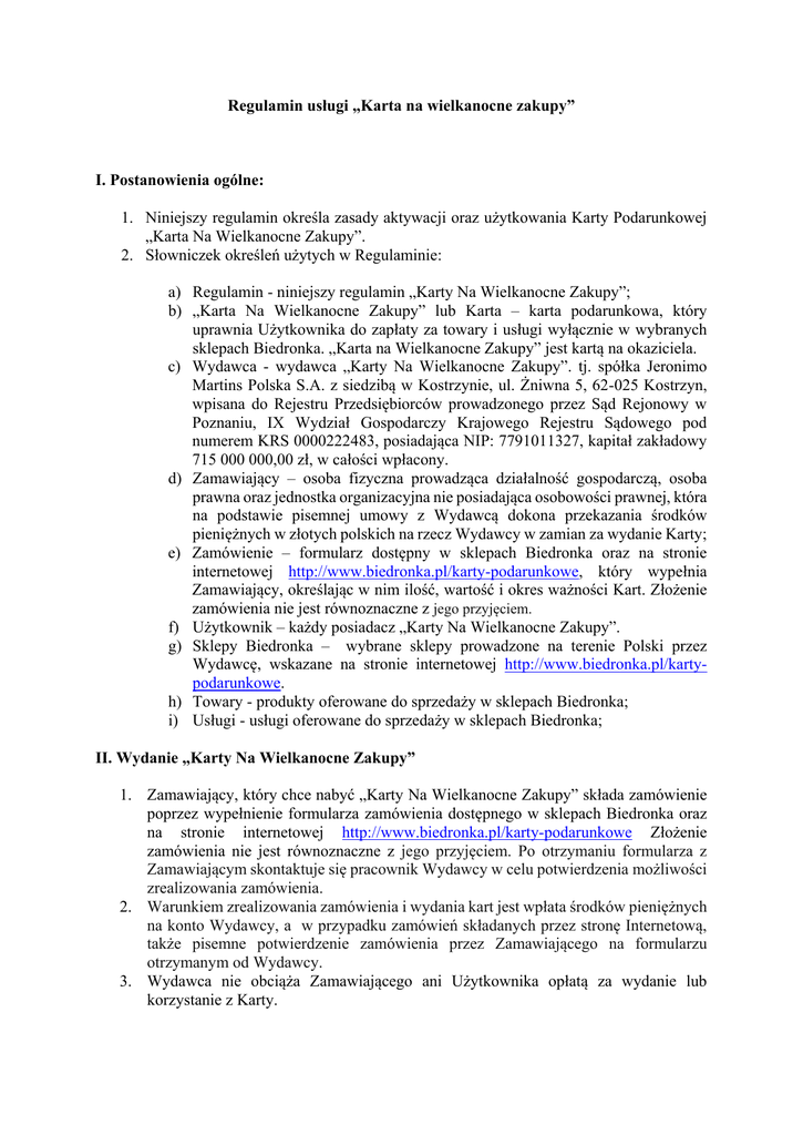 Regulamin usługi „Karta na wielkanocne zakupy” I. Postanowienia ogólne: 1. Niniejszy regulamin określa zasady aktywacji oraz użytkowania Karty Podarunkowej „Karta Na Wielkanocne Zakupy”. 2. Słowniczek określeń użytych w Regulaminie: a) Regulamin - niniejszy regulamin „Karty Na Wielkanocne Zakupy”; b) „Karta Na Wielkanocne Zakupy” lub Karta – karta podarunkowa, który uprawnia Użytkownika do zapłaty za towary i usługi wyłącznie w wybranych sklepach Biedronka. „Karta na Wielkanocne Zakupy” jest kartą na okaziciela. c) Wydawca - wydawca „Karty Na Wielkanocne Zakupy”. tj. spółka Jeronimo Martins Polska S.A. z siedzibą w Kostrzynie, ul. Żniwna 5, 62-025 Kostrzyn, wpisana do Rejestru Przedsiębiorców prowadzonego przez Sąd Rejonowy w Poznaniu, IX Wydział Gospodarczy Krajowego Rejestru Sądowego pod numerem KRS 0000222483, posiadająca NIP: 7791011327, kapitał zakładowy 715 000 000,00 zł, w całości wpłacony. d) Zamawiający – osoba fizyczna prowadząca działalność gospodarczą, osoba prawna oraz jednostka organizacyjna nie posiadająca osobowości prawnej, która na podstawie pisemnej umowy z Wydawcą dokona przekazania środków pieniężnych w złotych polskich na rzecz Wydawcy w zamian za wydanie Karty; e) Zamówienie – formularz dostępny w sklepach Biedronka oraz na stronie internetowej http://www.biedronka.pl/karty-podarunkowe, który wypełnia Zamawiający, określając w nim ilość, wartość i okres ważności Kart. Złożenie zamówienia nie jest równoznaczne z jego przyjęciem. f) Użytkownik – każdy posiadacz „Karty Na Wielkanocne Zakupy”. g) Sklepy Biedronka – wybrane sklepy prowadzone na terenie Polski przez Wydawcę, wskazane na stronie internetowej http://www.biedronka.pl/kartypodarunkowe. h) Towary - produkty oferowane do sprzedaży w sklepach Biedronka; i) Usługi - usługi oferowane do sprzedaży w sklepach Biedronka; II. Wydanie „Karty Na Wielkanocne Zakupy” 1. Zamawiający, który chce nabyć „Karty Na Wielkanocne Zakupy” składa zamówienie poprzez wypełnienie formularza zamówienia dostępnego w sklepach Biedronka oraz na stronie internetowej http://www.biedronka.pl/karty-podarunkowe Złożenie zamówienia nie jest równoznaczne z jego przyjęciem. Po otrzymaniu formularza z Zamawiającym skontaktuje się pracownik Wydawcy w celu potwierdzenia możliwości zrealizowania zamówienia. 2. Warunkiem zrealizowania zamówienia i wydania kart jest wpłata środków pieniężnych na konto Wydawcy, a w przypadku zamówień składanych przez stronę Internetową, także pisemne potwierdzenie zamówienia przez Zamawiającego na formularzu otrzymanym od Wydawcy. 3. Wydawca nie obciąża Zamawiającego ani Użytkownika opłatą za wydanie lub korzystanie z Karty. 4. Wydane karty są nieaktywne i mogą być używane po dokonaniu jej aktywacji przez Zamawiającego. 5. Karta będzie ważna w terminie ustalonym z Zamawiającym liczonym od dnia jej aktywacji. Aktywacja Karty jest dokonywana przez pracownika Wydawcy na wniosek złożony przez Zamawiającego pod numerem telefonu lub adresem e-mailowym wskazanym w umowie. Po upływie w/w terminu Karta traci ważność. 6. W przypadku gdy pomimo upływu terminu ważności Karty środki pieniężne pozostaną na niej niewykorzystane, Zamawiający ani Użytkownik nie ma prawa żądać od Wydawcy zwrotu tychże środków. 7. Warunkiem wydania i używania karty jest zapoznanie się z regulaminem przez Zamawiającego i Użytkownika. 8. W wypadku gdy Karta zostanie uszkodzona w stopniu uniemożliwiającym jej prawidłową eksploatację, Użytkownik ma możliwość odpłatnego otrzymania duplikatu karty wraz ze środkami na niej zawartymi. By otrzymać duplikat Użytkownik powinien złożyć wniosek do Wydawcy o wydanie duplikatu. Wydanie duplikatu nastąpi pod warunkiem zwrotu uszkodzonej karty. Wydanie duplikatu nie ma wpływu na termin ważności karty. Koszt wydania duplikatu wynosi 30zł. Wydawca odmówi wydania duplikatu, jeśli uszkodzenie karty uniemożliwia sprawdzenie stanu środków na karcie. III. Zasilenie „Karty Na Wielkanocne Zakupy” 1. 2. 3. 4. Minimalna kwota, jaką może być zasilona „Karta Na Wielkanocne Zakupy” wynosi 10 złoty, zaś maksymalna kwota, jaką może być zasilona „Karta Na Wielkanocne Zakupy” wynosi 5 000 złotych. Kwota przekazanych środków pieniężnych stanowi wartość nominalną Karty. Karta Na Wielkanocne Zakupy jest jednorazowa i nie może być ponowne doładowywana. Środki na karcie uprawniają Użytkownika do zapłaty za towary i usługi w wybranych sklepach Biedronka w terminie ważności karty i nie podlegają oprocentowaniu, Środki wpłacone przez Zamawiającego nie podlegają zwrotowi na rzecz Zamawiającego lub Użytkownika, w szczególności „Karta Na Wielkanocne Zakupy” nie podlega zwrotowi, nie podlega wymianie na gotówkę w całości lub w części oraz nie może zostać wymieniona przez Wydawcę na inną kartę tego typu. Nie ma możliwości dokonywania wypłat gotówki przy użyciu Karty. IV. Zasady użytkowania „Karty Na Wielkanocne Zakupy” 1. Do realizacji w sklepie Biedronka będą przyjmowane wyłącznie „Karty Na Wielkanocne Zakupy” aktywne i nieuszkodzone, posiadające wszystkie zabezpieczenia chroniące przed ich sfałszowaniem. 2. Użytkownik może posługiwać się „Kartą Na Wielkanocne Zakupy” wielokrotnie do wyczerpania limitu środków przypisanego do Karty, wynikającego z wpłaty Zamawiającego w ramach doładowania „Karty Na Wielkanocne Zakupy”. 3. Płatność Kartą następuje poprzez przedstawienie do realizacji Karty w kasie sklepu Biedronka przez Użytkownika. W momencie nabycia przez Użytkownika towarów lub usług, saldo Karty zostanie pomniejszone o kwotę ceny należnej za sprzedane towary lub usługi. 4. Przy realizacji Karty, Użytkownikowi nie przysługuje prawo otrzymania reszty, gdy wartość otrzymywanego towaru lub świadczonej usługi jest niższa n