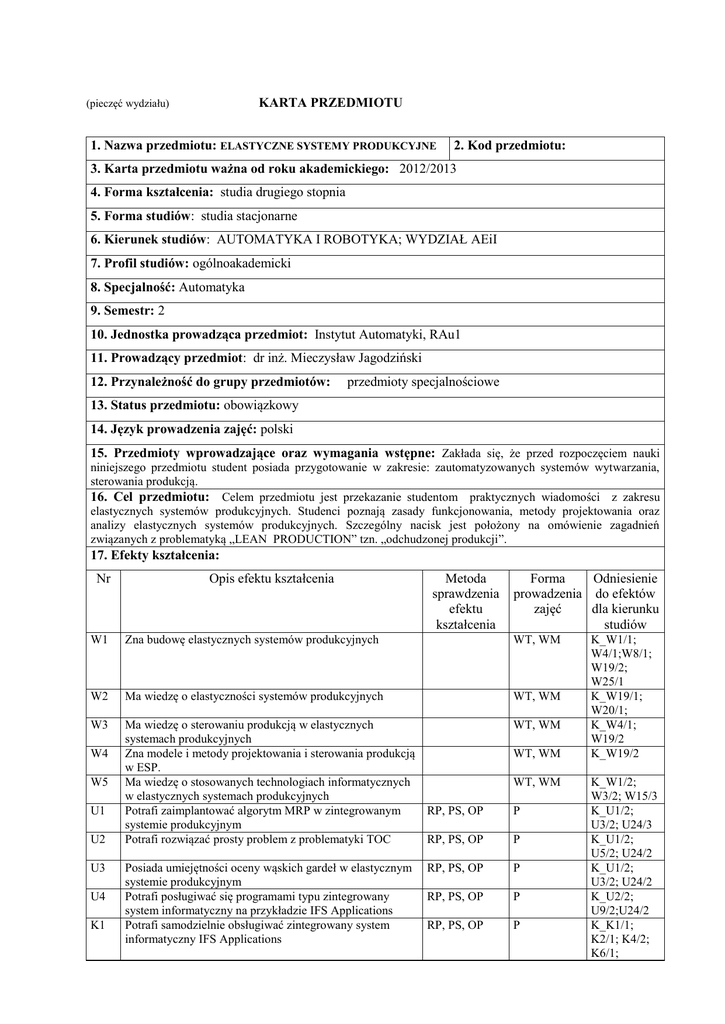 (pieczęć wydziału) KARTA PRZEDMIOTU 1. Nazwa przedmiotu: ELASTYCZNE SYSTEMY PRODUKCYJNE 2. Kod przedmiotu: 3. Karta przedmiotu ważna od roku akademickiego: 2012/2013 4. Forma kształcenia: studia drugiego stopnia 5. Forma studiów: studia stacjonarne 6. Kierunek studiów: AUTOMATYKA I ROBOTYKA; WYDZIAŁ AEiI 7. Profil studiów: ogólnoakademicki 8. Specjalność: Automatyka 9. Semestr: 2 10. Jednostka prowadząca przedmiot: Instytut Automatyki, RAu1 11. Prowadzący przedmiot: dr inż. Mieczysław Jagodziński 12. Przynależność do grupy przedmiotów: przedmioty specjalnościowe 13. Status przedmiotu: obowiązkowy 14. Język prowadzenia zajęć: polski 15. Przedmioty wprowadzające oraz wymagania wstępne: Zakłada się, że przed rozpoczęciem nauki niniejszego przedmiotu student posiada przygotowanie w zakresie: zautomatyzowanych systemów wytwarzania, sterowania produkcją. 16. Cel przedmiotu: Celem przedmiotu jest przekazanie studentom praktycznych wiadomości z zakresu elastycznych systemów produkcyjnych. Studenci poznają zasady funkcjonowania, metody projektowania oraz analizy elastycznych systemów produkcyjnych. Szczególny nacisk jest położony na omówienie zagadnień związanych z problematyką „LEAN PRODUCTION” tzn. „odchudzonej produkcji”. 17. Efekty kształcenia: Nr Opis efektu kształcenia Metoda sprawdzenia efektu kształcenia Forma Odniesienie prowadzenia do efektów zajęć dla kierunku studiów W1 Zna budowę elastycznych systemów produkcyjnych WT, WM W2 Ma wiedzę o elastyczności systemów produkcyjnych WT, WM W3 Ma wiedzę o sterowaniu produkcją w elastycznych systemach produkcyjnych Zna modele i metody projektowania i sterowania produkcją w ESP. Ma wiedzę o stosowanych technologiach informatycznych w elastycznych systemach produkcyjnych Potrafi zaimplantować algorytm MRP w zintegrowanym RP, PS, OP systemie produkcyjnym Potrafi rozwiązać prosty problem z problematyki TOC RP, PS, OP WT, WM Posiada umiejętności oceny wąskich gardeł w elastycznym systemie produkcyjnym Potrafi posługiwać się programami typu zintegrowany system informatyczny na przykładzie IFS Applications Potrafi samodzielnie obsługiwać zintegrowany system informatyczny IFS Applications RP, PS, OP P RP, PS, OP P RP, PS, OP P W4 W5 U1 U2 U3 U4 K1 WT, WM WT, WM P P K_W1/1; W4/1;W8/1; W19/2; W25/1 K_W19/1; W20/1; K_W4/1; W19/2 K_W19/2 K_W1/2; W3/2; W15/3 K_U1/2; U3/2; U24/3 K_U1/2; U5/2; U24/2 K_U1/2; U3/2; U24/2 K_U2/2; U9/2;U24/2 K_K1/1; K2/1; K4/2; K6/1; Potrafi zaprezentować i obronić projekt elastycznego systemu produkcyjnego 18. Formy zajęć dydaktycznych i ich wymiar (liczba godzin) K2 W. : 15 RP, PS, OP P K_K6/2; K7/2 P.: 15 19. Treści kształcenia: Wykład Elastyczność systemów produkcyjnych. Czynniki wpływające na elastyczność systemów produkcyjnych. Elastyczność systemów produkcyjnych. Elastyczna automatyzacja produkcji. Budowa elastycznych systemów produkcyjnych. Ogólny model ESP. Zakres technik wytwarzania stosowanych w ESP. Roboty przemysłowe i stanowiska montażowe. Podsystem przepływu strumieni materiałowych w ESP. Funkcjonowanie elastycznych systemów produkcyjnych. Struktura funkcjonalna ESP. System sterowania produkcją w ESP. Podsystemy: przepływu materiałów, przepływu narzędzi, kontroli i diagnostyki. Sterowanie produkcją w ESP. Zakres systemu sterowania produkcją w ESP. Hierarchia sterowania produkcją w ESP. Współpraca systemu sterowania produkcją z nadrzędnym systemem planowania. Sterowanie produkcją a współpraca z otoczeniem. Dekompozycja planowania wyrobów w ESP. Metody planowania produkcji w ESP. Elastyczność i niezawodność w budowie systemów sterowania przebiegiem produkcji w ESP. Architektura systemów sterowania produkcją w ESP. Oprogramowanie systemów sterowania przepływem produkcji ESP. Analiza celowości wdrażania ESP. Strategiczne znaczenie ESP dla przedsiębiorstw. Cele wdrażania ESP. Warunki efektywności wdrażania ESP. Modele i metody projektowania i sterowania produkcją w ESP. Modele sieci masowej obsługi. Modele sieci Petriego. Modele symulacyjne. Modele programowania matematycznego. Przygotowanie i obsługa produkcji dla ESP. Techniczne przygotowanie produkcji dla ESP. Charakterystyka systemów CAD/CAM. Znaczenie integracji CAD/CAM dla efektywności funkcjonowania ESP. Wpływ elastycznej produkcji na zarządzanie i organizację pracy w przedsiębiorstwie. Treść pracy w elastycznych systemach produkcyjnych. Organizacja pracy w ESP. Problemy wdrażania elastycznych systemów produkcyjnych. Niektóre problemy eksploatacji ESP związane z instalacją i rozruchem. Problemy integracji komputerowej w ESP. Technologie informatyczne w elastycznych systemów produkcji. Znaczenie technologii informatycznej w elastycznym systemie produkcji. System informacyjny. Wymogi dla technologii informatycznych ESP. Theory of Constraints i Lean Manufacturing. Podstawy TOC. Podstawy Lean. TOC i Lean – obszary zgodności. Różnice – od wzorców do praktyki. Mapowanie strumienia wartości. Czym jest mapowanie strumienia wartości. Przepływ materiału i informacji. Wybór rodziny produktów. Mendżer strumienia wartości. Wykorzystanie metody mapowania wartości. Wyszczuplanie strumienia wartości. Nadprodukcja. Charakterystyka szczupłego strumienia wartości Zajęcia Projektowe Każdy student w ramach projektu opracowuje koncepcję budowy elastycznego systemu produkcyjnego. Opracowuje strukturę informacuyjną technicznego przygotowania produkcji w zaproponowanym elastycznym systemie produkcyjnym. Projekt kończy się praktyczną implementacją opracowanego case elastycznego systemu produkcyjnego w zintegrowanym systemie informatycznm IFS Applications. 20. Egzamin: nie 21. Literatura podstawowa: 1. T. Sawik: Optymalizacja dyskretna w elastycznych systemach produkcyjnych. WNT, 1992. 2. S. Lis, K.Santarek, S.Strzelczak: Organizacja elastycznych systemów produkcyjnych. PWN, 1994. 3. J. Womack, T.Jones: Odch