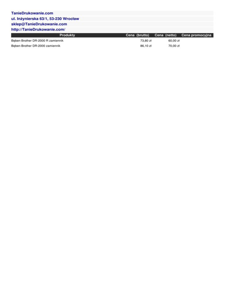 TanieDrukowanie.com ul. Inżynierska 63/1, 53-230 Wrocław [email protected] http://TanieDrukowanie.com/ Produkty Cena (brutto) Cena (netto) Bęben Brother DR-2000 R zamiennik 73,80 zł 60,00 zł Bęben Brother DR-2000 zamiennik 86,10 zł 70,00 zł Cena promocyjna