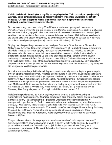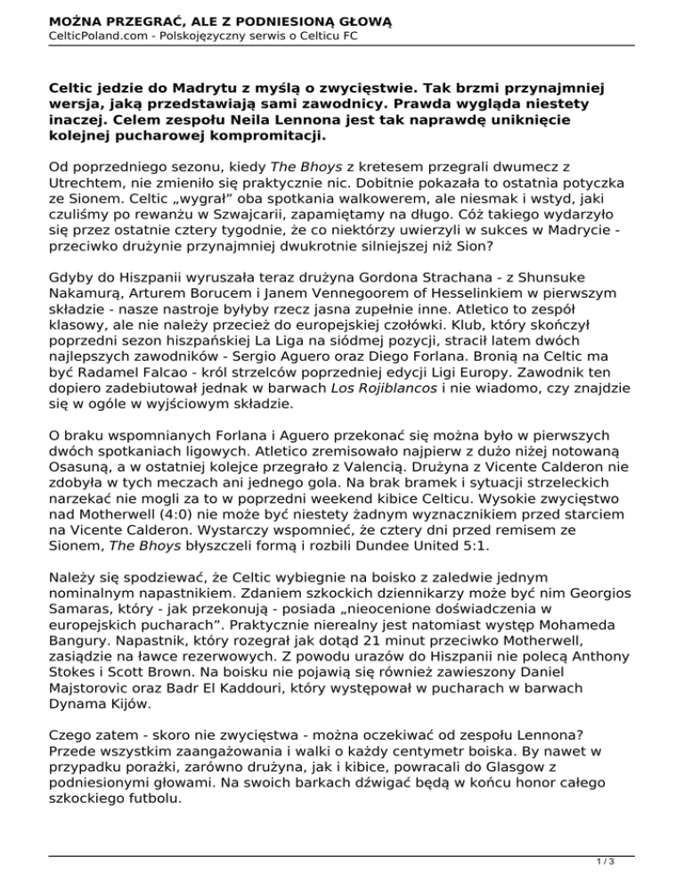 MOŻNA PRZEGRAĆ, ALE Z PODNIESIONĄ GŁOWĄ CelticPoland.com - Polskojęzyczny serwis o Celticu FC Celtic jedzie do Madrytu z myślą o zwycięstwie. Tak brzmi przynajmniej wersja, jaką przedstawiają sami zawodnicy. Prawda wygląda niestety inaczej. Celem zespołu Neila Lennona jest tak naprawdę uniknięcie kolejnej pucharowej kompromitacji. Od poprzedniego sezonu, kiedy The Bhoys z kretesem przegrali dwumecz z Utrechtem, nie zmieniło się praktycznie nic. Dobitnie pokazała to ostatnia potyczka ze Sionem. Celtic „wygrał” oba spotkania walkowerem, ale niesmak i wstyd, jaki czuliśmy po rewanżu w Szwajcarii, zapamiętamy na długo. Cóż takiego wydarzyło się przez ostatnie cztery tygodnie, że co niektórzy uwierzyli w sukces w Madrycie przeciwko drużynie przynajmniej dwukrotnie silniejszej niż Sion? Gdyby do Hiszpanii wyruszała teraz drużyna Gordona Strachana - z Shunsuke Nakamurą, Arturem Borucem i Janem Vennegoorem of Hesselinkiem w pierwszym składzie - nasze nastroje byłyby rzecz jasna zupełnie inne. Atletico to zespół klasowy, ale nie należy przecież do europejskiej czołówki. Klub, który skończył poprzedni sezon hiszpańskiej La Liga na siódmej pozycji, stracił latem dwóch najlepszych zawodników - Sergio Aguero oraz Diego Forlana. Bronią na Celtic ma być Radamel Falcao - król strzelców poprzedniej edycji Ligi Europy. Zawodnik ten dopiero zadebiutował jednak w barwach Los Rojiblancos i nie wiadomo, czy znajdzie się w ogóle w wyjściowym składzie. O braku wspomnianych Forlana i Aguero przekonać się można było w pierwszych dwóch spotkaniach ligowych. Atletico zremisowało najpierw z dużo niżej notowaną Osasuną, a w ostatniej kolejce przegrało z Valencią. Drużyna z Vicente Calderon nie zdobyła w tych meczach ani jednego gola. Na brak bramek i sytuacji strzeleckich narzekać nie mogli za to w poprzedni weekend kibice Celticu. Wysokie zwycięstwo nad Motherwell (4:0) nie może być niestety żadnym wyznacznikiem przed starciem na Vicente Calderon. Wystarczy wspomnieć, że cztery dni przed remisem ze Sionem, The Bhoys błyszczeli formą i rozbili Dundee United 5:1. Należy się spodziewać, że Celtic wybiegnie na boisko z zaledwie jednym nominalnym napastnikiem. Zdaniem szkockich dziennikarzy może być nim Georgios Samaras, który - jak przekonują - posiada „nieocenione doświadczenia w europejskich pucharach”. Praktycznie nierealny jest natomiast występ Mohameda Bangury. Napastnik, który rozegrał jak dotąd 21 minut przeciwko Motherwell, zasiądzie na ławce rezerwowych. Z powodu urazów do Hiszpanii nie polecą Anthony Stokes i Scott Brown. Na boisku nie pojawią się również zawieszony Daniel Majstorovic oraz Badr El Kaddouri, który występował w pucharach w barwach Dynama Kijów. Czego zatem - skoro nie zwycięstwa - można oczekiwać od zespołu Lennona? Przede wszystkim zaangażowania i walki o każdy centymetr boiska. By nawet w przypadku porażki, zarówno drużyna, jak i kibice, powracali do Glasgow z podniesionymi głowami. Na swoich barkach dźwigać będą w końcu honor całego szkockiego futbolu. 1/3 MOŻNA PRZEGRAĆ, ALE Z PODNIESIONĄ GŁOWĄ CelticPoland.com - Polskojęzyczny serwis o Celticu FC ATLETICO MADRYT - CELTIC Europa League - 1. kolejka fazy grupowej Miejsce: Vicente Calderon, Madryt Data: Czwartek, 15 września Początek: 21:05 Sędzia: Peter Rasmussen (Dania) Transmisja TV: Polsat Sport Prawdopodobny skład: Forster; Matthews, Loovens, K. Wilson, Mulgrew; Forrest, Wanyama, Ki, Kayal, Ledley; Hooper SYTUACJA KADROWA: CELTIC: Kontuzje: Emilio Izaguirre, Cha Du-Ri, Scott Brown, Anthony Stokes Zawieszenia: Daniel Majstorovic (1 mecz, czerwona kartka) ATLETICO: Kontuzje: brak danych Zawieszenia: brak OSTATNIE MECZE OBU KLUBÓW: CELTIC: 10/09/11 28/08/11 25/08/11 21/08/11 18/08/11 13/08/11 07/08/11 Celtic – Motherwell 4:0 St. Mirren - Celtic 0:2 Sion - Celtic 3:1 (LE)* Celtic - St. Johnstone 0:1 Celtic - Sion 0:0 (LE)* Celtic - Dundee United 5:1 Aberdeen - Celtic 0:1 * walkower dla Celticu (3:0) ATLETICO: 10/09/11 Valencia - Atletico 1:0 28/08/11 Atletico - Osasuna 0:0 25/08/11 Guimaraes - Atletico 0:4 (LE) 18/08/11 Atletico - Guimaraes 2:0 (LE) 12/08/11 Recreativo - Atletico 1:2 (tow.) BEZPOŚREDNIE STARCIA: 18/09/85 02/10/85 24/04/74 10/04/74 Atletico - Celtic Celtic - Atletico Atletico - Celtic Celtic - Atletico 1:1 1:2 2:0 0:0 (P. (P. (P. (P. Zdobywców Pucharów) Zdobywców Pucharów) Europy, 1/2 finału) Europy, 1/2 finału) 2/3 MOŻNA PRZEGRAĆ, ALE Z PODNIESIONĄ GŁOWĄ CelticPoland.com - Polskojęzyczny serwis o Celticu FC Mick WACHOWSKI Autor: Mick Wachowski 3/3 Powered by TCPDF (www.tcpdf.org)
