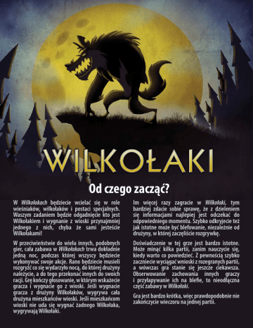 Od czego zacząć? W Wilkołakach będziecie wcielać się w role wieśniaków, wilkołaków i postaci specjalnych. Waszym zadaniem będzie odgadnięcie kto jest Wilkołakiem i wygnanie z wioski przynajmniej jednego z nich, chyba że sami jesteście Wilkołakami! W przeciwieństwie do wielu innych, podobnych gier, cała zabawa w Wilkołakach trwa dokładnie jedną noc, podczas której wszyscy będziecie wykonywać swoje akcje. Rano będziecie musieli rozgryźć co się wydarzyło nocą, do której drużyny należycie, a do tego przekonać innych do swoich racji. Grę kończy głosowanie, w którym wskażecie gracza i wygnacie go z wioski. Jeśli wygnacie gracza z drużyny Wilkołaków, wygrywa cała drużyna mieszkańców wioski. Jeśli mieszkańcom wioski nie uda się wygnać żadnego Wilkołaka, wygrywają Wilkołaki. Im więcej razy zagracie w Wilkołaki, tym bardziej zdacie sobie sprawę, że z dzieleniem się informacjami najlepiej jest odczekać do odpowiedniego momentu. Szybko odkryjecie też jak istotne może być blefowanie, niezależnie od drużyny, w której zaczęliście rozgrywkę. Doświadczenie w tej grze jest bardzo istotne. Może minąć kilka partii, zanim nauczycie się, kiedy warto co powiedzieć. Z pewnością szybko zaczniecie wyciągać wnioski z rozegranych partii, a wówczas gra stanie się jeszcze ciekawsza. Obserwowanie zachowania innych graczy i przyłapywanie ich na blefie, to nieodłączna część zabawy w Wilkołaki. Gra jest bardzo krótka, więc prawdopodobnie nie zakończycie wieczoru na jednej partii. Wybierzcie jednego gracza - będzie narratorem. Jego zadaniem będzie wzywanie kolejnych postaci do przebudzenia. Po każdym wezwaniu, narrator liczy do dziesięciu, dając przebudzonym czas na wykonanie akcji. Dla kart opisanych na poprzedniej stronie, użyjcie poniższego skryptu: PIERWSZA GRA Przygotowanie gry zmienia się w zależności od liczby graczy (3-10). Pierwszą rozgrywkę polecamy przeprowadzić w 3 do 5 osób. Łatwiej jest wtedy przyswoić sobie sens i mechanikę gry. Jeśli macie przy stole więcej graczy, nic straconego. Gra jest szybka, a pozostali uczestnicy będą mieć frajdę z oglądania! W pierwszej grze wykorzystajcie następujące karty postaci: 3 graczy 4 graczy 5 graczy zestaw dla zestaw dla 2x Wilkołak 3 graczy 3 graczy 1x Jasnowidz 1x Złodziej +1x Wieśniak +2x Wieśniak 1x Intrygant 1x Wieśniak Kart zawsze powinno być o trzy więcej od liczby graczy. Potasujcie je i rozdajcie każdemu po jednej. Pozostałe 3 połóżcie zakryte na środku stołu, a obok nich połóżcie żetony odpowiadające kartom użytym w rozgrywce. Każdy zapoznaje się ze swoją kartą tak, aby nie ujawnić jej innym, a następnie odkłada ją zakrytą przed sobą, blisko środka stołu. Pozostali powinni mieć do niej swobodny dostęp. Poniżej przykład rozłożenia gry dla 5 graczy: AM ONUW cardback.pdf 1 9/11/13 8:08 AM 8: 08 C 11 /1 3 M 9/ Y 1 CM C M .p df MY UW ca rd UW CMY K .p K ON ck ba CY rd MY ca CM ba ck ON Y CY CMY df 1 3 /1 11 9/ 8:08 AM ONUW cardback.pdf 1 9/11/13 8:08 AM ONUW cardback.pdf 1 9/11/13 8:08 AM CMY CY MY CM Y M C 9/11/13 AM 1 08 8: ONUW cardback.pdf C C K C M M Y M Y CM Y CM MY CM MY MY CY CY CY CMY CMY CMY K K K 8 3 8:0 AM 1/1 1 ck. back W 9/11 ONU W K K SNO ZŁ OŁ A K WIL C M Y EJ JA IDZ TR YGAN T IN W ILK 6 5 K I W I E S´ N I A S´ N I A 2 W IE C M Y CM MY CY dba car AM W 8:08 O D ZI 2 /13 NIAK 1 E S´ .pdf CMY 7 K 9/1 pdf card OŁ K A ONUW CM MY CY CMY K NOC Gra zaczyna się fazą nocy, podczas której większość postaci będzie wzywana do przebudzenia się i wykonania akcji. Niektóre postaci (np. Wieśniak, Garbarz czy Myśliwy) nigdy nie budzą się w nocy. Narrator : „Wszyscy, zamknijcie oczy.” Wszyscy gracze, łącznie z narratorem, zamykają oczy. „Wilkołaki, przebudźcie się i poznajcie się.” Wilkołaki otwierają oczy i szukają innych Wilkołaków – graczy z otwartymi oczami (może nie być żadnych innych!). „Wilkołaki, zamknijcie oczy. Jasnowidzu, przebudź się. Możesz sprawdzić kartę innego gracza albo dwie karty ze środka stołu.” Jasnowidz otwiera oczy i sprawdza kartę innego gracza albo dwie karty na środku stołu. „Jasnowidzu, zamknij oczy. Złodzieju, przebudź się. Możesz zamienić miejscami swoją kartę z kartą innego gracza, a potem podejrzeć swoją nową kartę.” Złodziej otwiera oczy i może dyskretnie zamienić miejscami swoją kartę z kartą innego gracza, a następnie ją sprawdzić. „Złodzieju, zamknij oczy. Intrygancie, przebudź się. Możesz zamienić miejscami karty dwóch innych graczy.” Intrygant otwiera oczy i może dyskretnie zamienić miejscami karty dwóch innych graczy, bez sprawdzania kim są. „Intrygancie, zamknij oczy.” Narrator, z zamkniętymi oczami, delikatnie porusza każdą kartą leżącą na stole (tak, żeby gracze nie mogli rozpoznać, czy ich karta została podmieniona lub sprawdzona). „Wszyscy, otwórzcie oczy!” Wszyscy otwierają oczy i rozglądają się podejrzliwie. W nocy, gracze z zamkniętymi oczami nie mogą robić nic, aby komunikować się z aktywnymi graczami (którzy mają otwarte oczy). DZIEŃ Po zakończeniu fazy nocy następuje dzień. Przedyskutujcie teraz kto według was jest Wilkołakiem. Za dnia możecie mówić cokolwiek, ale nie wolno wam oglądać, ani pokazywać innym swoich kart. Jeśli jesteś Wilkołakiem, możesz kłamać na temat swojej tożsamości, żeby zmylić pozostałych graczy i uniknąć wygnania. Niektóre akcje pozwalają na zamianę kart miejscami. Może się więc zdarzyć, że będziesz przekonany o swojej tożsamości, podczas gdy w nocy ktoś podmienił twoją kartę na inną. Po fazie nocy twoją postacią jest ta, która aktualnie znajduje się przed tobą. Może to być inna karta od tej, którą wylosowałeś na początku. Nikt nie może podglądać kart postaci po fazie nocy! Po kilku minutach dyskusji przeprowadźcie głosowanie: „Wszyscy! Trzy, dwa, jeden, GŁOSUJ
