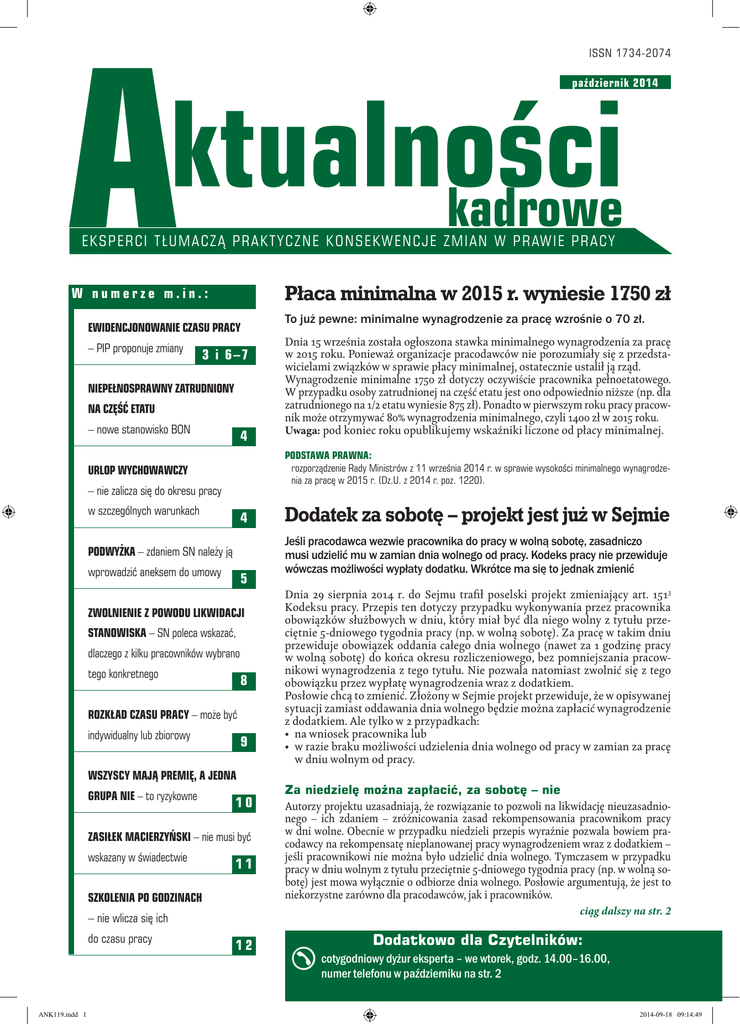 A issn 1734-2074 ktualności kadrowe październik 201412 E k s p er c i t ł um a c z ą p r a k t y c z n e k o n s e k w e n c j e z m i a n w p r aw i e p r a c y Płaca minimalna w 2015 r. wyniesie 1750 zł W numerze m.in.: Ewidencjonowanie czasu pracy – PIP proponuje zmiany 3 i 6–7 Niepełnosprawny zatrudniony na część etatu – nowe stanowisko BON 4 – nie zalicza się do okresu pracy w szczególnych warunkach 4 Podwyżka – zdaniem SN należy ją wprowadzić aneksem do umowy 5 Zwolnienie z powodu likwidacji stanowiska – SN poleca wskazać, dlaczego z kilku pracowników wybrano tego konkretnego 8 Rozkład czasu pracy – może być indywidualny lub zbiorowy 9 Wszyscy mają premię, a jedna 10 Zasiłek macierzyński – nie musi być wskazany w świadectwie 11 Szkolenia po godzinach – nie wlicza się ich do czasu pracy ANK119.indd 1 Dnia 15 września została ogłoszona stawka minimalnego wynagrodzenia za pracę w 2015 roku. Ponieważ organizacje pracodawców nie porozumiały się z przedstawicielami związków w sprawie płacy minimalnej, ostatecznie ustalił ją rząd. Wynagrodzenie minimalne 1750 zł dotyczy oczywiście pracownika pełnoetatowego. W przypadku osoby zatrudnionej na część etatu jest ono odpowiednio niższe (np. dla zatrudnionego na 1/2 etatu wyniesie 875 zł). Ponadto w pierwszym roku pracy pracownik może otrzymywać 80% wynagrodzenia minimalnego, czyli 1400 zł w 2015 roku. Uwaga: pod koniec roku opublikujemy wskaźniki liczone od płacy minimalnej. Podstawa prawna: rozporządzenie Rady Ministrów z 11 września 2014 r. w sprawie wysokości minimalnego wynagrodzenia za pracę w 2015 r. (Dz.U. z 2014 r. poz. 1220). Urlop wychowawczy grupa nie – to ryzykowne To już pewne: minimalne wynagrodzenie za pracę wzrośnie o 70 zł. 12 Dodatek za sobotę – projekt jest już w Sejmie Jeśli pracodawca wezwie pracownika do pracy w wolną sobotę, zasadniczo musi udzielić mu w zamian dnia wolnego od pracy. Kodeks pracy nie przewiduje wówczas możliwości wypłaty dodatku. Wkrótce ma się to jednak zmienić Dnia 29 sierpnia 2014 r. do Sejmu trafił poselski projekt zmieniający art. 1513 Kodeksu pracy. Przepis ten dotyczy przypadku wykonywania przez pracownika obowiązków służbowych w dniu, który miał być dla niego wolny z tytułu przeciętnie 5-dniowego tygodnia pracy (np. w wolną sobotę). Za pracę w takim dniu przewiduje obowiązek oddania całego dnia wolnego (nawet za 1 godzinę pracy w wolną sobotę) do końca okresu rozliczeniowego, bez pomniejszania pracownikowi wynagrodzenia z tego tytułu. Nie pozwala natomiast zwolnić się z tego obowiązku przez wypłatę wynagrodzenia wraz z dodatkiem. Posłowie chcą to zmienić. Złożony w Sejmie projekt przewiduje, że w opisywanej sytuacji zamiast oddawania dnia wolnego będzie można zapłacić wynagrodzenie z dodatkiem. Ale tylko w 2 przypadkach: • na wniosek pracownika lub • w razie braku możliwości udzielenia dnia wolnego od pracy w zamian za pracę w dniu wolnym od pracy. Za niedzielę można zapłacić, za sobotę – nie Autorzy projektu uzasadniają, że rozwiązanie to pozwoli na likwidację nieuzasadnionego – ich zdaniem – zróżnicowania zasad rekompensowania pracownikom pracy w dni wolne. Obecnie w przypadku niedzieli przepis wyraźnie pozwala bowiem pracodawcy na rekompensatę nieplanowanej pracy wynagrodzeniem wraz z dodatkiem – jeśli pracownikowi nie można było udzielić dnia wolnego. Tymczasem w przypadku pracy w dniu wolnym z tytułu przeciętnie 5-dniowego tygodnia pracy (np. w wolną sobotę) jest mowa wyłącznie o odbiorze dnia wolnego. Posłowie argumentują, że jest to niekorzystne zarówno dla pracodawców, jak i pracowników. ciąg dalszy na str. 2 Dodatkowo dla Czytelników: cotygodniowy dyżur eksperta – we wtorek, godz. 14.00–16.00, numer telefonu w październiku na str. 2 2014-09-18 09:14:49 Przegląd prawa w skrócie d y ż u r EKSPERTA : Wtorek, 14.00–16.00, Nr tel. w październiku: Dodatek za sobotę – projekt jest już w Sejmie OD REDAKCJI ciąg dalszy ze str. 1 Ewidencję czasu pracy można częściowo zautomatyzować Pracodawca musi ewidencjonować czas pracy wszystkim pracownikom (nawet kierownikom – choć w sposób nieco uproszczony). Bywa z tym sporo pracy, nic więc dziwnego, że pracodawcy próbują uprościć ewidencjonowanie – np. prowadząc elektroniczną ewidencję, która przynajmniej częściowo wypełnia się automatycznie. Nie jest to zakazane, ale trzeba pamiętać, by ewidencja zawierała wszystkie niezbędne dane i była prowadzona na bieżąco (str. 6–7). Godzin rozpoczęcia i zakończenia pracy na razie nie trzeba odnotowywać. Ale może się to zmienić (str. 3). Szymon Sokolik redaktor prowadzący, prawnik, specjalista z zakresu prawa pracy [email protected] Aktualności kadrowe Wydawca: Agnieszka Gorczyca Redaktor prowadzący: Szymon Sokolik Koordynator produkcji: Mariusz Jezierski Skład i łamanie: 6AN Studio Druk: Paper&Tinta ISSN: 1734-2074 Nakład: 5000 egz. Wiedza i Praktyka sp. z o.o. 03-918 Warszawa, ul. Łotewska 9a tel.: 22 518 29 29, faks: 22 617 60 10 NIP: 526-19-92-256 Numer KRS: 0000098264 – Sąd Rejonowy dla m.st. Warszawy, Sąd Gospodarczy XIII Wydział Gospodarczy Rejestrowy. Wysokość kapitału zakładowego: 200.000 zł Copyright by Wiedza i Praktyka sp. z o.o. Warszawa 2014 Wszelkie prawa do niniejszej publikacji, w tym do jej tytułu oraz do treści zawartych w zamieszczonych w niej artykułach, podlegają ochronie prawnej przewidzianej w szczególności prawem autorskim. Ich przedruk oraz rozpowszechnianie bez wiedzy i zgody Redakcji są zabronione. Zakaz ten nie dotyczy cytowania ww. materiałów w granicach dozwolonego użytku, z powołaniem się na źródło. Wszelkie materiały zawarte w niniejszej publikacji mają charakter wyłącznie popularyzacyjno-informacyjny i nie mogą być traktowane w sposób prawnie wiążący pomiędzy Czytelnikiem a Wydawcą lub Redakcją. Redakcja do