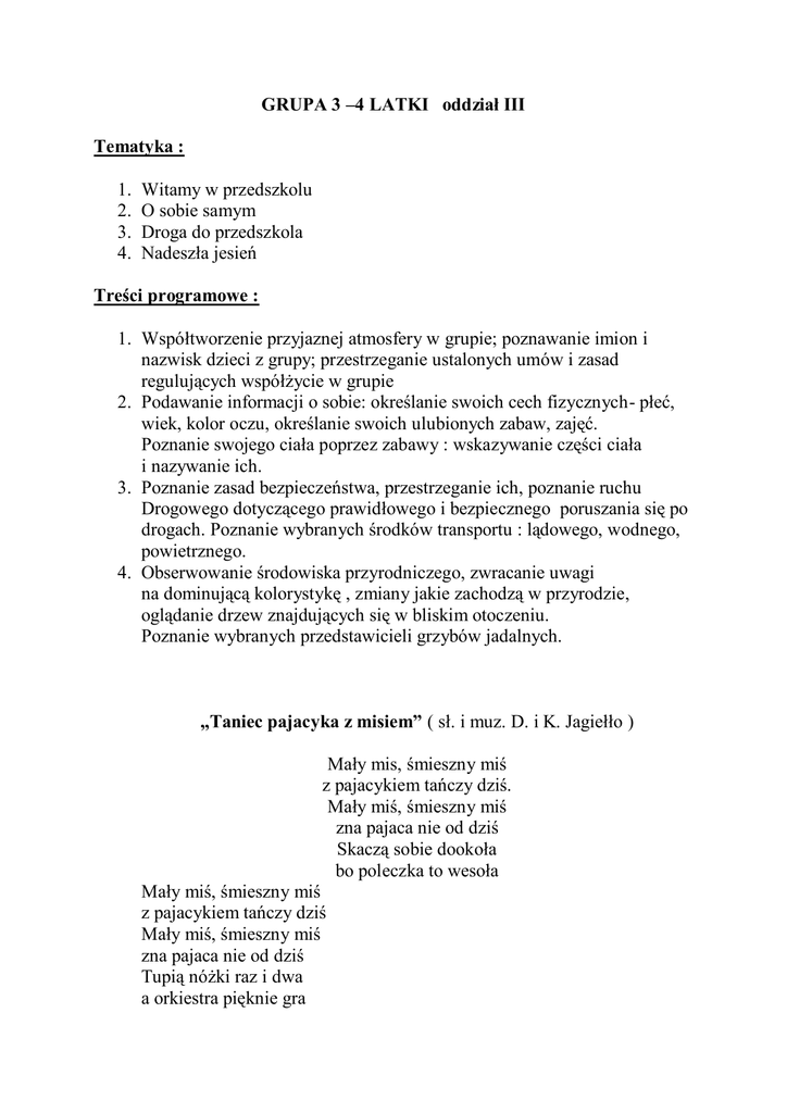 GRUPA 3 –4 LATKI oddział III Tematyka : 1. 2. 3. 4. Witamy w przedszkolu O sobie samym Droga do przedszkola Nadeszła jesień Treści programowe : 1. Współtworzenie przyjaznej atmosfery w grupie; poznawanie imion i nazwisk dzieci z grupy; przestrzeganie ustalonych umów i zasad regulujących współżycie w grupie 2. Podawanie informacji o sobie: określanie swoich cech fizycznych- płeć, wiek, kolor oczu, określanie swoich ulubionych zabaw, zajęć. Poznanie swojego ciała poprzez zabawy : wskazywanie części ciała i nazywanie ich. 3. Poznanie zasad bezpieczeństwa, przestrzeganie ich, poznanie ruchu Drogowego dotyczącego prawidłowego i bezpiecznego poruszania się po drogach. Poznanie wybranych środków transportu : lądowego, wodnego, powietrznego. 4. Obserwowanie środowiska przyrodniczego, zwracanie uwagi na dominującą kolorystykę , zmiany jakie zachodzą w przyrodzie, oglądanie drzew znajdujących się w bliskim otoczeniu. Poznanie wybranych przedstawicieli grzybów jadalnych. „Taniec pajacyka z misiem” ( sł. i muz. D. i K. Jagiełło ) Mały mis, śmieszny miś z pajacykiem tańczy dziś. Mały miś, śmieszny miś zna pajaca nie od dziś Skaczą sobie dookoła bo poleczka to wesoła Mały miś, śmieszny miś z pajacykiem tańczy dziś Mały miś, śmieszny miś zna pajaca nie od dziś Tupią nóżki raz i dwa a orkiestra pięknie gra Mały miś, śmieszny miś z pajacykiem tańczy dziś Mały miś, śmieszny miś zna pajaca nie od dziś Tupią nóżki : raz i dwa a orkiestra pięknie gra
