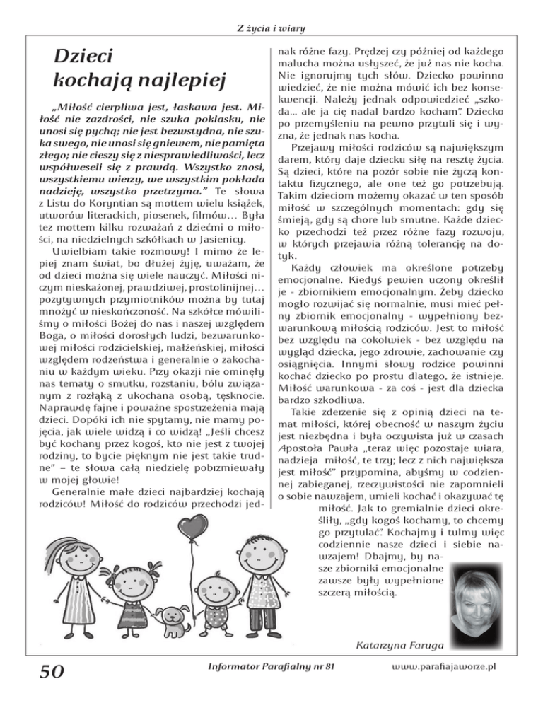 Z życia i wiary Dzieci kochają najlepiej „Miłość cierpliwa jest, łaskawa jest. Miłość nie zazdrości, nie szuka poklasku, nie unosi się pychą; nie jest bezwstydna, nie szuka swego, nie unosi się gniewem, nie pamięta złego; nie cieszy się z nierawiedliwości, le wółweseli się z prawdą. Wszystko znosi, wszystkiemu wiey, we wszystkim pokłada nadzieję, wszystko petyma.” Te słowa z Listu do Koryntian są mottem wielu książek, utworów literackich, piosenek, filmów… Była tez mottem kilku rozważań z dziećmi o miłości, na niedzielnych szkółkach w Jasienicy. Uwielbiam takie rozmowy! I mimo że lepiej znam świat, bo dłużej żyję, uważam, że od dzieci można się wiele nauyć. Miłości niym nieskażonej, prawdziwej, prostolinijnej… pozytywnych pymiotników można by tutaj mnożyć w nieskońoność. Na szkółce mówiliśmy o miłości Bożej do nas i naszej względem Boga, o miłości dorosłych ludzi, bezwarunkowej miłości rodzicielskiej, małżeńskiej, miłości względem rodzeństwa i generalnie o zakochaniu w każdym wieku. Py okazji nie ominęły nas tematy o smutku, rozstaniu, bólu związanym z rozłąką z ukochana osobą, tęsknocie. Naprawdę fajne i poważne osteżenia mają dzieci. Dopóki ich nie ytamy, nie mamy pojęcia, jak wiele widzą i co widzą! „Jeśli chcesz być kochany pez kogoś, kto nie jest z twojej rodziny, to bycie pięknym nie jest takie trudne” – te słowa całą niedzielę pobmiewały w mojej głowie! Generalnie małe dzieci najbardziej kochają rodziców! Miłość do rodziców pechodzi jed- nak różne fazy. Prędzej y później od każdego malucha można usłyszeć, że już nas nie kocha. Nie ignorujmy tych słów. Dziecko powinno wiedzieć, że nie można mówić ich bez konsekwencji. Należy jednak odpowiedzieć „szkoda... ale ja cię nadal bardzo kocham”. Dziecko po pemyśleniu na pewno pytuli się i wyzna, że jednak nas kocha. Pejawy miłości rodziców są największym darem, który daje dziecku siłę na resztę życia. Są dzieci, które na pozór sobie nie żyą kontaktu fizynego, ale one też go potebują. Takim dzieciom możemy okazać w ten osób miłość w szególnych momentach: gdy się śmieją, gdy są chore lub smutne. Każde dziecko pechodzi też pez różne fazy rozwoju, w których pejawia różną tolerancję na dotyk. Każdy łowiek ma określone poteby emocjonalne. Kiedyś pewien uony określił je - zbiornikiem emocjonalnym. Żeby dziecko mogło rozwijać się normalnie, musi mieć pełny zbiornik emocjonalny - wypełniony bezwarunkową miłością rodziców. Jest to miłość bez względu na cokolwiek - bez względu na wygląd dziecka, jego zdrowie, zachowanie y osiągnięcia. Innymi słowy rodzice powinni kochać dziecko po prostu dlatego, że istnieje. Miłość warunkowa - za coś - jest dla dziecka bardzo szkodliwa. Takie zdeenie się z opinią dzieci na temat miłości, której obecność w naszym życiu jest niezbędna i była oywista już w asach ostoła Pawła „teraz więc pozostaje wiara, nadzieja miłość, te ty; le z nich największa jest miłość” pypomina, abyśmy w codziennej zabieganej, eywistości nie zapomnieli o sobie nawzajem, umieli kochać i okazywać tę miłość. Jak to gremialnie dzieci określiły, „gdy kogoś kochamy, to chcemy go pytulać”. Kochajmy i tulmy więc codziennie nasze dzieci i siebie nawzajem! Dbajmy, by nasze zbiorniki emocjonalne zawsze były wypełnione szerą miłością. Katayna Faruga 50 Informator Paraalny nr 81 www.parafiajawoe.pl