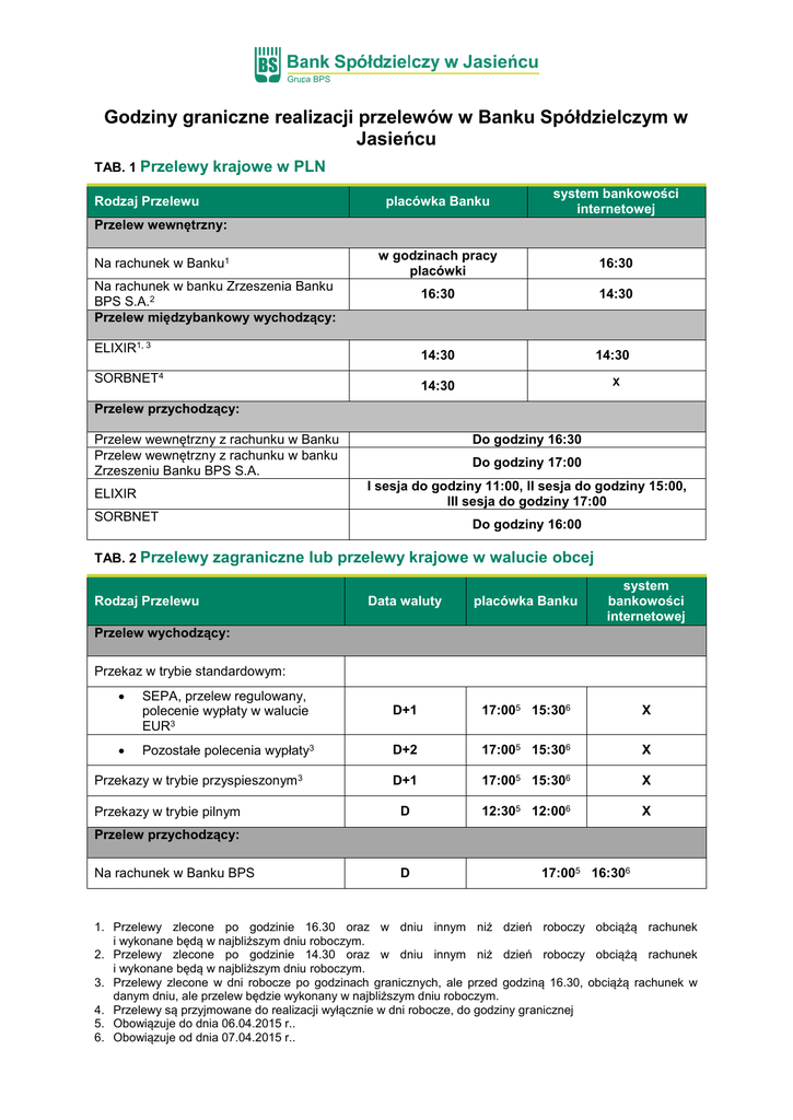 Godziny graniczne realizacji przelewów w Banku Spółdzielczym w Jasieńcu TAB. 1 Przelewy krajowe w PLN Rodzaj Przelewu placówka Banku system bankowości internetowej w godzinach pracy placówki 16:30 16:30 14:30 14:30 14:30 Przelew wewnętrzny: Na rachunek w Banku1 Na rachunek w banku Zrzeszenia Banku BPS S.A.2 Przelew międzybankowy wychodzący: ELIXIR1, 3 SORBNET4 X 14:30 Przelew przychodzący: Przelew wewnętrzny z rachunku w Banku Przelew wewnętrzny z rachunku w banku Zrzeszeniu Banku BPS S.A. Do godziny 16:30 Do godziny 17:00 I sesja do godziny 11:00, II sesja do godziny 15:00, III sesja do godziny 17:00 ELIXIR SORBNET TAB. 2 Przelewy Do godziny 16:00 zagraniczne lub przelewy krajowe w walucie obcej Data waluty placówka Banku system bankowości internetowej SEPA, przelew regulowany, polecenie wypłaty w walucie EUR3 D+1 17:005 15:306 X Pozostałe polecenia wypłaty3 D+2 17:005 15:306 X D+1 17:005 15:306 X D 12:305 12:006 X Rodzaj Przelewu Przelew wychodzący: Przekaz w trybie standardowym: Przekazy w trybie przyspieszonym 3 Przekazy w trybie pilnym Przelew przychodzący: Na rachunek w Banku BPS D 17:005 16:306 1. Przelewy zlecone po godzinie 16.30 oraz w dniu innym niż dzień roboczy obciążą rachunek i wykonane będą w najbliższym dniu roboczym. 2. Przelewy zlecone po godzinie 14.30 oraz w dniu innym niż dzień roboczy obciążą rachunek i wykonane będą w najbliższym dniu roboczym. 3. Przelewy zlecone w dni robocze po godzinach granicznych, ale przed godziną 16.30, obciążą rachunek w danym dniu, ale przelew będzie wykonany w najbliższym dniu roboczym. 4. Przelewy są przyjmowane do realizacji wyłącznie w dni robocze, do godziny granicznej 5. Obowiązuje do dnia 06.04.2015 r.. 6. Obowiązuje od dnia 07.04.2015 r..