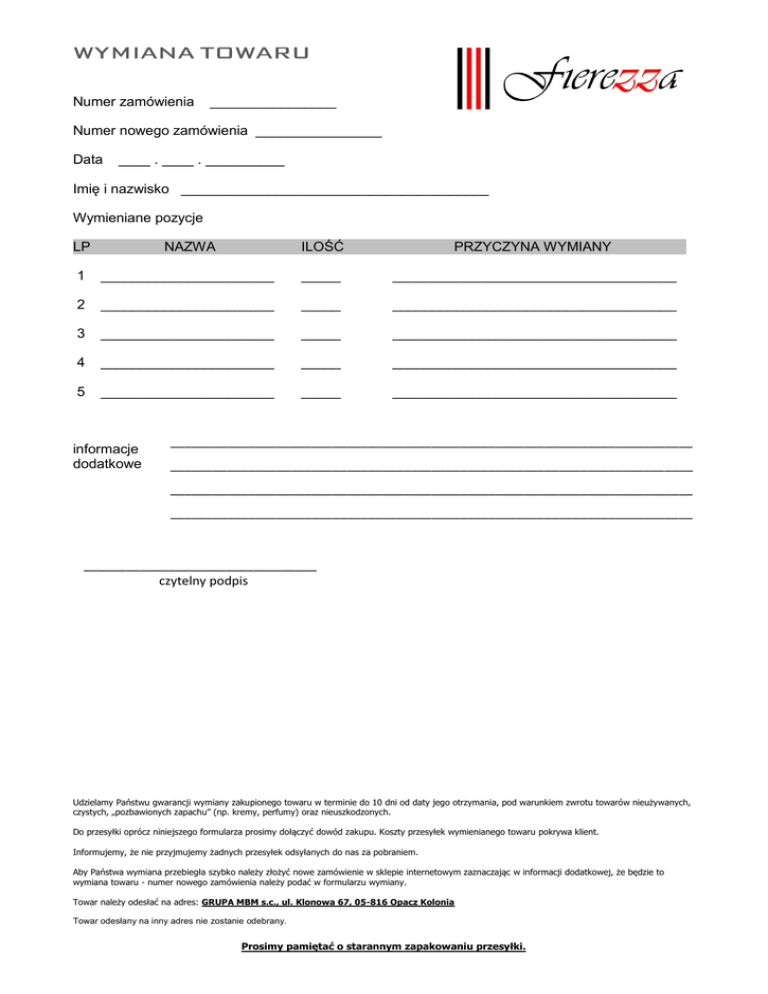 Numer zamówienia ________________ Numer nowego zamówienia ________________ Data ____ . ____ . __________ Imię i nazwisko _______________________________________ Wymieniane pozycje LP NAZWA ILOŚĆ PRZYCZYNA WYMIANY 1 ______________________ _____ ____________________________________ 2 ______________________ _____ ____________________________________ 3 ______________________ _____ ____________________________________ 4 ______________________ _____ ____________________________________ 5 ______________________ _____ ____________________________________ informacje dodatkowe . __________________________________________________________________________ __________________________________________________________________________ __________________________________________________________________________ __________________________________________________________________________ _________________________________ czytelny podpis Udzielamy Państwu gwarancji wymiany zakupionego towaru w terminie do 10 dni od daty jego otrzymania, pod warunkiem zwrotu towarów nieużywanych, czystych, „pozbawionych zapachu” (np. kremy, perfumy) oraz nieuszkodzonych. Do przesyłki oprócz niniejszego formularza prosimy dołączyć dowód zakupu. Koszty przesyłek wymienianego towaru pokrywa klient. Informujemy, że nie przyjmujemy żadnych przesyłek odsyłanych do nas za pobraniem. Aby Państwa wymiana przebiegła szybko należy złożyć nowe zamówienie w sklepie internetowym zaznaczając w informacji dodatkowej, że będzie to wymiana towaru - numer nowego zamówienia należy podać w formularzu wymiany. Towar należy odesłać na adres: GRUPA MBM s.c., ul. Klonowa 67, 05-816 Opacz Kolonia Towar odesłany na inny adres nie zostanie odebrany. Prosimy pamiętać o starannym zapakowaniu przesyłki.