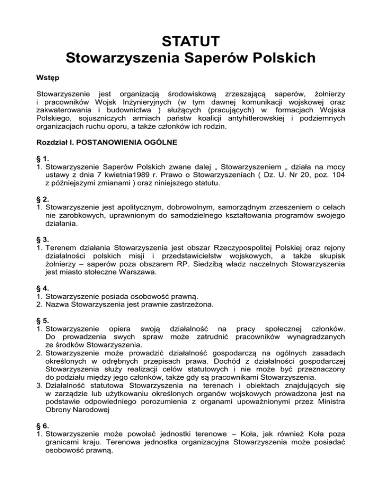 STATUT Stowarzyszenia Saperów Polskich Wstęp Stowarzyszenie jest organizacją środowiskową zrzeszającą saperów, żołnierzy i pracowników Wojsk Inżynieryjnych (w tym dawnej komunikacji wojskowej oraz zakwaterowania i budownictwa ) służących (pracujących) w formacjach Wojska Polskiego, sojuszniczych armiach państw koalicji antyhitlerowskiej i podziemnych organizacjach ruchu oporu, a także członków ich rodzin. Rozdział I. POSTANOWIENIA OGÓLNE § 1. 1. Stowarzyszenie Saperów Polskich zwane dalej „ Stowarzyszeniem „ działa na mocy ustawy z dnia 7 kwietnia1989 r. Prawo o Stowarzyszeniach ( Dz. U. Nr 20, poz. 104 z późniejszymi zmianami ) oraz niniejszego statutu. § 2. 1. Stowarzyszenie jest apolitycznym, dobrowolnym, samorządnym zrzeszeniem o celach nie zarobkowych, uprawnionym do samodzielnego kształtowania programów swojego działania. § 3. 1. Terenem działania Stowarzyszenia jest obszar Rzeczypospolitej Polskiej oraz rejony działalności polskich misji i przedstawicielstw wojskowych, a także skupisk żołnierzy – saperów poza obszarem RP. Siedzibą władz naczelnych Stowarzyszenia jest miasto stołeczne Warszawa. § 4. 1. Stowarzyszenie posiada osobowość prawną. 2. Nazwa Stowarzyszenia jest prawnie zastrzeżona. § 5. 1. Stowarzyszenie opiera swoją działalność na pracy społecznej członków. Do prowadzenia swych spraw może zatrudnić pracowników wynagradzanych ze środków Stowarzyszenia. 2. Stowarzyszenie może prowadzić działalność gospodarczą na ogólnych zasadach określonych w odrębnych przepisach prawa. Dochód z działalności gospodarczej Stowarzyszenia służy realizacji celów statutowych i nie może być przeznaczony do podziału między jego członków, także gdy są pracownikami Stowarzyszenia. 3. Działalność statutowa Stowarzyszenia na terenach i obiektach znajdujących się w zarządzie lub użytkowaniu określonych organów wojskowych prowadzona jest na podstawie odpowiedniego porozumienia z organami upoważnionymi przez Ministra Obrony Narodowej § 6. 1. Stowarzyszenie może powołać jednostki terenowe – Koła, jak również Koła poza granicami kraju. Terenowa jednostka organizacyjna Stowarzyszenia może posiadać osobowość prawną. § 7. 1. Stowarzyszenie może ustanawiać i używać własnych odznak organizacyjnych, pieczęci i druków firmowych, a także wydawać własne wydawnictwa. § 8. 1. Stowarzyszenie może być członkiem krajowych i międzynarodowych organizacji o tym samym lub podobnym profilu działania. § 9. 1. W przypadkach szczególnych nie ujętych w niniejszym statucie decyzję dotyczącą przyznania uprawnień członkowskich podejmuje Zarząd Główny Stowarzyszenia. Rozdział II. CELE STOWARZYSZENIA I SPOSOBY ICH REALIZACJI § 10 1. Celami Stowarzyszenia są : 1) integracja środowisk saperskich i żołnierzy Wojsk Inżynieryjnych, kultywowanie i upowszechnianie tradycji saperskiej, 2) utrwalanie w pamięci narodowej, a zwłaszcza wśród młodzieży, ogólnie pojętej działalności saperskiej z lat wojen i pokoju, 3) popularyzowanie i propagowanie spraw obronności kraju ze szczególnym uwzględnieniem problematyki inżynieryjnej, 4) sprawowanie opieki nad miejscami pamięci narodowej związanymi z działalnością saperów, 5) prowadzenie działalności w zakresie poradnictwa, pomocy i propagowania zasad bezpieczeństwa przy pracach inżynieryjnych, a szczególnie z materiałami wybuchowymi i innymi środkami niebezpiecznymi, 6) troska o sprawy bytowe saperów, żołnierzy Wojsk Inżynieryjnych i ich rodzin. 2. Cele Stowarzyszenie osiąga przez: 1) działalność nieodpłatną: a) organizowanie zebrań i spotkań członków; b) uczestniczenie w uroczystościach związanych ze świętami państwowymi, rocznicowymi upamiętniającymi działalność saperów i żołnierzy Wojsk Inżynieryjnych oraz uroczystościach DNIA SAPERA - Święta Wojsk Inżynieryjnych; c) upowszechnianie w prasie, TV, radiu i we własnych wydawnictwach historii jednostek wojskowych, saperów i żołnierzy Wojsk Inżynieryjnych, promowanie ich dokonań w kraju i za granicą w czasie wojen i pokoju, podczas operacji rozminowania kraju w latach 1945 - 1956, oczyszczania terenu z materiałów wybuchowych i niebezpiecznych akcjach zwalczania klęsk żywiołowych i w misjach pokojowych ONZ; d) współdziałanie z innymi organizacjami administracji państwowej, samorządowej, jednostkami wojskowymi zwłaszcza Wojsk Inżynieryjnych, szkołami i zakładami pracy; e) rozpoznawanie stanu materialnego członków Stowarzyszenia i ich rodzin oraz udzielanie potrzebującym odpowiedniego wsparcia; f) występowanie w obronie interesów zawodowych, środowiskowych i kombatanckich, a także podnoszenie kwalifikacji członków Stowarzyszenia; g) prowadzenie kursów specjalistycznych oraz doradztwa technicznego; h) występowanie o nadanie odznaczeń i wyróżnień za działalność saperską podczas wojen, rozminowania i oczyszczania kraju, zwłaszcza klęsk żywiołowych. 2) działalność odpłatną: a) wydawanie własnego biuletynu pod nazwą SAPER b) organizowanie imprez integrujących, uroczystych jubileuszy, podróży geograficzno - historycznych, wyjazdów na pokazy działania wojsk i sprzętu wojskowego, kursów, wystaw, sympozjów i konferencji naukowych związanych z obronnością kraju, a zwłaszcza z szeroko rozumianą działalnością saperską. 3. Dla osiągnięcia swoich celów Stowarzyszenie może wspierać działalność innych osób prawnych oraz osób fizycznych, których działalność zbieżna jest z celami Stowarzyszenia, oraz może przyjmować zlecenia organizacji rządowych i pozarządowych zgodnie z jej statutowymi celami. 4. Stowarzyszenie nie może: 1) udzielać pożyczek lub zabezpieczeń zobowiązań majątkiem Stowarzyszenia w stosunku do jego członków, członków organów lub pracowników oraz osób, z którymi pracownicy pozostają w związku małżeńskim albo w stosunku pokrewieństwa lub powinowactw