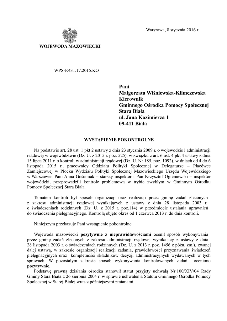 Warszawa, 8 stycznia 2016 r. WOJEWODA MAZOWIECKI WPS-P.431.17.2015.KO Pani Małgorzata Wiśniewska-Klimczewska Kierownik Gminnego Ośrodka Pomocy Społecznej Stara Biała ul. Jana Kazimierza 1 09-411 Biała WYSTĄPIENIE POKONTROLNE Na podstawie art. 28 ust. 1 pkt 2 ustawy z dnia 23 stycznia 2009 r. o wojewodzie i administracji rządowej w województwie (Dz. U. z 2015 r. poz. 525), w związku z art. 6 ust. 4 pkt 4 ustawy z dnia 15 lipca 2011 r. o kontroli w administracji rządowej (Dz. U. Nr 185, poz. 1092), w dniach od 4 do 6 listopada 2015 r., pracownicy Oddziału Polityki Społecznej w Delegaturze – Placówce Zamiejscowej w Płocku Wydziału Polityki Społecznej Mazowieckiego Urzędu Wojewódzkiego w Warszawie: Pani Anna Gościniak – starszy inspektor i Pan Krzysztof Ogieniewski – inspektor wojewódzki, przeprowadzili kontrolę problemową w trybie zwykłym w Gminnym Ośrodku Pomocy Społecznej Stara Biała. Tematem kontroli był sposób organizacji oraz realizacji przez gminę zadań zleconych z zakresu administracji rządowej wynikających z ustawy z dnia 28 listopada 2003 r. o świadczeniach rodzinnych (Dz. U. z 2015 r. poz.114) w przedmiocie ustalania uprawnień do świadczenia pielęgnacyjnego. Kontrolą objęto okres od 1 czerwca 2013 r. do dnia kontroli. Niniejszym przekazuję Pani wystąpienie pokontrolne. Wojewoda mazowiecki pozytywnie z nieprawidłowościami ocenił sposób wykonywania przez gminę zadań zleconych z zakresu administracji rządowej wynikający z ustawy z dnia 28 listopada 2003 r. o świadczeniach rodzinnych (Dz. U. z 2013 r. poz. 1456 z późn. zm.), zwanej dalej ustawą, w zakresie organizacji realizacji zadania, prawidłowości przyznawania świadczeń pielęgnacyjnych oraz kompletności składników decyzji administracyjnych wydawanych w tych sprawach. W pozostałym zakresie sposób wykonywania kontrolowanych zadań oceniono pozytywnie. Podstawę prawną działania ośrodka stanowił statut przyjęty uchwałą Nr 100/XIV/04 Rady Gminy Stara Biała z 26 sierpnia 2004 r. w sprawie uchwalenia Statutu Gminnego Ośrodka Pomocy Społecznej w Starej Białej wraz z późniejszymi zmianami. Wewnętrzne zasady działania oraz organizację kontrolowanej jednostki określał regulamin organizacyjny Gminnego Ośrodka Pomocy Społecznej Stara Biała wprowadzony przez panią zarządzeniem nr 2/2010 z dnia 26 lipca 2010 r. wraz z późniejszymi zmianami. Ustalono, że w okresie objętym kontrolą w GOPS Stara Biała realizacją zadań wynikających z ustawy zajmowała się pani kierownik oraz trzech pracowników działu świadczeń rodzinnych i alimentacyjnych: pani Iwona Kuklińska – starszy specjalista, pani Mariola Giewartowska – starszy referent i pani Monika Bartnicka – starszy referent (do 31.08.2015 r.). Ośrodek posiadał własną instrukcję kancelaryjną i jednolity rzeczowy wykaz akt wprowadzone przez panią zarządzeniem nr 6/2011 z 3 października 2011 r. Ustalono, że wnioski o przyznanie świadczeń rodzinnych były rejestrowane w dzienniku korespondencyjnym. Stwierdzono, że w ośrodku prowadzono spisy spraw dotyczące świadczeń rodzinnych, a w aktach świadczeniobiorców znajdowały się metryki spraw. W kontrolowanej jednostce nie prowadzono rejestrów dotyczących realizacji zadań wynikających z ustawy. 1. Organizacja realizacji zadania. Ustalono, że w okresie objętym kontrolą wójt gminy Stara Biała udzielił pani upoważnienia do prowadzenia postępowania w sprawach świadczeń rodzinnych oraz do wydawania w tych sprawach decyzji administracyjnych. Ponadto na pani wniosek wójt gminy Stara Biała upoważnił panią Iwonę Kuklińską do prowadzenia postępowania i wydawania decyzji administracyjnych w sprawach dotyczących świadczeń rodzinnych w okresie nieobecności w pracy kierownika GOPS Stara Biała. Mimo, że do obowiązków pani Iwony Kuklińskiej – starszego specjalisty, pani Marioli Giewartowskiej – starszego referenta i pani Moniki Bartnickiej – starszego referenta należało prowadzenie postępowań w sprawach przyznania lub odmowy świadczeń rodzinnych, nie wystąpiła pani do wójta gminy Stara Biała z wnioskiem o udzielenie tym pracownikom stosownych upoważnień do prowadzenia postępowań w sprawach dotyczących świadczeń rodzinnych. Za stwierdzone nieprawidłowości ponosi pani odpowiedzialność. Stosownie do postanowień § 8 ust. 2 regulaminu organizacyjnego Gminnego Ośrodka Pomocy Społecznej Stara Biała w ośrodku utworzono dział świadczeń rodzinnych i alimentacyjnych, co spełnia wymogi określone w art. 20 ust. 4 ustawy. 2. Prawidłowość ustalania uprawnień do świadczenia pielęgnacyjnego i jego wypłacania. W okresie od 1 czerwca 2013 r. do 3 listopada 2015 r. w kontrolowanej jednostce, na podstawie przyjętych wniosków, wszczęto 42 postępowania w sprawie ustalenia prawa do świadczenia pielęgnacyjnego. W 41 przypadkach postępowanie zakończono wydaniem decyzji administracyjnych ustalających prawo do świadczenia pielęgnacyjnego, a w jednym przypadku odmówiono prawa do świadczenia pielęgnacyjnego. W tym samym okresie wszczęto z urzędu 24 postępowania administracyjne, które zostały zakończone wydaniem decyzji administracyjnej w sprawie zmiany decyzji ustalającej prawo do świadczenia pielęgnacyjnego w zakresie jego wysokości. Analizie poddano akta 32 spraw zakończonych wydaniem decyzji ostatecznych w przedmiocie ustalenia prawa do świadczenia pielęgnacyjnego oraz 17 decyzji administracyjnych w sprawie zmiany decyzji ustalającej prawo do świadczenia pielęgnacyjnego w zakresie jego wysokości. Wszystkie decyzje miały status decyzji ostatecznych. Stwierdzono, że we wszystkich 32 przypadkach postępowanie wszczęto na podstawie prawidłowo wypełnionego wniosku o ustalenie prawa do świadczenia pielęgnacyjnego zgodnego z wzorem określonym w rozporządzeniu Ministra Pracy i Polityki Społecznej z 3 stycznia 2013 r. w sprawie sposobu i trybu postępowania w sprawach