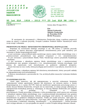 Z W I Ą Z E K L E Ś N I K Ó W POLSKICH PARKÓW NARODOWYCH 95 lat ZLP Kontakt: JEZIORY 62 - 050 MOSINA Tel. 061 8982 313 Fax 061 8982 301 Kom. 509 068 883 1918 – 2013 *** 20 lat ZLP PN 1992 – 2012 ………………. L.dz.096/14 Jeziory dnia 30 maja 2014 r. Pan Maciej Grabowski Minister Środowiska ul. Wawelska 52/54 00-922 Warszawa W nawiązaniu do otrzymanych z Ministerstwa Środowiska drogą e-mailową propozycji zmian do ustawy o ochronie przyrody, Związek Leśników Polskich Parków Narodowych wnosi swoje uwagi i wskazania: PROPONOWANE PRZEZ MINISTERSTWO ŚRODOWISKA ROZWIĄZANIE: Proponuje się rozszerzenie katalogu zawartego w art. 10b ustawy o ochronie przyrody o wskazanie, że umowa dotycząca rozporządzenia nieruchomością przez park narodowy jest zawierana w drodze bezprzetargowej jeżeli: a) jest zawierana z pracownikiem parku narodowego umowa najmu lokalu mieszkalnego wraz z pomieszczeniami przynależnymi oraz gruntem związanym z ww. nieruchomościami; b) jest zawierana z pracownikiem Służby Parku Narodowego umowa przydziału bezpłatnego mieszkania; c) jest zawierana z aktualnym najemcą lokalu mieszkalnego wraz z pomieszczeniami przynależnymi oraz gruntem związanym z ww. nieruchomościami, któremu przysługuje tytuł prawny do zajmowania tych nieruchomości na podstawie odrębnych przepisów; d) jest zbywana na rzecz osoby, której przysługuje pierwszeństwo w jej nabyciu, stosownie do art. 104a; e) jest zawierana z aktualnym najemcą lub dzierżawcą nieruchomości, którzy poczynili nakłady na zagospodarowanie tych nieruchomości; f) dotyczy nieruchomości o powierzchni do 1 ha, na których pilnie muszą być wykonane działania ochronne. STANOWISKO ZLP PN: Jeżeli zapis ustawowy, tak jak zaproponowano w powyżej wskazanym brzmieniu jednoznacznie wskaże uprawnienie najemcy lub dzierżawcy do zawarcia umowy w formie bezprzetargowej, to w ocenie ZLP PN brak jest możliwości ograniczenia powyższego prawa w drodze decyzji Ministra Środowiska. Związek stoi na stanowisku, że należy przyjąć odmienną niż zaproponowana konstrukcję prawną tj. wskazującą, że decyzją Ministra Środowiska jest możliwe odstąpienie od przetargu w sytuacjach w Ustawie przewidzianych. Projekt przewiduje zwolnienie z trybu przetargowego, jeżeli umowa jest zawierana z aktualnym najemcą lokalu mieszkalnego wraz z pomieszczeniami przynależnymi oraz gruntem związanym z ww. nieruchomościami, któremu przysługuje tytuł prawny do zajmowania tych nieruchomości na podstawie odrębnych przepisów. Trudno jest ocenić powyższy zapis gdyż nie wiadomo, kto miałby być uprzywilejowany czyli kogo, jakie odrębne przepisy mogą uprawniać do korzystania z konkretnie wskazanej nieruchomości - ,, tej nieruchomości ,,. Norma powinna mieć swojego adresata, a w tym przypadku nie sposób w ocenie Związku takiego adresata wskazać. 1 Należy zaaprobować zapis umożliwiający bezprzetargowe zawarcie umowy z aktualnym najemcą lub dzierżawcą nieruchomości, którzy poczynili nakłady na zagospodarowanie tych nieruchomości, ale pod warunkiem, że nakłady zostały poczynione zgodnie z uprzednio uzyskaną zgodą od parku narodowego, a ich wartość przekracza ustaloną wielokrotność czynszu, tak aby drobne nakłady np. nakłady w postaci ogrodzenia, wiaty nie ograniczały uprawnienia innych podmiotów do uzyskania możliwości korzystania z gruntów Skarbu Państwa. PROPONOWANE PRZEZ MINISTERSTWO ŚRODOWISKA ROZWIĄZANIE: Zgodnie z art. 11 ustawy o ochronie przyrody, na obszarach graniczących z parkiem narodowym wyznacza się otulinę parku narodowego, będącą strefą ochronną wyznaczoną indywidualnie dla danej formy ochrony przyrody w celu jej zabezpieczenia przed zagrożeniami zewnętrznymi wynikającymi z działalności człowieka. STANOWISKO ZLP PN: Koniecznym w ocenie ZLP PN jest także zmiana ustawowej definicji otuliny w art. 5 ust. 14 Ustawy. ZLP PN proponuje brzmienie powyżej wskazanego przepisu: „otulina oznacza strefę ochronną graniczącą z formą ochrony przyrody i wyznaczoną indywidualnie dla formy ochrony przyrody w celu zabezpieczenia, poprzez wprowadzenie systemu ograniczeń lub zakazów chroniących przed zagrożeniami zewnętrznymi wynikającymi z działalności człowieka.” PROPONOWANE PRZEZ MINISTERSTWO ŚRODOWISKA ROZWIĄZANIE: Stosownie do art. 12 ust. 3 ustawy o ochronie przyrody, za wstęp do parku narodowego lub na niektóre jego obszary oraz za udostępnianie parku narodowego lub niektórych jego obszarów mogą być pobierane opłaty. Wysokość tych opłat ustala dyrektor parku narodowego, przy czym w ust. 5 tego artykułu, ustawodawca wskazał maksymalną wysokość opłaty za jednorazowy wstęp do parku, która nie może przekroczyć kwoty 6 zł waloryzowanej o prognozowany średnioroczny wskaźnik cen towarów i usług konsumpcyjnych ogółem, przyjęty w ustawie budżetowej...... Wydaje się, że pozytywny efekt w tym zakresie może przynieść różnicowanie cen biletów wstępu, na poszczególne szlaki turystyczne, wraz z informowaniem o warunkach (aktualnej liczbie osób) na szlakach. STANOWISKO ZLP PN: Pomysł skomercjalizowania zasad wstępu do parku narodowego zabija istotę parków narodowych i cele, dla których zostały utworzone. Sytuacja braku biletu jest normalna, co nie oznacza, że powinna powodować wzrost cen biletów, aż do osiągnięcia takiego stanu, że osoby mniej zamożne tylko potencjalnie będą mogły zobaczyć najatrakcyjniejsze lub najbardziej popularne miejsca. Maksymalna cena wstępu do parku narodowego w ocenie ZLPPN powinna być określona w drodze ustawy. Komercjalizacja zasad wstępu do parku narodowego stwarza dodatkowo niebezpieczeństwo przerzucenia kosztów utrzymania parków narodowych na odwiedzające je osoby, oraz rozliczania dyrektorów parków z efektu ekonomicznego, aż do uzyskania efektu samofinansowania parków narodowych. PROPONOWANE PRZEZ MINISTERSTWO ŚRODOWISKA ROZWIĄZANIE: Propo