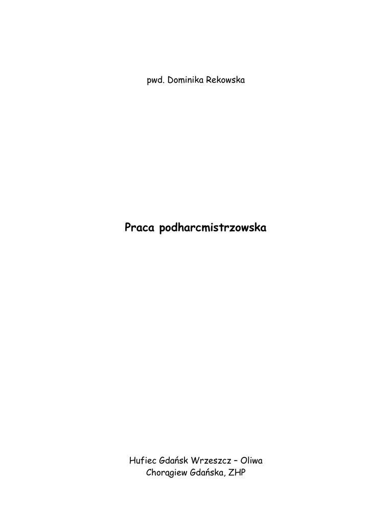 pwd. Dominika Rekowska Praca podharcmistrzowska Hufiec Gdańsk Wrzeszcz – Oliwa Chorągiew Gdańska, ZHP pwd. Dominika Rekowska Praca podharcmistrzowska: „Opis biegu przed Zobowiązaniem Instruktorskim jako przykład zwyczajowy środowiska.” „Przyjmuję obowiązki instruktora/instruktorki Związku Harcerstwa Polskiego. Jestem świadoma/świadomy odpowiedzialności harcerskiego wychowawcy i opiekuna. Będę dbać o dobre imię harcerstwa, przestrzegać Statutu ZHP, pracować nad sobą, pogłębiać swoją wiedzę i umiejętności. Wychowam swego następcę. Powierzonej przez Związek Harcerstwa Polskiego służby nie opuszczę samowolnie.” Wstęp. Nasze harcerskie życie jest nierozerwalnie związane z obrzędami i zwyczajami. Część obrzędów jest wspólna dla prawie wszystkich środowisk harcerskich. Są też obrzędy niepowtarzalne, bliskie tylko kilku harcerzom. Część z nich powstała dawno temu, inne zaś powstają dopiero współcześnie. Chciałabym przedstawić Wam zwyczaj mojego środowiska. Opowiem, jak wygląda bieg przed Zobowiązaniem Instruktorskim składanym przez przyszłego instruktora. Choć zwyczaj biegu przed Zobowiązaniem powstał kilka lat temu, praktycznie nikt z nas - instruktorów, jak i nikt z harcerzy naszego środowiska nie wyobraża sobie jak mogłoby tego biegu nie być. Najpierw dwa słowa o jakim środowisku mowa. Chodzi tu o drużynę, która powstała z połączenia 7 WDH i 33 HDW – a mianowicie 733 MDH „Panta rhei”, a także drużyny z nią związane, jak 99 HDW „Okeanida” i 73 GDH „Rozbitkowie”. Drużyny te działają w hufcu Gdańsk Wrzeszcz – Oliwa. Będę pisała o hm. Werze Pydzie - Ledwoń – druhnie Pilot Chorągwi Gdańskiej, phm. Andrzeju Sawuła – byłym drużynowym 733MDH, phm. Maćku Pająku - byłym drużynowym 7 WDH, phm. Wojtku Sawuła „Carrambie” – przybocznym w gromadzie zuchowej „Morskie Piraty”, phm. Krzyśku Potulskim „Kokosie” – KWŻcie w 733 MDH, pwd. Agacie Bąk – drużynowej 73 GDH, pwd. Monice Kosmowskiej – drużynowej 99 HDW, pwd. Gosi Czajkowskiej „Rybak” – byłej przybocznej 733 MDH, pwd. Oli Puchalskiej - przybocznej 73 GDH i o sobie, czyli Dominice Rekowskiej – drużynowej 733 MDH. Jak ważna jest chwila, w której składa się Zobowiązanie, wie pewnie każdy, kto to Zobowiązanie złożył. Tego się nie zapomina. To przełomowy moment. Słowa: „Przyjmuję obowiązki instruktora/instruktorki Związku Harcerstwa Polskiego...” zostaną na zawsze w naszej świadomości. Teraz to my organizujemy zbiórki, biegi, staramy się aby to, co robimy, było dla naszych harcerzy wartościowe i atrakcyjne. Bierzemy na siebie ogromną odpowiedzialność – choć wtedy nie zawsze zdajemy sobie z tego sprawę. Złożenie Zobowiązania Instruktorskiego to ważne święto – nie tylko dla przyszłego instruktora, ale także dla drużyny i środowiska. Aby zostało ono w pamięci na długo trzeba je odpowiednio starannie przygotować i dobrze przemyśleć. W przygotowanie takiej imprezy zazwyczaj angażują się instruktorzy i ci harcerze, którzy z przyszłym instruktorem są zaprzyjaźnieni. Często i zawsze chętnie pomagają też rodziny kandydata na przewodnika. Ważna jest odpowiednia atmosfera podczas samej uroczystości, zawsze staramy się aby Zobowiązanie było składane w ładnym miejscu, aby towarzyszyły mu symbole takie jak ogień, bandera, aby tą chwilą cieszyli się wspólnie członkowie drużyny, bliscy. Starannie dobrane słowa gawędy, radosny śpiew porządnie umundurowanej drużyny podkreślają wagę uroczystości. Ale zanim doczekamy się tej chwili, zanim padną słowa Zobowiązania, czeka przyszłego instruktora przygoda, wyzwanie, ale przede wszystkim dobra zabawa. To ostatnia impreza przygotowana tylko i wyłącznie z myślą o nim i dlatego powinna być naprawdę dobrze przemyślana. Zawsze chcemy by czekało na niego coś, czego się nie spodziewa, aby zrobił coś pierwszy raz w życiu, aby miał co wspominać i opowiadać. Opowiem wam jak wyglądały biegi, które do tej pory zorganizowaliśmy. Postaram się zrobić to dość szczegółowo. Lecz nie po to abyście mieli gotowe scenariusze takiej imprezy i mogli je powielać w swoich drużynach, lecz po to by zwrócić wam uwagę na to, jak ważne jest dopracowanie także tych małych elementów. Szczególnie zgranie wszystkiego czasowo. Bywa, że co do minuty. Jeśli to, co zrobiliśmy wam się spodoba, zachęcam was do zorganizowania podobnej imprezy. Może w moich opisach znajdziecie gotowe pomysły, być może to, co opisałam będzie dla was inspiracją. Pamiętajcie jednak, że każdą tego typu imprezę organizuje się dla konkretnej osoby, bądź też konkretnych osób. To dlatego te biegi różnią się od siebie. To wy najlepiej wiecie, co dla waszych znajomych przyszłych instruktorów będzie dobrą zabawą, co będzie wyzwaniem na ich poziomie. Co będzie wyzwaniem, któremu będą w stanie podołać. Chcemy przecież by ten nasz przyszły instruktor złożył Zobowiązanie. Gdyby jednak któreś zadanie przekroczyło jego możliwości zastanówcie się wtedy co zrobić... Nie chodzi tu przecież o to by osoba ta dowiedziała się, że nie nadaje się na instruktora, bo np. nie uda dotrzeć się jej gdzieś na czas. To nie byłaby przecież wina tej osoby. 1. Dawno, dawno temu... No może nie aż tak dawno... nadszedł czas, w którym Zobowiązanie miał złożyć Andrzej Sawuła i Maciek Pająk. Skąd dokładnie pochodził pomysł przygotowania tym właśnie chłopakom biegu nie wiem, bo wtedy jeszcze w drużynie mnie nie było. Wiem tylko, że był to zbieg okoliczności... Z opowieści tych, którzy całą imprezę przygotowali a także z ust Andrzeja stworzył się zwarty opis ich biegu. A wyglądało to tak: Jeszcze w nocy chłopaków obudzono. Żaden z nich nie spodziewał się tej pobudki i początkowo w to, co się dzieje nie wierzyli. Instrukcje jednak okazały się jas