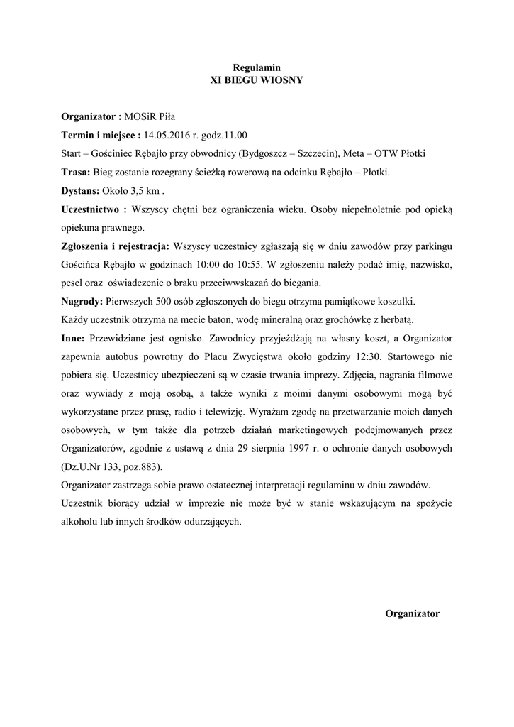 Regulamin XI BIEGU WIOSNY Organizator : MOSiR Piła Termin i miejsce : 14.05.2016 r. godz.11.00 Start – Gościniec Rębajło przy obwodnicy (Bydgoszcz – Szczecin), Meta – OTW Płotki Trasa: Bieg zostanie rozegrany ścieżką rowerową na odcinku Rębajło – Płotki. Dystans: Około 3,5 km . Uczestnictwo : Wszyscy chętni bez ograniczenia wieku. Osoby niepełnoletnie pod opieką opiekuna prawnego. Zgłoszenia i rejestracja: Wszyscy uczestnicy zgłaszają się w dniu zawodów przy parkingu Gościńca Rębajło w godzinach 10:00 do 10:55. W zgłoszeniu należy podać imię, nazwisko, pesel oraz oświadczenie o braku przeciwwskazań do biegania. Nagrody: Pierwszych 500 osób zgłoszonych do biegu otrzyma pamiątkowe koszulki. Każdy uczestnik otrzyma na mecie baton, wodę mineralną oraz grochówkę z herbatą. Inne: Przewidziane jest ognisko. Zawodnicy przyjeżdżają na własny koszt, a Organizator zapewnia autobus powrotny do Placu Zwycięstwa około godziny 12:30. Startowego nie pobiera się. Uczestnicy ubezpieczeni są w czasie trwania imprezy. Zdjęcia, nagrania filmowe oraz wywiady z moją osobą, a także wyniki z moimi danymi osobowymi mogą być wykorzystane przez prasę, radio i telewizję. Wyrażam zgodę na przetwarzanie moich danych osobowych, w tym także dla potrzeb działań marketingowych podejmowanych przez Organizatorów, zgodnie z ustawą z dnia 29 sierpnia 1997 r. o ochronie danych osobowych (Dz.U.Nr 133, poz.883). Organizator zastrzega sobie prawo ostatecznej interpretacji regulaminu w dniu zawodów. Uczestnik biorący udział w imprezie nie może być w stanie wskazującym na spożycie alkoholu lub innych środków odurzających. Organizator