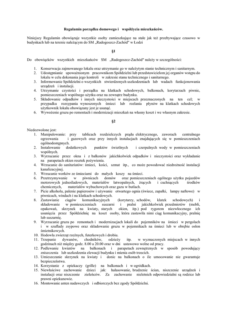 Regulamin porządku domowego i współżycia mieszkańców. Niniejszy Regulamin obowiązuje wszystkie osoby zamieszkujące na stałe jak też przebywające czasowo w budynkach lub na terenie należącym do SM „Radogoszcz-Zachód" w Łodzi §1 Do obowiązków wszystkich mieszkańców SM „Radogoszcz-Zachód" należy w szczególności: 1. 2. 3. 4. 5. 6. Konserwacja zajmowanego lokalu oraz utrzymanie go w należytym stanie technicznym i sanitarnym. Udostępnianie upoważnionym pracownikom Spółdzielni lub przedstawicielom jej organów wstępu do lokalu w celu dokonania jego kontroli w zakresie stanu technicznego i sanitarnego. Informowanie Spółdzielni o wszystkich stwierdzonych uszkodzeniach lub wadach funkcjonowania urządzeń i instalacji. Utrzymanie czystości i porządku na klatkach schodowych, balkonach, korytarzach piwnic, pomieszczeniach wspólnego użytku oraz na zewnątrz budynku. Składowanie odpadków i innych nieczystości w miejscach przeznaczonych na ten cel; w przypadku rozsypania wynoszonych śmieci lub rozlania płynów na klatkach schodowych użytkownik lokalu obowiązany jest je usunąć. Wywożenie gruzu po remontach i modernizacji mieszkań na własny koszt i we własnym zakresie. §2 Niedozwolone jest: 1. Manipulowanie: przy tablicach rozdzielczych prądu elektrycznego, zaworach centralnego ogrzewania i gazowych oraz przy innych instalacjach znajdujących się w pomieszczeniach ogólnodostępnych. 2. Instalowanie dodatkowych punktów świetlnych i czerpalnych wody w pomieszczeniach wspólnych. 3. Wyrzucanie przez okna i z balkonów jakichkolwiek odpadków i nieczystości oraz wykładanie na parapetach okien resztek pożywienia. 4. Wrzucanie do sanitariatów: śmieci, kości, szmat itp., co może powodować niedrożność instalacji kanalizacyjnej. 5. Wrzucanie worków ze śmieciami do małych koszy na śmieci. 6. Przetrzymywanie w piwnicach domów oraz pomieszczeniach ogólnego użytku pojazdów motorowych jednośladowych, materiałów łatwopalnych, żrących i cuchnących środków chemicznych, materiałów wybuchowych oraz gazu w butlach. 7. Picie alkoholu, palenie papierosów i używanie otwartego ognia (świece, zapałki, lampy naftowe) w piwnicach, windach i na klatkach schodowych. 8. Zastawianie ciągów komunikacyjnych (korytarzy, schodów, klatek schodowych) i składowanie w pomieszczeniach suszarni i pralni jakichkolwiek przedmiotów (mebli, opakowań, skrzynek na kwiaty, starych okien, itp.) pod rygorem niezwłocznego ich usunięcia przez Spółdzielnię na koszt osoby, która zastawiła nimi ciąg komunikacyjny, pralnię lub suszarnię. 9. Wyrzucanie gruzu po remontach i modernizacjach lokali do pojemników na śmieci w pergolach i w szuflady zsypowe oraz składowanie gruzu w pojemnikach na śmieci lub w obrębie osłon śmietnikowych. 10. Hodowla zwierząt rzeźnych, futerkowych i drobiu. 11. Trzepanie dywanów, chodników, odzieży itp. w wyznaczonych miejscach w innych godzinach niż między godz. 8.00 a 20.00 oraz w dni ustawowo wolne od pracy. 12. Podlewanie kwiatów na balkonach i parapetach zewnętrznych w sposób powodujący zniszczenia lub uszkodzenia elewacji budynku i mienia osób trzecich. 13. Umieszczanie skrzynek na kwiaty i donic na balkonach o ile umocowanie nie gwarantuje bezpieczeństwa. 14. Korzystanie z opiekaczy (grille) na balkonach i w ogródkach. 15. Niewłaściwe zachowanie dzieci jak: hałasowanie, brudzenie ścian, niszczenie urządzeń i instalacji oraz niszczenie zieleńców. Za zachowanie nieletnich odpowiedzialni są rodzice lub prawni opiekunowie. 16. Montowanie anten nadawczych i odbiorczych bez zgody Spółdzielni. §3 1. 2. Dla zgodnego współżycia mieszkańców osiedla potrzebna jest wzajemna współpraca i niezakłócanie sobie pokoju. Cisza nocna obowiązuje w godzinach od 22.00 do 6.00 i w tych godzinach nie należy: nastawiać głośno urządzeń audiowizualnych, używać hałaśliwego sprzętu mechanicznego, wykonywać napraw, remontów i prac domowych powodujących hałas, zachowywać się głośno w mieszkaniach i na korytarzach. §4 1. 2. 3. 4. 5. W domach mieszkalnych wolno trzymać psa lub kota pod warunkiem, że zwierzęta te nie stwarzają zagrożenia oraz nie zakłócają spokoju, a ich posiadacze przestrzegają wymogów sanitarno-porządkowych. Psy należy wyprowadzać w kagańcu i na smyczy. Zabrania się: przewożenia psów w windach bez kagańca i bez smyczy, prowadzenia psów w obszarach placów zabaw i piaskownic dla dzieci. Zobowiązuje się właścicieli psów do usuwania ich odchodów zanieczyszczających klatki schodowe i pomieszczenia wspólnego użytku oraz ciągi pieszo jezdne. Za wszelkie szkody spowodowane przez psa odpowiedzialny jest jego właściciel. §5 1. 2. 3. 4. Z pralni i suszarni może korzystać każdy mieszkaniec budynku w ustalonej kolejności. Opiekę nad pralnią i suszarnią sprawuje osoba wyłoniona przez mieszkańców. Utrzymanie czystości w pralni i suszarni należy do osób korzystających z tych pomieszczeń. Kontrolę nad tym sprawuje osoba przechowująca klucze. Zabronione jest korzystanie z pralni i suszarni w celach zarobkowych i niezgodnych z przeznaczeniem. W stosunku do winnych naruszania zasad Regulaminu Zarząd Spółdzielni zastrzega sobie prawo wyciągania konsekwencji w następujących formach: upomnienie, ostrzeżenie, skierowanie wniosku o ukaranie do właściwego organu administracji państwowej oraz złożenie wniosku o wykluczenie ze spółdzielni do jej Rady Nadzorczej. Niniejszy Regulamin został zatwierdzony Uchwałą 1.07.2004 r. i wchodzi w życie z dniem uchwalenia, nr 88/R/2004 Rady Nadzorczej z dnia ZARZĄD