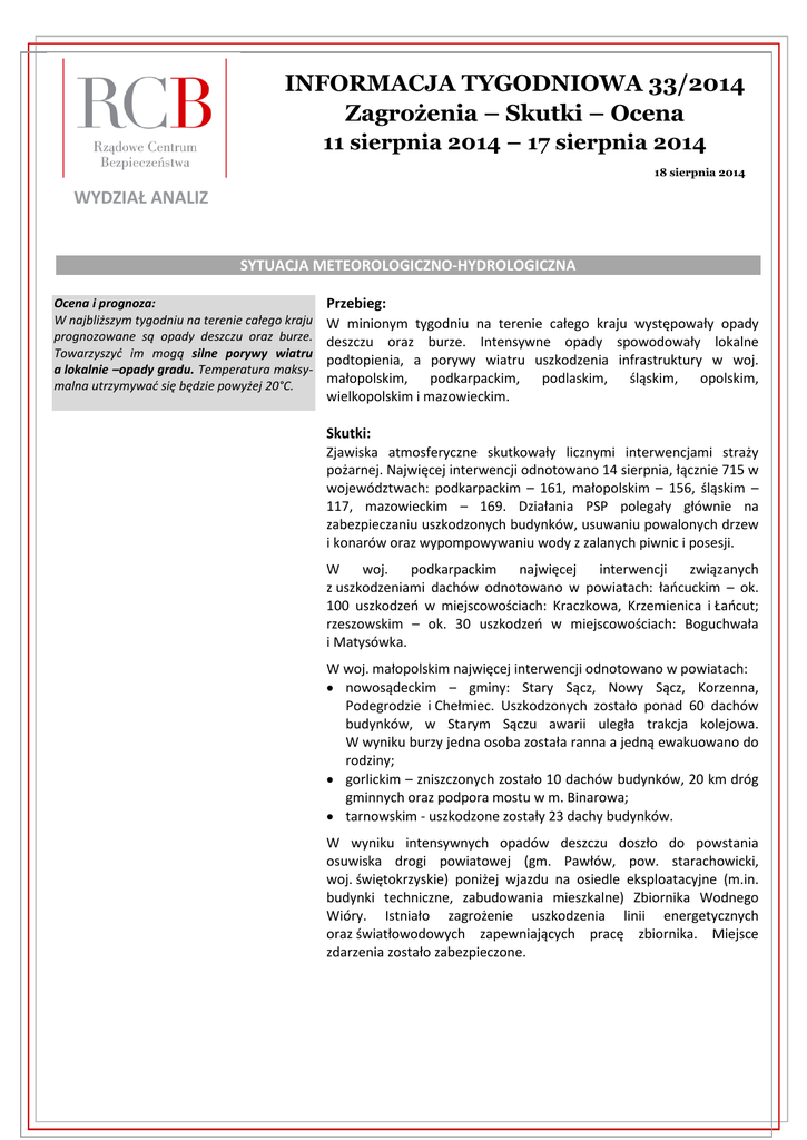 INFORMACJA TYGODNIOWA 33/2014 Zagrożenia – Skutki – Ocena 11 sierpnia 2014 – 17 sierpnia 2014 18 sierpnia 2014 WYDZIAŁ ANALIZ SYTUACJA METEOROLOGICZNO-HYDROLOGICZNA Ocena i prognoza: W najbliższym tygodniu na terenie całego kraju prognozowane są opady deszczu oraz burze. Towarzyszyć im mogą silne porywy wiatru a lokalnie –opady gradu. Temperatura maksymalna utrzymywać się będzie powyżej 20°C. Przebieg: W minionym tygodniu na terenie całego kraju występowały opady deszczu oraz burze. Intensywne opady spowodowały lokalne podtopienia, a porywy wiatru uszkodzenia infrastruktury w woj. małopolskim, podkarpackim, podlaskim, śląskim, opolskim, wielkopolskim i mazowieckim. Skutki: Zjawiska atmosferyczne skutkowały licznymi interwencjami straży pożarnej. Najwięcej interwencji odnotowano 14 sierpnia, łącznie 715 w województwach: podkarpackim – 161, małopolskim – 156, śląskim – 117, mazowieckim – 169. Działania PSP polegały głównie na zabezpieczaniu uszkodzonych budynków, usuwaniu powalonych drzew i konarów oraz wypompowywaniu wody z zalanych piwnic i posesji. W woj. podkarpackim najwięcej interwencji związanych z uszkodzeniami dachów odnotowano w powiatach: łańcuckim – ok. 100 uszkodzeń w miejscowościach: Kraczkowa, Krzemienica i Łańcut; rzeszowskim – ok. 30 uszkodzeń w miejscowościach: Boguchwała i Matysówka. W woj. małopolskim najwięcej interwencji odnotowano w powiatach: nowosądeckim – gminy: Stary Sącz, Nowy Sącz, Korzenna, Podegrodzie i Chełmiec. Uszkodzonych zostało ponad 60 dachów budynków, w Starym Sączu awarii uległa trakcja kolejowa. W wyniku burzy jedna osoba została ranna a jedną ewakuowano do rodziny; gorlickim – zniszczonych zostało 10 dachów budynków, 20 km dróg gminnych oraz podpora mostu w m. Binarowa; tarnowskim - uszkodzone zostały 23 dachy budynków. W wyniku intensywnych opadów deszczu doszło do powstania osuwiska drogi powiatowej (gm. Pawłów, pow. starachowicki, woj. świętokrzyskie) poniżej wjazdu na osiedle eksploatacyjne (m.in. budynki techniczne, zabudowania mieszkalne) Zbiornika Wodnego Wióry. Istniało zagrożenie uszkodzenia linii energetycznych oraz światłowodowych zapewniających pracę zbiornika. Miejsce zdarzenia zostało zabezpieczone. INFORMACJA TYGODNIOWA 11.08.2014 – 17.08. 2014 OCENA AKTUALNEJ I PROGNOZOWANEJ SYTUACJI HYDROLOGICZNO-METEOROLOGICZNEJ NA OKRES 30 DNI Wyjściowy stan warunków hydrologicznych w rzekach Przymorza, w dorzeczu Odry oraz w dorzeczu górnej i dolnej Wisły ocenia się jako korzystny ze względu na małe zagrożenie powodziowe. Na lewobrzeżnych dopływach górnej i środkowej Wisły sytuacja jest niekorzystna z uwagi na podwyższone poziomy wód. Miesięczna suma opadów i liczba dni z opadem kształtować się będą w normie, natomiast temperatura powietrza powyżej normy. Na rzekach spodziewane są wahania i okresowe wzrosty stanów wód głównie w strefie wody średniej, miejscami wysokiej. Ze względu na utrzymujące się w większości rzek korzystne warunki hydrologiczne, ryzyko wystąpienia powodzi ocenia się jako niskie. Sytuacja może okresowo pogarszać się w wyniku wystąpienia intensywnych opadów, w tym o charakterze burzowym, powodujących miejscowe, gwałtowne wzrosty stanów wody, szczególnie w górnych i środkowych dorzeczach Wisły i Odry. Możliwe są tam lokalne podtopienia. OSUWISKA W GMINIE MSZANA DOLNA Ocena: Wyodrębnione osuwiska skutkują lub mogą skutkować uszkodzeniem infrastruktury. Wiąże się to ze znacznymi utrudnieniami dla mieszkańców. Wszystkie zlokalizowane są na terenie miejscowości Kasinka Mała. Przebieg: Państwowy Instytut Geologiczny poinformował o zaobserwowaniu osuwisk w gminie Mszana Dolna (pow. limanowski, woj. małopolskie) po opadach, które wystąpiły na tym obszarze w nocy z 5/6 sierpnia br. Według ustaleń terenowych, w obrębie gminy powstało kilkadziesiąt osuwisk, w większości płytkich, zwietrzelinowych o niewielkim zasięgu. Skutki: Jedno z osuwisk przyczyniło się do uszkodzenia drogi gminnej, co utrudnia dojazd do 12 gospodarstw (osiedle Kanie-Bydłonie). Z informacji przekazanej przez WCZK w Krakowie wynika, że dojazd niewielkich samochodów (w tym karetek pogotowia) jest możliwy. Zerwany fragment drogi przylega do miejsca, w którym planowana jest budowa mostu. Uszkodzony odcinek ma być poprawiony w czasie montażu ww. obiektu. WYBUCH W ZAKŁADACH AZOTOWYCH (WOJ. OPOLSKIE) Ocena: Miejsce wypadku zostało zabezpieczone. Pozostała część zakładu pracuje normlanie. Okolicznym mieszkańcom nie zagraża niebezpieczeństwo. Przebieg: W zakładach azotowych w m. Kędzierzyn-Koźle (woj. opolskie) doszło do wybuchu i pożaru instalacji przesyłającej wodór. Pożar ugaszono. W akcji brało udział 10 zastępów PSP. Skutki: Według informacji Wojewódzkiego Centrum Zarządzania Kryzysowego 8 osób zostało poszkodowanych, z czego dwie przetransportowano do szpitala. Uszkodzeniu uległa infrastruktura przesyłowa oraz budynek znajdujący się w pobliżu. Rządowe Centrum Bezpieczeństwa Al. Ujazdowskie 5, 00-583 Warszawa | tel./fax +48 22 236 59 75 [email protected] | www . r c b . g o v . p l 2 INFORMACJA TYGODNIOWA 11.08.2014 – 17.08. 2014 OŚWIADCZENIE INSPEKCJI SANITARNEJ W ZWIĄZKU Z POWROTEM GRUPY LICEALISTÓW Z REGIONU ZAGROŻONEGO WIRUSEM EBOLA Ocena: Państwowa Inspekcja Sanitarna zdecydowanie odradza wyjazdy do państw, na terenie których występują zachorowania na gorączkę krwotoczną Ebola, tj. do Gwinei, Liberii, Sierra Leone i Nigerii. Rekomendację „nie podróżuj” odnośnie tych krajów podtrzymuje także Ministerstwo Spraw Zagranicznych. Zgodnie z oceną WHO, obecna sytuacja związana z rozprzestrzenianiem się zakażenia jest najgroźniejszą epidemią gorączki krwotocznej Ebola od czasu odkrycia wirusa w 1976 r. i stanowi zagrożenie dla innych państw. Możliwe konsekwencje potencjalnego przenoszenia się wirusa w skali między
