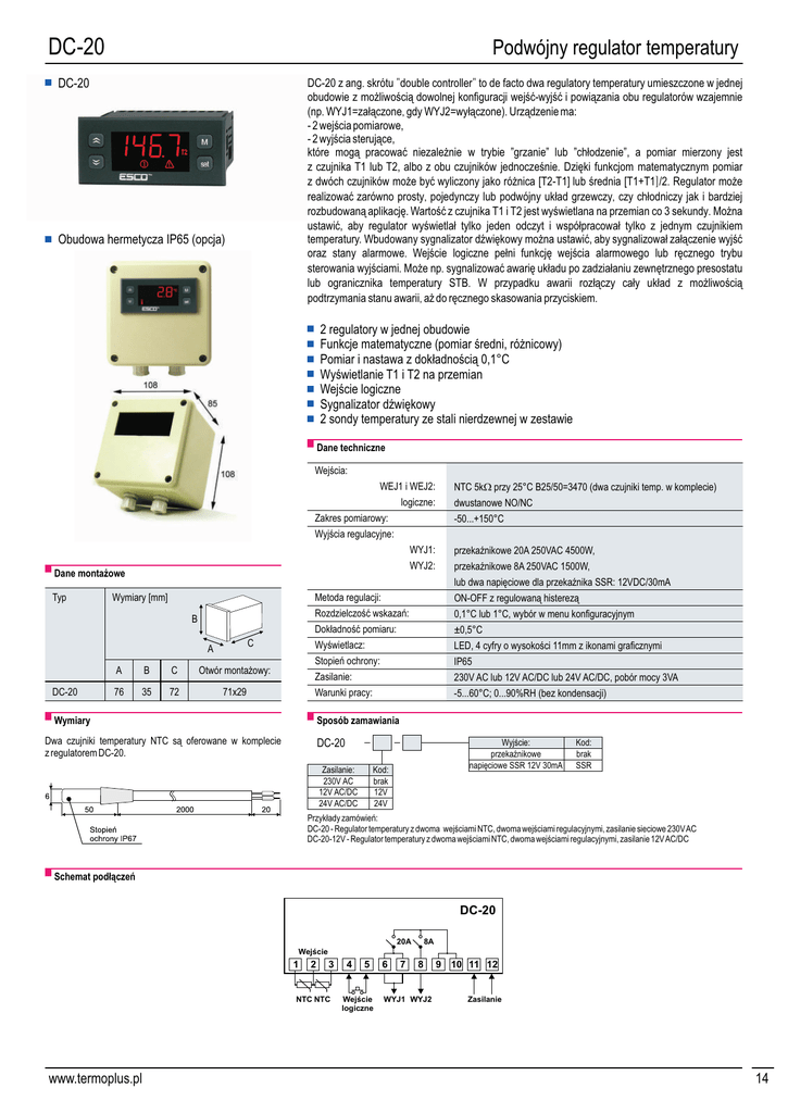 DC-20 Podwójny regulator temperatury DC-20 z ang. skrótu "double controller" to de facto dwa regulatory temperatury umieszczone w jednej obudowie z możliwością dowolnej konfiguracji wejść-wyjść i powiązania obu regulatorów wzajemnie (np. WYJ1=załączone, gdy WYJ2=wyłączone). Urządzenie ma: - 2 wejścia pomiarowe, - 2 wyjścia sterujące, które mogą pracować niezależnie w trybie ”grzanie” lub ”chłodzenie”, a pomiar mierzony jest z czujnika T1 lub T2, albo z obu czujników jednocześnie. Dzięki funkcjom matematycznym pomiar z dwóch czujników może być wyliczony jako różnica [T2-T1] lub średnia [T1+T1]/2. Regulator może realizować zarówno prosty, pojedynczy lub podwójny układ grzewczy, czy chłodniczy jak i bardziej rozbudowaną aplikację. Wartość z czujnika T1 i T2 jest wyświetlana na przemian co 3 sekundy. Można ustawić, aby regulator wyświetlał tylko jeden odczyt i współpracował tylko z jednym czujnikiem temperatury. Wbudowany sygnalizator dźwiękowy można ustawić, aby sygnalizował załączenie wyjść oraz stany alarmowe. Wejście logiczne pełni funkcję wejścia alarmowego lub ręcznego trybu sterowania wyjściami. Może np. sygnalizować awarię układu po zadziałaniu zewnętrznego presostatu lub ogranicznika temperatury STB. W przypadku awarii rozłączy cały układ z możliwością podtrzymania stanu awarii, aż do ręcznego skasowania przyciskiem. DC-20 Obudowa hermetycza IP65 (opcja) 2 regulatory w jednej obudowie Funkcje matematyczne (pomiar średni, różnicowy) Pomiar i nastawa z dokładnością 0,1°C Wyświetlanie T1 i T2 na przemian Wejście logiczne Sygnalizator dźwiękowy 2 sondy temperatury ze stali nierdzewnej w zestawie Dane techniczne Wejścia: WEJ1 i WEJ2: logiczne: Zakres pomiarowy: Wyjścia regulacyjne: WYJ1: WYJ2: Dane montażowe Typ Metoda regulacji: Rozdzielczość wskazań: Dokładność pomiaru: Wyświetlacz: Stopień ochrony: Zasilanie: Warunki pracy: Wymiary [mm] B C A DC-20 A B C Otwór montażowy: 76 35 72 71x29 Wymiary NTC 5kW przy 25°C B25/50=3470 (dwa czujniki temp. w komplecie) dwustanowe NO/NC -50...+150°C przekaźnikowe 20A 250VAC 4500W, przekaźnikowe 8A 250VAC 1500W, lub dwa napięciowe dla przekaźnika SSR: 12VDC/30mA ON-OFF z regulowaną histerezą 0,1°C lub 1°C, wybór w menu konfiguracyjnym ±0,5°C LED, 4 cyfry o wysokości 11mm z ikonami graficznymi IP65 230V AC lub 12V AC/DC lub 24V AC/DC, pobór mocy 3VA -5...60°C; 0...90%RH (bez kondensacji) Sposób zamawiania Dwa czujniki temperatury NTC są oferowane w komplecie z regulatorem DC-20. DC-20 Zasilanie: 230V AC 12V AC/DC 24V AC/DC Wyjście: przekaźnikowe napięciowe SSR 12V 30mA Kod: brak 12V 24V Kod: brak SSR Przykłady zamówień: DC-20 - Regulator temperatury z dwoma wejściami NTC, dwoma wejściami regulacyjnymi, zasilanie sieciowe 230V AC DC-20-12V - Regulator temperatury z dwoma wejściami NTC, dwoma wejściami regulacyjnymi, zasilanie 12V AC/DC Schemat podłączeń DC-20 8A 20A Wejście 1 2 3 NTC NTC www.termoplus.pl 4 5 Wejście logiczne 6 7 8 WYJ1 WYJ2 9 10 11 12 Zasilanie 14