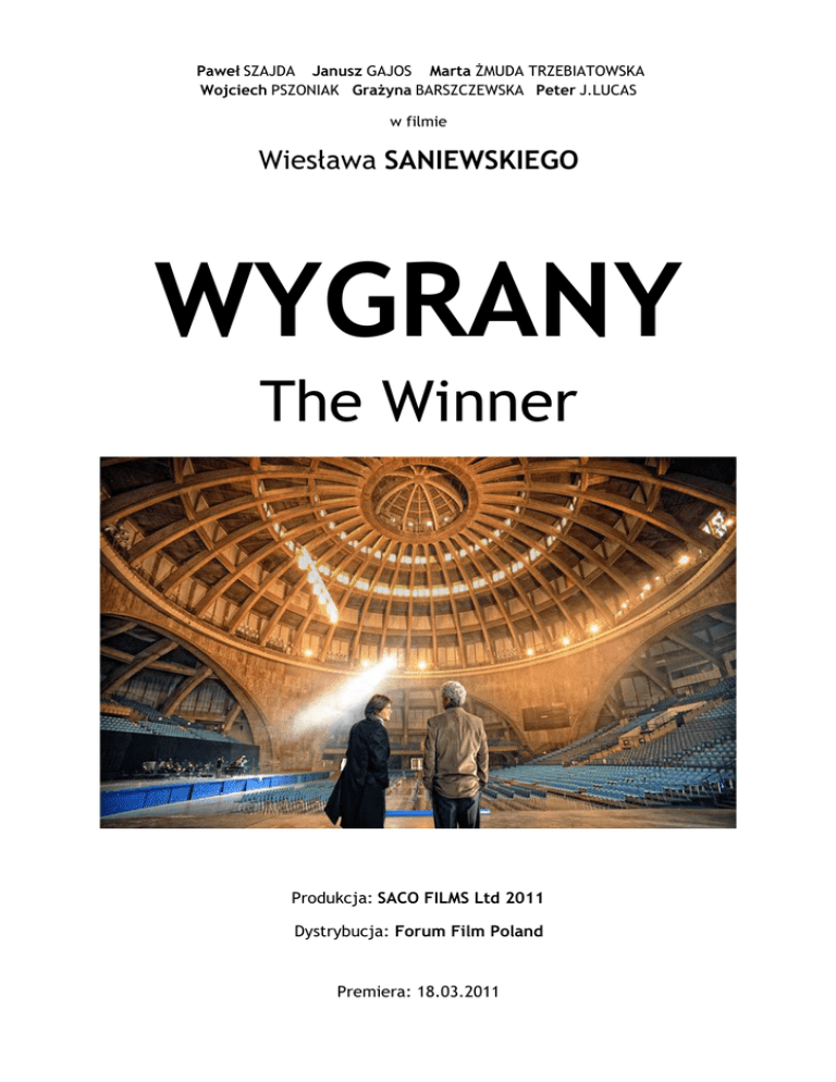 Paweł SZAJDA Janusz GAJOS Marta ŻMUDA TRZEBIATOWSKA Wojciech PSZONIAK Grażyna BARSZCZEWSKA Peter J.LUCAS w filmie Wiesława SANIEWSKIEGO WYGRANY The Winner Produkcja: SACO FILMS Ltd 2011 Dystrybucja: Forum Film Poland Premiera: 18.03.2011 WYGRANY (The Winner) TWÓRCY Reżyseria Scenariusz Zdjęcia Scenografia Montaż Muzyka Dźwięk Kostiumy Charakteryzacja Wiesław Saniewski Wiesław Saniewski Piotr Kukla, Piotr Sobociński jr Grażyna Molska Jarosław Barzan Carlos Libedinsky Paweł Łuczyc-Wyhowski Anna Szyszka Beata Matuszczak Konsultacja muzyczna Janusz Olejniczak, Witold Witkowski, Marek Dyżewski Producent Grażyna Molska OBSADA Oliver Frank Profesor Karloff Pani Linovsky Kornelia Maurice Boisset Max Runyon Jack Goretzky, syn Franka wnuczka Franka Jowita ksiądz Andrzej Profesor Wittek Dyrektor Henryk Paweł Szajda Janusz Gajos Wojciech Pszoniak Grażyna Barszczewska Marta Żmuda Trzebiatowska Peter J.Lucas Wenanty Nosul Andrzej Krukowski Anna Podolak Adelajda Konieczna Robert Gonera Marek Frąckowiak Robert Moskwa Lech Mackiewicz PRODUCENT: SACO FILMS Ltd. KOPRODUKCJA: THE SOCIETY FOR ARTS (USA), ANDRZEJ NIŻNIK (SZWAJCARIA), ODRA FILM, ARCHI-PROJEKT,TOYA STUDIOS, DIVIZION, WFDiF, EQUUS POLSKA, BBF INVESTMENTS. Film jest współfinansowany przez POLSKI INSTYTUT SZTUKI FILMOWEJ DYSTRYBUCJA: FORUM FILM POLAND PREMIERA: 18.03.2011 WYGRANY (The Winner) Polsko-amerykańska koprodukcja w reżyserii Wiesława Saniewskiego, z gwiazdorską obsadą (Paweł Szajda, Janusz Gajos, Marta Żmuda Trzebiatowska, Wojciech Pszoniak, Grażyna Barszczewska, Peter J. Lucas, Robert Gonera). Zrealizowana z rozmachem historia młodego pianisty, który straciwszy wszystko, dzięki przypadkowemu spotkaniu z byłym profesorem matematyki i namiętnym graczem na wyścigach konnych, odnajduje swoją życiową drogę i spotyka miłość. Doskonałą grę aktorów uzupełnia ścieżka dźwiękowa, w której obok utworów Chopina oraz elektryzującego tanga Carlosa Libedinsky’ego znalazły się także trzy przeboje Elvisa Presleya. STRESZCZENIE Oliver (Paweł Szajda), młody amerykański pianista polskiego pochodzenia, nie wytrzymując presji matki i wyrachowanego agenta, po rozstaniu z żoną przyjeżdża do Polski, gdzie zrywa europejskie tournée. Traci wszystko: miłość, uznanie i świetnie zapowiadającą się karierę, ma przy tym do spłacenia olbrzymi dług. W hotelowym barze spotyka Franka (Janusz Gajos), byłego profesora matematyki, namiętnego gracza i znawcę wyścigów konnych. Dzięki niemu pianista poznaje Kornelię (Marta Żmuda Trzebiatowska), piękną, nieco tajemniczą kobietę, która staje mu się coraz bliższa. Frank wprowadza także Olivera w świat swojej pasji, pokazuje, że można żyć "po swojemu". Dzięki niemu chłopak odzyskuje wiarę w siebie. W czasie pobytu na wyścigach w Baden-Baden młody Amerykanin spotyka światowej sławy jurora konkursów pianistycznych, prof. Karloffa (Wojciech Pszoniak). Juror wyjawia Oliverowi, że to on zabrał mu zwycięstwo w Konkursie Chopinowskim w Warszawie. Teraz proponuje mu układ, który wyniesie go na pianistyczne szczyty. Czy młody pianista ulegnie pokusie? WIESŁAW SANIEWSKI - reżyser i autor scenariusza o swoim filmie „Wygrany” to film o tym, co w życiu każdego człowieka najważniejsze, o czym bardzo często zdarza nam się zapominać, i o tym co każdego z nas uskrzydla – realizowaniu własnych marzeń. To także film o ściganiu się w życiu i sztuce – historia wybitnego młodego pianisty, który odrzucając szansę na wielką karierę, wygrywa. Świat muzyki a właściwie świat konkursów, będący naturalnym środowiskiem Olivera, pokazany jest tu od strony nieznanej kinowej publiczności. Zostaje brutalnie odarty z romantycznego mitu i skontrastowany ze światem wyścigów konnych (świat Franka). Ten ostatni jest tą przestrzenią, w której spełniają się marzenia, gdzie niemożliwe staje się możliwe. „Wygrany” to jednak przede wszystkim opowieść o ludziach: bezinteresowności i przyjaźni,odnajdywaniu miłości i o marzeniach. ROZMOWA Z WIESŁAWEM SANIEWSKIM Jak zrodził się pomysł na scenariusz „Wygranego”? Czy tekst zawiera wątki autobiograficzne? W.S.: W 1989 roku zostałem zaproszony z filmami „Nadzór” i „Dotknięci” do Chicago, na pierwszy Festiwal Filmu Polskiego w Ameryce. Z pomysłodawcą i gospodarzem imprezy Krzysztofem Kamyszewem rozmawiałem o moich pomysłach na następny film. Opowiadałem mu też o mojej „końskiej” pasji. Dzieliliśmy się refleksjami na temat naszych doświadczeń z udziałem w jury różnych konkursów, w których ścigali się artyści. Zgodziliśmy się, że warto kiedyś zrobić o tym film. Wkrótce Krzysztof, przyszły koproducent „Wygranego”, zorganizował mi w Stanach stypendium, bym mógł napisać scenariusz. W 1991 roku powstała jego pierwsza wersja. Scenariusz powstał więc 20 lat temu. Czy od tamtej pory uległ ewolucji, czy też pozostał bez większych zmian? W.S.: Nad tekstem pracuję do ostatniej chwili, nawet tuż przed samym ujęciem. Powstało kilka wersji scenariusza, lecz jego idea, konstrukcja, główni bohaterowie – to wszystko pozostało bez zmian. Czy, podobnie jak w „Dotkniętych” i „Bezmiarze sprawiedliwości”, opowiadana przez pana historia czerpała z rzeczywistości? Jeśli tak, na ile znalazło to odbicie w filmie? W.S.: Znakomity polski tenisista Władysław Skonecki, który słynął z precyzji w grze i zaskakujących rozwiązań taktycznych, po zakończeniu kariery wyjechał do Austrii. Ponieważ był miłośnikiem wyścigów konnych, nieraz próbował gry na torach Austrii i Niemiec. Często z pozytywnym skutkiem. To on powiedział, że na polskich koniach, które biorą udział w wyścigach na Zachodzie, można wygrać duże pieniądze. Dlaczego? Bo polskich koni nikt nie obstawia, stąd wysokie wypłaty. Z tego, co wiem, jeździł na tory, gdzie miały startować nasze konie. Pewnego razu prze