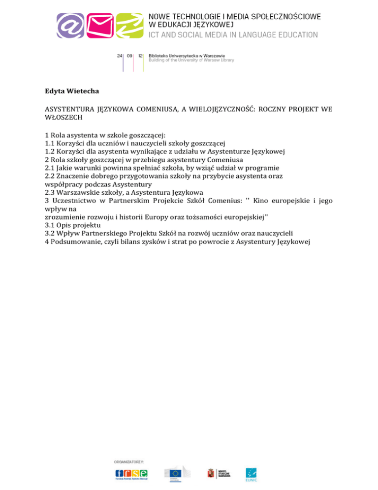 Edyta Wietecha ASYSTENTURA JĘZYKOWA COMENIUSA, A WIELOJĘZYCZNOŚĆ: ROCZNY PROJEKT WE WŁOSZECH 1 Rola asystenta w szkole goszczącej: 1.1 Korzyści dla uczniów i nauczycieli szkoły goszczącej 1.2 Korzyści dla asystenta wynikające z udziału w Asystenturze Językowej 2 Rola szkoły goszczącej w przebiegu asystentury Comeniusa 2.1 Jakie warunki powinna spełniać szkoła, by wziąć udział w programie 2.2 Znaczenie dobrego przygotowania szkoły na przybycie asystenta oraz współpracy podczas Asystentury 2.3 Warszawskie szkoły, a Asystentura Językowa 3 Uczestnictwo w Partnerskim Projekcie Szkół Comenius: '' Kino europejskie i jego wpływ na zrozumienie rozwoju i historii Europy oraz tożsamości europejskiej'' 3.1 Opis projektu 3.2 Wpływ Partnerskiego Projektu Szkół na rozwój uczniów oraz nauczycieli 4 Podsumowanie, czyli bilans zysków i strat po powrocie z Asystentury Językowej