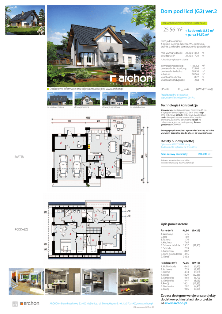Dom pod liczi (G2) ver.2 Pełnobranżowe odbicie lustrzane 125,56 m2 + kotłownia8,82 m2 + garaż34,52 m2 Dom jednorodzinny 4 pokoje, kuchnia, łazienka, WC, kotłownia, pralnia, garderoby, pomieszczenie gospodarcze min. wymiary działki: 21,32 x 18,52 m po adaptacji:* 21,32 x 17,24 m *Likwidacja wykusza w salonie. powierzchnia podłóg: powierzchnia zabudowy: powierzchnia dachu: kubatura: wysokość budynku: wysokość kondygnacji: Dodatkowe informacje oraz zdjęcia z realizacji na www.archon.pl EP = 89 (188,40) 125,08 205,30 802,65 8,27 2,68 EUCO = 42 m2 m2 m2 m3 m m [kWh/(m2·rok)] Projekt zgodny z NOWYMI Warunkami Technicznymi 2017 r. elewacja wejściowa elewacja boczna elewacja ogrodowa elewacja boczna Technologia i konstrukcja ściany zewn.: pustak ceramiczny Porotherm 25 cm + styropian Termo Organika 20 cm + tynk; strop: płyta żelbetowa; schody: żelbetowe, dwubiegowe; dach: dwuspadowy, nachylenie 40 st., więźba drewniana, dachówka ceramiczna; kocioł: na paliwo stałe + alternatywnie gazowy; brama garażowa: HÖRMANN Do tego projektu możesz wprowadzić zmiany, na które wyrazimy bezpłatną zgodę. Więcej na www.archon.pl Koszty budowy (netto) Tylko u nas RZECZYWISTE koszty budowy netto wyliczone na IV kw. 2016 Stan surowy zamknięty: PARTER 206 700 zł Pobierz zestawienie materiałów i dane do kalkulacji z www.archon.pl Opis pomieszczeń: PODDASZE 96,84 (99,22) Parter (m2) 1. Wiatrołap 5,35 2. Hol 1,69 3. Toaleta 1,76 4. Kuchnia 7,65 5. Salon + Jadalnia 29,57 (31,95) 6. Schody 2,93 7. Kotłownia 8,82 8. Pom. gospodarcze 4,55 9. Garaż 34,52 Poddasze (m2) 1. Hol i schody 2. Łazienka 3. Pralnia 4. Pokój 5. Garderoba 6. Garderoba 7. Pokój 8. Garderoba 9. Pokój ISO 9001 ARCHON+ Biuro Projektów, 32-400 Myślenice, ul. Słowackiego 86, tel. 12 37 21 900, www.archon.pl Plik utworzono: 2017-02-02 72,06 (89,18) 6,42 (6,42) 7,53 (8,92) 4,43 (5,05) 18,29 (22,36) 4,84 (6,70) 4,47 (8,05) 14,21 (17,35) 2,82 (4,43) 9,05 (9,90) Zobacz dostępne wersje oraz projekty dodatkowych instalacji do projektu na www.archon.pl