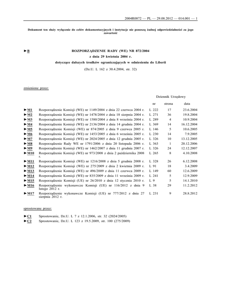 2004R0872 — PL — 29.08.2012 — 014.001 — 1 Dokument ten służy wyłącznie do celów dokumentacyjnych i instytucje nie ponoszą żadnej odpowiedzialności za jego zawartość ROZPORZĄDZENIE RADY (WE) NR 872/2004 ►B z dnia 29 kwietnia 2004 r. dotyczące dalszych środków ograniczających w odniesieniu do Liberii (Dz.U. L 162 z 30.4.2004, str. 32) zmienione przez: Dziennik Urzędowy nr ►M1 ►M2 ►M3 ►M4 ►M5 ►M6 ►M7 ►M8 ►M9 ►M10 ►M11 ►M12 ►M13 ►M14 ►M15 ►M16 ►M17 Rozporządzenie Komisji (WE) nr 1149/2004 z dnia 22 czerwca 2004 r. Rozporządzenie Komisji (WE) nr 1478/2004 z dnia 18 sierpnia 2004 r. Rozporządzenie Komisji (WE) nr 1580/2004 z dnia 8 września 2004 r. Rozporządzenie Komisji (WE) nr 2136/2004 z dnia 14 grudnia 2004 r. Rozporządzenie Komisji (WE) nr 874/2005 z dnia 9 czerwca 2005 r. Rozporządzenie Komisji (WE) nr 1453/2005 z dnia 6 września 2005 r. Rozporządzenie Komisji (WE) nr 2024/2005 z dnia 12 grudnia 2005 r. Rozporządzenie Rady WE nr 1791/2006 z dnia 20 listopada 2006 r. Rozporządzenie Komisji (WE) nr 1462/2007 z dnia 11 grudnia 2007 r. Rozporządzenie Komisji (WE) nr 973/2008 z dnia 2 października 2008 r. Rozporządzenie Komisji (WE) nr 1216/2008 z dnia 5 grudnia 2008 r. Rozporządzenie Komisji (WE) nr 275/2009 z dnia 2 kwietnia 2009 r. Rozporządzenie Komisji (WE) nr 496/2009 z dnia 11 czerwca 2009 r. Rozporządzenie Komisji (WE) nr 835/2009 z dnia 11 września 2009 r. Rozporządzenie Komisji (UE) nr 26/2010 z dnia 12 stycznia 2010 r. Rozporządzenie wykonawcze Komisji (UE) nr 116/2012 z dnia 9 lutego 2012 r. Rozporządzenie wykonawcze Komisji (UE) nr 777/2012 z dnia 27 sierpnia 2012 r. sprostowane przez: ►C1 ►C2 Sprostowanie, Dz.U. L 7 z 12.1.2006, str. 32 (2024/2005) Sprostowanie, Dz.U. L 123 z 19.5.2009, str. 100 (275/2009) strona data L L L L L L L L L L 222 271 289 369 146 230 326 363 326 265 17 36 4 14 5 14 10 1 24 8 23.6.2004 19.8.2004 10.9.2004 16.12.2004 10.6.2005 7.9.2005 13.12.2005 20.12.2006 12.12.2007 4.10.2008 L L L L L L 328 91 149 241 9 38 26 18 60 5 5 29 6.12.2008 3.4.2009 12.6.2009 12.9.2009 14.1.2010 11.2.2012 L 231 9 28.8.2012 2004R0872 — PL — 29.08.2012 — 014.001 — 2 ▼B ROZPORZĄDZENIE RADY (WE) NR 872/2004 z dnia 29 kwietnia 2004 r. dotyczące dalszych środków ograniczających w odniesieniu do Liberii RADA UNII EUROPEJSKIEJ, uwzględniając Traktat ustanawiający Wspólnotę Europejską, w szcze gólności jego art. 60 i 301, uwzględniając wspólne stanowisko Rady 2004/487/WPZiB z dnia 29 kwietnia 2004 r. dotyczące zamrożenia funduszy byłego prezydenta Liberii Charlesa Taylora oraz osób i podmiotów z nim związanych (1), uwzględniając wniosek Komisji, a także mając na uwadze, co następuje: (1) Dnia 10 lutego 2004 r. Rada, po przyjęciu przez Radę Bezpieczeństwa Organizacji Narodów Zjednoczonych rezolucji 1521 (2003) określającej zrewidowane środki działania w odnie sieniu do Liberii w celu uwzględnienia rozwoju sytuacji w Liberii, a w szczególności odejścia byłego prezydenta Charlesa Taylora, oraz po przyjęciu przez Radę wspólnego stanowiska 2004/137/WPZiB z dnia 10 lutego 2004 r. dotyczącego środków restrykcyjnych skierowanych przeciwko Liberii (2), przyjęła rozporządzenie 234/2004 nakładające środki ograniczające w odniesieniu do Liberii (3). (2) Rezolucja RB ONZ 1532 (2004) z dnia 12 marca 2004 r. przewiduje, że fundusze i zasoby gospodarcze będące w posiadaniu lub pod kontrolą byłego prezydenta Liberii Charlesa Taylora, Jwella Howarda Taylora i Charlesa Taylora Jr, innych najbliższych członków jego rodziny, jego byłych wyższych urzędników oraz innych bliskich współpracowników i osoby go wspierające wskazane przez Komitet Rady Bezpieczeństwa ustanowiony na mocy ust. 21 rezolucji RB ONZ 1521 (2003) powinny zostać zamrożone. (3) Działania i polityki byłego prezydenta Liberii Charlesa Taylora oraz innych osób, a w szczególności zubożenie zasobów Liberii i ich wyprowadzenie z tego kraju oraz kradzież funduszy i własności Liberii, utrudniły Liberii przejście do demokracji i właściwy rozwój jej politycznych, administracyjnych i gospo darczych instytucji i zasobów. (4) Z uwagi na negatywny wpływ, jaki ma na Liberię transfer za granicę sprzeniewierzonych funduszy i aktywów oraz wykorzy stywanie tych funduszy przez Charlesa Taylora i osób go wspie rających dla osłabiania pokoju i stabilności w Liberii i w regionie, konieczne jest zamrożenie funduszy należących do Charlesa Taylora i osób go wspierających. (5) Wspólne stanowisko 2004/487/WPZiB przewiduje zamrożenie funduszy i zasobów gospodarczych należących do byłego prezydenta Liberii Charlesa Taylora i członków jego najbliższej rodziny, jego byłych wyższych urzędników i innych bliskich współpracowników i osób go wspierających. (1) Dz.U. L 162 z 30.4.2004, str. 116. (2) Dz.U. L 40 z 12.2.2004, str. 35. (3) Dz.U. L 40 z 12.2.2004, str. 1. 2004R0872 — PL — 29.08.2012 — 014.001 — 3 ▼B (6) Środki te objęte są zakresem Traktatu i z tego powodu, w celu uniknięcia jakiegokolwiek zakłócenia konkurencji, konieczne jest prawodawstwo wspólnotowe, aby wykonać je w zakresie, w jakim dotyczy to Wspólnoty. Do celów niniejszego rozporządzenia terytorium Wspólnoty obejmuje wszystkie terytoria Państw Członkowskich, w których stosuje się postano wienia Traktatu, zgodnie z warunkami ustanowionymi w tym Traktacie. (7) Wspólne stanowisko 2004/487/WPZiB przewiduje również możliwość przyznania określonych wyłączeń z wymogu zamrożenia z przyczyn humanitarnych, w celu spłacenia zastawu lub wykonania orzeczenia wydanego przed uchwaleniem rezolucji RB ONZ 1532 (2004). (8) Rada Bezpieczeństwa ONZ wyraziła swój zamiar rozpatrzenia, czy i w jaki sposób umożliwić rządowi Liberii korzystanie z funduszy i zasobów gospodarczych zamrożonych na mocy rezolucji RB ONZ 1532 (2004) po ustanowieniu przez ten rząd przejrzystego mech