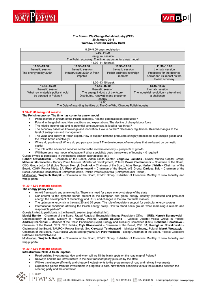 The Forum: We Change Polish Industry (ZPP) 20 January 2016 Warsaw, Sheraton Warsaw Hotel 11.30–13.00 thematic session The energy policy 2050 8.30–9.00 guest registration 9.00–11.00 inaugural session The Polish economy. The time has come for a new model 11.00–11.30 break 11.30–13.00 11.30–13.00 thematic session thematic session Infrastructure 2020. A fresh Polish business in foreign impetus markets 11.30–13.00 thematic session Prospects for the defence sector and its impact on the Polish economy 13.00–13.45 break 13.45–15.30 13.45–15.30 thematic session thematic session The energy industry of the future. The industrial revolution – a trend and Distributed, renewable and prosumer a challenge energy 19.00 The Gala of awarding the titles of: The One Who Changes Polish Industry 13.45–15.30 thematic session What raw materials policy should be pursued in Poland? 9.00–11.00 inaugural session The Polish economy. The time has come for a new model Prime movers in growth of the Polish economy. Has the potential been exhausted? Poland in the global race. New ambitions and expectations. The decline of cheap labour force The middle income trap and its potential consequences. Is it still a real threat? The economy based on knowledge and innovation. How to do that? Necessary regulations. Desired changes at the level of enterprises and management The value and quality of Polish export. How to support both the producers of highly processed, high-margin goods and the Polish brand effectively? Where do you invest? Where do you pay your taxes? The development of enterprises that are based on domestic capital The role of the advanced services sector in the modern economy – prospects of growth Will there be a new model of education? What specialists does the new era of Industry 4.0 require? Guests invited to participate in the thematic session (alphabetical list): Robert Gwiazdowski – Chairman of the Board, Adam Smith Center; Zbigniew Jakubas – Owner, Multico Capital Group; Mateusz Morawiecki – Deputy Prime Minister, Minister of Development, Poland; Paweł Olechnowicz – Chairman of the Board, CEO, Grupa Lotos SA (Lotos Group); Henryk Siodmok – Chairman of the Board, Atlas Group; Herbert Wirth – Chairman of the Board, KGHM Polska Miedź SA; Piotr Wojciechowski – Chairman of the Board, WB Group; Dariusz Żuk – Chairman of the Board, Academic Incubators of Entrepreneurship, Polska Przedsiębiorcza (Entrepreneurial Poland) Moderation: Wojciech Kuśpik – Chairman of the Board, PTWP Group, Publisher of Economic Monthly of New Industry and wnp.pl portal 11.30–13.00 thematic session The energy policy 2050 An old framework and a new reality. There is a need for a new energy strategy of the state Our answer to the dynamic trends present in the European and global energy industry (distributed and prosumer energy, the development of technology and RES, and changes in the raw materials market) The optimum energy mix in the next 20 and 30 years. The role of regulatory support for particular energy sources International conditions affecting the Polish energy policy. How to stand one’s ground while remaining a reliable and responsible partner? Guests invited to participate in the thematic session (alphabetical list): Maciej Bando – Chairman of the Board, Urząd Regulacji Energetyki (Energy Regulatory Office – URE); Henryk Baranowski – Undersecretary of State, Ministry of Treasury, Poland; Gérard Bourland – General Director, Veolia Group in Poland; Andrzej Czerwiński – Member of the Polish Parliament (Sejm), Energy and Treasury Committee (ESK); Bohdana Horáčková – Chairman of the Board, CEO, CEZ Polska; Eryk Kłossowski – Chairman of the Board, PSE SA; Remigiusz Nowakowski – Chairman of the Board, TAURON Polska Energia SA; Krzysztof Tchórzewski – Minister of Energy, Poland; Marek Woszczyk – Chairman of the Board, PGE Polska Grupa Energetyczna SA; Piotr Woźniak – acting Chairman of the Board, Polskie Górnictwo Naftowe i Gazownictwo SA Moderation: Wojciech Kuśpik – Chairman of the Board, PTWP Group, Publisher of Economic Monthly of New Industry and wnp.pl portal 11.30–13.00 thematic session Infrastructure 2020. A fresh impetus Road-building investments: How and when will we fill the blank spots on the road map of Poland? Railways and the rail infrastructure in the new transport policy pursued by the state Will we travel more efficiently and cheaper? Adjustments to the programmes of road and railway investments Experience gained from the investments in progress to date. New tender principles versus the relations between the ordering party and the contractor The situation in the market of contractors, subcontractors and material suppliers There is a boom, but what next? Infrastructure maintenance and other activities to be performed after completion of EU investments Guests invited to participate in the thematic session (alphabetical list): Andrzej Adamczyk – Minister of Infrastructure and Construction, Poland; Jacek Bojarowicz – acting General Director, General Directorate for National Roads and Motorways (GDDKiA); Dariusz Blocher – Chairman of the Board, CEO, Budimex SA; Antoni Jasiński – Chairman of the Board, PKP Polskie Linie Kolejowe SA; Ernest Jelito – Chairman of the Board, CEO, Górażdże Cement SA; Krzysztof Niemiec – Deputy Chairman of the Board, Track Tec SA Group; Jerzy Szmit – Undersecretary of State, Ministry of Infrastructure and Construction, Poland; Alfred Watzl – Member of the Board, Strabag Sp. z o.o. Moderation: Jacek Ziarno – Deputy Editor-in-chief, Nowy Przemysł Economic Monthly 11.30–13.00 thematic session Polish business in foreign markets The competitiveness of Polish enterprises in foreign markets. Strengths and weaknesses. Global brands from Poland: Is it an attainable goal? Barriers to Polish investments in foreign markets. The knowledge capital. Risk factors and risk-mitigating methods. Direction