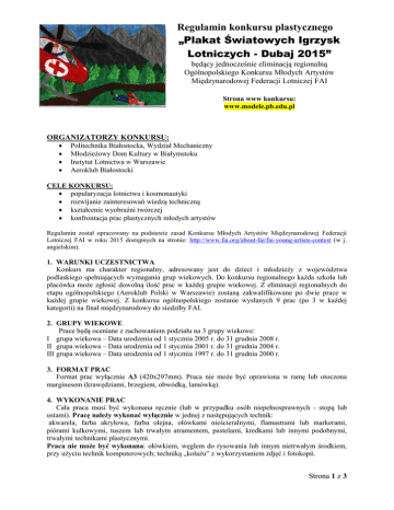 Regulamin konkursu plastycznego „Plakat Światowych Igrzysk Lotniczych - Dubaj 2015” będący jednocześnie eliminacją regionalną Ogólnopolskiego Konkursu Młodych Artystów Międzynarodowej Federacji Lotniczej FAI Strona www konkursu: www.modele.pb.edu.pl ORGANIZATORZY KONKURSU: Politechnika Białostocka, Wydział Mechaniczny Młodzieżowy Dom Kultury w Białymstoku Instytut Lotnictwa w Warszawie Aeroklub Białostocki CELE KONKURSU: popularyzacja lotnictwa i kosmonautyki rozwijanie zainteresowań wiedzą techniczną kształcenie wyobraźni twórczej konfrontacja prac plastycznych młodych artystów Regulamin został opracowany na podstawie zasad Konkursu Młodych Artystów Międzynarodowej Federacji Lotniczej FAI w roku 2015 dostępnych na stronie: http://www.fai.org/about-fai/fai-young-artists-contest (w j. angielskim). 1. WARUNKI UCZESTNICTWA Konkurs ma charakter regionalny, adresowany jest do dzieci i młodzieży z województwa podlaskiego spełniających wymagania grup wiekowych. Do konkursu regionalnego każda szkoła lub placówka może zgłosić dowolną ilość prac w każdej grupie wiekowej. Z eliminacji regionalnych do etapu ogólnopolskiego (Aeroklub Polski w Warszawie) zostaną zakwalifikowane po dwie prace w każdej grupie wiekowej. Z konkursu ogólnopolskiego zostanie wysłanych 9 prac (po 3 w każdej kategorii) na finał międzynarodowy do siedziby FAI. 2. GRUPY WIEKOWE Prace będą oceniane z zachowaniem podziału na 3 grupy wiekowe: I grupa wiekowa – Data urodzenia od 1 stycznia 2005 r. do 31 grudnia 2008 r. II grupa wiekowa – Data urodzenia od 1 stycznia 2001 r. do 31 grudnia 2004 r. III grupa wiekowa – Data urodzenia od 1 stycznia 1997 r. do 31 grudnia 2000 r. 3. FORMAT PRAC Format prac wyłącznie A3 (420x297mm). Praca nie może być oprawiona w ramę lub otoczona marginesem (krawędziami, brzegiem, obwódką, lamówką). 4. WYKONANIE PRAC Cała praca musi być wykonana ręcznie (lub w przypadku osób niepełnosprawnych - stopą lub ustami). Pracę należy wykonać wyłącznie w jednej z następujących technik: akwarela, farba akrylowa, farba olejna, ołówkami nieścieralnymi, flamastrami lub markerami, piórami kulkowymi, tuszem lub trwałym atramentem, pastelami, kredkami lub innymi podobnymi, trwałymi technikami plastycznymi. Praca nie może być wykonana: ołówkiem, węglem do rysowania lub innym nietrwałym środkiem, przy użyciu technik komputerowych; techniką „kolażu” z wykorzystaniem zdjęć i fotokopii. Strona 1 z 3 5. OZNAKOWANIE PRAC Należy wypełnić I cz. „Certyfikatu”, wpisując dane uczestnika. Formularz certyfikatu w załączeniu do niniejszego regulaminu (załącznik nr 1) 6. OŚWIADCZENIE AUTENTYCZNOŚCI Należy wypełnić i podpisać II cz. „Certyfikatu”, tzw. poświadczenie autentyczności. Poświadczenie musi być podpisane (imię, nazwisko, podpis) przez nauczyciela, rodzica lub opiekuna, albo inną właściwą osobę. ---------------------------------------------------------------------------------------------------------------------- PRAWIDŁOWO WYPEŁNIONY I PODPISANY CERTYFIKAT należy trwale przykleić na odwrocie pracy plastycznej ----------------------------------------------------------------------------------------------------------------------7. NADSYŁANIE PRAC Prace należy dostarczyć osobiście lub pocztą na adres: Młodzieżowy Dom Kultury w Białymstoku, ul. Warszawska 79A, 15-201 Białystok (z dopiskiem: konkurs plastyczny FAI) w nieprzekraczalnym terminie do dnia 6 lutego 2015 r. Uwaga!!!: Prace bez certyfikatu nie będą oceniane. 8. OCENA PRAC Oceny prac dokona Komisja Oceniająca, w skład której wejdą profesjonalni plastycy i przedstawiciele organizatorów konkursu. Ocenie podlegać będą: zgodność z tematem, pomysłowość, walory artystyczne, fantazja autora, zastosowana technika wykonania. Zwycięzcom w poszczególnych kategoriach przyznane zostaną nagrody i okolicznościowe dyplomy. Podziału nagród dokona Komisja Oceniająca, a jej werdykt będzie ostateczny i niepodważalny. Komisja wytypuje także po 2 prace w każdej kategorii do udziału w Ogólnopolskim Konkursie Młodych Artystów FAI. Oficjalne ogłoszenie wyników, wręczenie nagród i otwarcie wystawy konkursu regionalnego odbędzie się w sobotę 21 lutego 2015 r. o godz.10-tej w Hali Sportowej Politechniki Białostockiej, ul. Wiejska 41. Wyniki zostaną opublikowane do dnia 19.02.2015 na stronie www.mdk.bialystok.pl oraz www.modele.pb.edu.pl. Nadesłane prace przechodzą na własność organizatorów. XV Finał Ogólnopolski Konkursu Młodych Artystów FAI odbędzie się w dniu 10.03.2015 w Bemowskim Centrum Kultury w Warszawie. Strona 2 z 3 Interpretacja tematu na rok 2014 „Plakat Światowych Igrzysk Lotniczych – Dubaj 2015” (tłumaczenie z języka angielskiego ze strony http://www.fai.org/fai-young-artists-contest/theme Andrzej Łukaszewicz) W grudniu 2015 r najlepsi sportowcy – lotnicy z całego świata przybędą do Dubaju, Zjednoczone Emiraty Arabskie, aby wziąć udział w największym wydarzeniu sportów lotniczych na świecie: Igrzyskach Lotniczych Międzynarodowej Federacji Lotniczej FAI. W ciągu 12 dni, widzowie będą mogli korzystać ze specjalnych miejsc z fantastycznym widokiem na sztuczną wyspę o kształcie palmy (Palm Jumeirah) i panoramę Dubaju podczas oglądania światowej klasy zawodów i pokazów lotniczych, które wypełnią niebo olśniewający manewrami, jakie mogą odbywać się tylko nad ziemią. Samoloty i szybowce zadziwią publiczność wykonywaniem figur akrobacyjnych: pętli, beczek, nurkowaniem czy też w trakcie pokazów umiejętności samolotów startujących w rajdach nawigacyjnych. Nie zabraknie również pokazów modeli latających sterowanych radiowo, będą one wykonywać takie same obroty, pętle i nurkowania ale w znacznie mniejszym rozmiarze. Dodatkowo, na hali będą prezentowane loty modeli w rytm muzyki – Indoor Aero Musicals. Ludzie zobaczą rozsiane po niebie