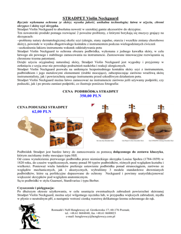 STRADPET Violin Neckguard Ręcznie wykonana ochrona ze skóry; wysoka jakość, unikalna technologia; łatwa w użyciu, chroni skrzypce i skórę szyi skrzypka. Stradpet Violin Neckguard to absolutna nowość w szerokiej gamie akcesoriów do skrzypiec. Ten nowatorski produkt pomaga rozwiązać 2 poważne problemy, z którymi borykają się muzycy grający na skrzypcach: −problemy natury dermatologicznej okolic szyi (alergie, stany zapalne, otarcia i wszelkie zmiany chorobowe skóry), powstałe w wyniku długotrwałego kontaktu z instrumentem podczas wielogodzinnych ćwiczeń −uszkodzenia lakieru instrumentu wskutek oddziaływania potu Stradpet Violin Neckguard to ochrona obszaru podbródka, wykonana z jednego kawałka skóry, w celu łatwego ale pewnego i stabilnego zamocowania na instrumencie. Zastosowane innowacyjne rozwiązania są chronione trzema patentami. Dzięki użyciu oryginalnej naturalnej skóry, Stradpet Violin Neckguard jest wygodny i przyjemny w zetknięciu z szyją oraz nie powoduje podrażnień naskórka i reakcji alergicznych. Stradpet Violin Neckguard pozwala na uniknięcie bezpośredniego kontaktu skóry szyi z instrumentem, podbródkiem i jego metalowymi elementami (śrubki mocujące), zabezpieczając zarówno wrażliwą skórę instrumentalisty, jak i powierzchnię samego instrumentu przed szkodliwym działaniem potu. Stradpet Violin Neckguard można łatwo zamocować na instrumencie zarówno jeśli używamy podpórki, czy poduszki, jak i po prostu zamiast podpórki, co ilustruje poniższa fotografia: CENA PODBRÓDKA STRADPET 350,00 PLN CENA PODUSZKI STRADPET 62,00 PLN Podbródek Stradpet jest bardzo łatwy do zamocowania za pomocą dołączonego do zestawu kluczyka, którym zaciskamy śruby mocujące typu Hill. Od czasu wynalezienia pierwszego podbródka przez niemieckiego skrzypka Louisa Spohra (1784-1859) w 1820 roku, do czasów współczesnych, mamy ponad 50 typów podbródków, różnych pod względem kształtu i wielkości. Ponieważ wielu lutników preferuje ustawienie podbródka ponad strunociągiem, zarówno ze względów mechanicznych, jak i akustycznych, wybraliśmy 3 modele standardowe drewnianych podbródków, które są perfekcyjne dopasowane do ochrony Neckguard i powinny usatysfakcjonować większość skrzypków pod względem anatomicznym. Są to podbródki w stylu Guarneri, Stardivarius i typu Berber. Czyszczenie i pielęgnacja: Po dłuższym okresie użytkowania, w celu usunięcia ewentualnych zabrudzeń powierzchni skórzanej Stradpet Violin Neckguard, można użyć wilgotnego ręcznika lub, w przypadku większych zabrudzeń, mydła w płynie o neutralnym pH, a następnie wetrzeć cienką warstwę delikatnego kremu ochronnego do rąk. Romuald i Nell Henglewscy ul. Grotkowska 17; 60-176 Poznań; tel. +48.61 8684848; fax +48.61 8680023 e-mail: [email protected]