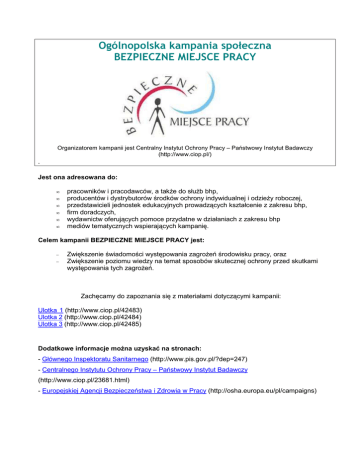 Ogólnopolska kampania społeczna BEZPIECZNE MIEJSCE PRACY Organizatorem kampanii jest Centralny Instytut Ochrony Pracy – Państwowy Instytut Badawczy (http://www.ciop.pl/) . Jest ona adresowana do: • • • • • • pracowników i pracodawców, a takŜe do słuŜb bhp, producentów i dystrybutorów środków ochrony indywidualnej i odzieŜy roboczej, przedstawicieli jednostek edukacyjnych prowadzących kształcenie z zakresu bhp, firm doradczych, wydawnictw oferujących pomoce przydatne w działaniach z zakresu bhp mediów tematycznych wspierających kampanię. Celem kampanii BEZPIECZNE MIEJSCE PRACY jest: − − Zwiększenie świadomości występowania zagroŜeń środowisku pracy, oraz Zwiększenie poziomu wiedzy na temat sposobów skutecznej ochrony przed skutkami występowania tych zagroŜeń. Zachęcamy do zapoznania się z materiałami dotyczącymi kampanii: Ulotka 1 (http://www.ciop.pl/42483) Ulotka 2 (http://www.ciop.pl/42484) Ulotka 3 (http://www.ciop.pl/42485) Dodatkowe informacje moŜna uzyskać na stronach: - Głównego Inspektoratu Sanitarnego (http://www.pis.gov.pl/?dep=247) - Centralnego Instytutu Ochrony Pracy – Państwowy Instytut Badawczy (http://www.ciop.pl/23681.html) - Europejskiej Agencji Bezpieczeństwa i Zdrowia w Pracy (http://osha.europa.eu/pl/campaigns)