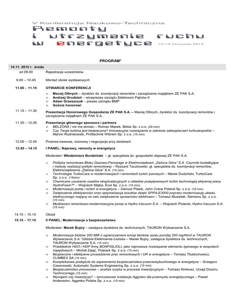 PROGRAM* 14.11. 2012 r. środa od 09.00 Rejestracja uczestników 9.00 – 10.45 Montaż stoisk wystawowych 11.00 – 11.15 OTWARCIE KONFERENCJI • • • • Maciej Olbrych – dyrektor ds. koordynacji remontów i zarządzania majątkiem ZE PAK S.A. Andrzej Grudzień – wiceprezes zarządu Elektrowni Pątnów II Adam Grzeszczuk – prezes zarządu BMP’ Goście honorowi 11.15 – 11.30 Prezentacja Honorowego Gospodarza ZE PAK S.A. – Maciej Olbrych, dyrektor ds. koordynacji remontów i zarządzania majątkiem ZE PAK S.A. 11.30 – 12.05 Prezentacje głównego sponsora i partnera • BELZONA i nie ma tematu – Roman Masek, Belse Sp. z o.o. (20 min) • Czy Twoja turbina jest bezpieczna? Innowacyjne rozwiązania w zakresie zabezpieczeń turbozespołów – Marcin Rudnikowski, Prϋftechnik Wibrem Sp. z o.o. (15 min) 12.05 – 12.45 Przerwa kawowa, rozmowy i negocjacje przy stoiskach 12.45 – 14.15 I PANEL: Naprawy, remonty w energetyce Moderator: Włodzimierz Burdziński – gł. specjalista ds. gospodarki olejowej ZE PAK S.A. • • • • • Polityka remontowa Bloku Gazowo-Parowego w Elektrociepłowni „Zielona Góra” S.A. Czynniki kształtujące i metody realizacji polityki remontowej – Ryszard Taczkowski, gł. specjalista ds. koordynacji remontów, Elektrociepłownia „Zielona Góra” S.A. (15 min) Technologie TurboCare w modernizacjach i remontach turbin parowych – Marek Dudziński, TurboCare Sp. z o.o. (15min) Chemiczne usuwanie osadów eksploatacyjnych z układów przepływowych turbin technologią aktywnej piany HydroFoam™ – Wojciech Majka, Ecol Sp. z o.o. (15 min) Modernizacja pomp i turbin w energetyce – Dariusz Ptasik, John Crane Poland Sp. z o.o. (15 min) Zwiększenie efektywności oraz optymalizacja kosztów dzięki SPPA-E3000 poprzez modernizację układu elektrycznego mającą na celu zwiększenie sprawności elektrowni – Tomasz Musielak, Siemens Sp. z o.o. (15 min) • Możliwości remontowo-modernizacyjne pomp w Hydro-Vacuum S.A. – Wojciech Plutecki, Hydro-Vacuum S.A. (15 min) 14.15 – 15.15 Obiad 15.15 – 17.15 II PANEL: Modernizacje a bezpieczeństwo Moderator: Marek Bujny – zastępca dyrektora ds. technicznych, TAURON Wytwarzanie S.A. • • • • • • Modernizacja bloków 200 MW z ograniczeniem emisji tlenków azotu poniżej 200 mg/Nm3 w TAURON Wytwarzanie S.A. Oddział Elektrownia Łaziska – Marek Bujny, zastępca dyrektora ds. technicznych, TAURON Wytwarzanie S.A. (15 min) Przekładnie HDO i HDP firmy BONFIGLIOLI, jako najnowsze rozwiązanie elementu typowego w zespołach napędowych – Michał Zając, Polpack Sp. z o.o. (15 min) Bezpieczne i efektywne prowadzenie prac remontowych i UR w energetyce – Tomasz Tłustochowicz, CLIMBEX SA (15 min) Kompleksowe podejście do zapewnienia bezpieczeństwa przeciwwybuchowego w energetyce – Grzegorz Czesnowski, Automatic Systems Engineering Sp. z o.o. (15 min) Bezpieczeństwo procesowe – analiza ryzyka w procesie inwestycyjnym – Tomasz Klinkosz, Urząd Dozoru Technicznego (15 min) Wynajem czy inwestycja? – tymczasowe instalacje Aggreko dla przemysłu energetycznego – Paweł Andersohn, Aggreko Polska Sp. z o.o. (15 min) • Creusabro® – stal trudnościeralna o podwyższonej odporności na temperaturę – Marek Ożóg, Abraservice Polska (30 min) 17.15 – 17.45 Przerwa kawowa, rozmowy i negocjacje przy stoiskach 17.45 – 19.00 PANEL DYSKUSYJNY: Utrzymanie ruchu w energetyce Moderator: Mariusz Pawlak – dyrektor oddziału, Instytut Energetyki Oddział Techniki Cieplnej "ITC" w Łodzi Wykład wprowadzający: Wpływ utrzymania ruchu w elektrowni na pracę systemu elektroenergetycznego – zwiększenie udziału OŹE w produkcji energii elektrycznej, dr inż. Mariusz Pawlak – dyrektor oddziału, Instytut Energetyki Oddział Techniki Cieplnej "ITC" w Łodzi Tezy do dyskusji: • Znaczenie utrzymania ruchu, • Gospodarka remontowo-serwisowa, • Diagnostyka a planowanie remontów, • Systemy informatyczne, ich zastosowanie oraz integracja z systemami ERP. Uczestnicy: prof. Andrzej Błaszczyk – Politechnika Łódzka, Maciej Olbrych – dyrektor ds. koordynacji remontów i zarządzania majątkiem ZE PAK S.A., Mariusz Grochowski – dyrektor Pionu Produkcji, członek zarządu PGNiG TERMIKA SA, Maciej Jakiel – dyrektor ds. metod i narzędzi informatycznych w eksploatacji Dalkia Polska S.A., Krzysztof Szybalski – kierownik Biura Strategii Zarządzania Majątkiem w PGE GiEK S.A. 20.00 – 24.00 Kolacja i spotkanie towarzyskie w restauracji hotelu Atut (dawny hotel Magda) 15.11. 2012 r. czwartek 08.00 – 09.00 Śniadanie w miejscu zakwaterowania 09.00 – 10.30 III PANEL: Diagnostyka, automatyka, sterowanie cz.I Moderator: Maciej Olbrych – dyrektor ds. koordynacji remontów i zarządzania majątkiem ZE PAK S.A. • • • • Zastosowanie nowoczesnych technik badań ultradźwiękowych podczas modernizacji bloków energetycznych w PGE GiEK S.A. Oddział Elektrowni Bełchatów – Ireneusz Stępiński, PGE GiEK S.A. Oddział Elektrownia Bełchatów (15 min) Polska armatura regulacyjna dla energetyki – Piotr Szul, Firma Intec Sp. z o.o. (15 min) Diagnostic Solution – Stanisław Mendel, Prϋftechnik Wibrem Sp. z o.o. (15 min) Materiały izolacyjne PROMAT – Tomasz Kołata, PROMAT Techniczna Ochrona Przeciwpożarowa Sp. z o.o. (15 min) • • Wstęp do serwisu olejowego – Prezentacja podręcznika smarowniczego LOTOS Oil – Rafał Mirek, Piotr Niemiec, LOTOS Oil S.A. (15 min) Technologia Diamond Power – W kierunku bezobsługowych rozwiązań w urządzeniach czyszczących kotły – Marek Sternal, Diamond Power CEE – Oddział Polska (15 min) 10.30 – 11.15 Przerwa kawowa, rozmowy i negocjacje przy stoiskach 11.15 – 12.05 IV PANEL: Diagnostyka, automatyka, sterowanie cz.II Moderator: Maciej Jakiel – dyrektor ds. metod i narzędzi informatycznych w eksploatacji, Dalkia Polska S.A. • • • Wspomaganie zarządzania infrastrukturą ciepłowniczą za pomocą syst
