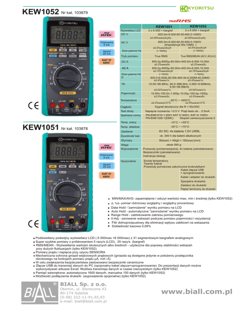 KEW1052 Nr kat. 103879 KEW1052 KEW1051 Wyświetlacz LCD DC V 2 x 6 000 + bargraf 2 x 6 000 + bargraf 600.0m-6.000-60.00-600.0-1000V ±0.09%ww±2cyfry Próbkowanie 5 x/s AC V ±0.09%ww±2cyfry 600.0m-6.000-60.00-600.0-1000V (Impedancja We:10MΩ ) ±0,5%ww±5cyfr ±0,5%ww±5cyfr Bargraf 25 x/s KAT IV 600V Szer.pasma Hz Tryb pomiaru (~1kHz) (~1kHz) True RMS True RMS/MEAN (ACV, ACmV) DC A 600.0μ-6000μ-60.00m-440.0m-6.000-10.00A AC A 600.0μ-6000μ-60.00m-440.0m-6.000-10.00A ±0.2%ww±5c Szer.pasma Hz Ω ±0.2%ww±5c ±0.75%ww±5cyfr (~1kHz) ±0,75%ww±5cyfr (~1kHz) 600.0-6.000k-60.00k-600.0k-6.000M-40.00MΩ ±0.4%ww±1c ±0.4%ww±1c Hz 10.00~99.99Hz, 90.0~999.9Hz, 0.900~9.999kHz, 9.00~99.99kHz ±0.02%ww±1c ±0.02%ww±1c Pojemność 10.00n-100.0n-1.000μ-10.00μ-100.0μ-1000μ ±2.0%ww±5c Temperatura Ciągłość KEW1051 Nr kat. 103878 Napięcie rozwarcia: <3.5 V Prąd testu ok... 0.5mA Spełniane normy PN-EN61010-1:2001 KAT IV 600V, KAT III 1000V PN-EN61326-1(EMC) Stopień zanieczyszczenia 2 Temp. pracy -10°C ~ +55°C Temp. składow. -30°C ~ +70°C Zasilanie 6V DC: 4x bateria 1,5V LR06, Żywotność bat. ok. 300 h dla baterii alkalicznych Wymiary 90(szer) × 49(gł) × 192(wys) [mm] Próbkowanie 5 x/s Opcjonalnie 25 x/s KAT IV 600V Sygnał akustyczny dla R < 50±30Ω Test diody Waga Wyposażenie Bargraf ±2.0%ww±5c -50°C ~ +600°C ±2.0%ww±3.0°C ±2.0%ww±3.0°C około 560 g Przewody pomiarowe(para), 4x bateria (zainstalowane) Bezpieczniki (zainstalowane) Instrukcja obsługi Sonda temperatury, Twardy futerał Przewody pomiarowe zakończone krokodylkami Kabel złącza USB + oprogramowanie Kabel i adapter do drukarki Specjalna drukarka Zasilacz do drukarki Papier termiczny do drukarki ● MIN/MAX/AVG- zapamiętanie i odczyt wartości max, min i średniej (tylko KEW1052) ● Δ, %Δ- pomiar różnicowy względny i względny procentowy Data Hold -”zamrożenie” wyniku pomiaru na LCD Auto Hold - automatyczne ”zamrożenie” wyniku pomiaru na LCD Range Hold - zablokowanie zakresu pomiarowego 0-Adj - zerowanie wskazań podczas pomiaru pojemności i rezystancji ● Filtr dolnoprzepustowy dla eliminacji wpływu zakłóceń na wskazania ● Dokładność bazowa 0,09% ● ● ● ● ● Podświetlany podwójny wyświetlacz LCD ( 6 000max +6 000max) z 31 segmentowym bargrafem analogowym ● Super szybkie pomiary z próbkowaniem 5 razy/s (LCD), 25 razy/s (bargraf) ● RMS/MEAN - Wyświetlanie wartości skutecznych albo średnich - użyteczne dla poprawy stabilności wskazań przy dużych fluktuacjach (tylko KEW1052) ● Pomiary prądu i napięcia przy użyciu SENSORA ● Mechaniczna ochrona gniazd wejściowych prądowych (gniazda są dostępne jedynie w położeniu przełącznika obrotowego na funkcjach pomiaru prądu µA, mA i A) ● W celu zwiększenia bezpieczeństwa zastosowano bezpieczniki ceramiczne ● Złącze USB do transmisji danych do PC (opcjonalny kabel złącza+oprogramowanie). Do prezentacji danych można wykorzystywać arkusze Excel. Możliwa transmisja danych w czasie rzeczywistym (tylko KEW1052) ● Pamięć wewnętrzna: automatyczna 1600 danych, manualna 100 danych (tylko KEW1052) ● Możliwość podłączenia drukarki (wyposażenie opcjonalne) (tylko KEW1052) BIALL Sp. z o.o. Otomin, ul. Słoneczna 43 80-174 Gdańsk (0-58) 322-11-91,92,93 e-mail: [email protected] www.biall.com.pl