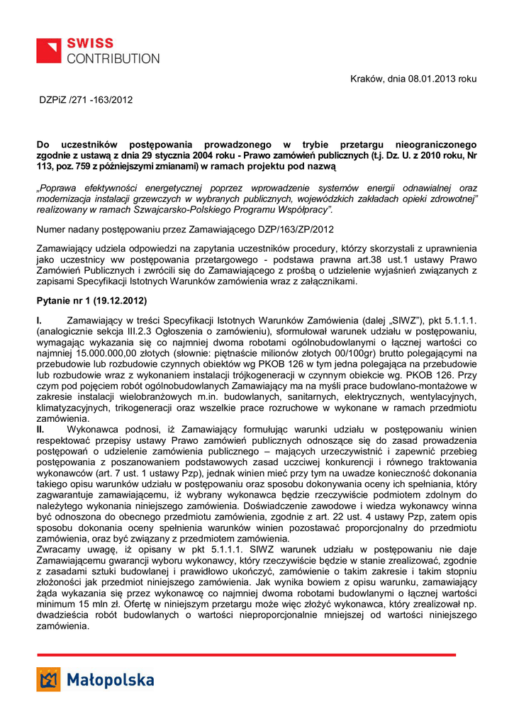Kraków, dnia 08.01.2013 roku DZPiZ /271 -163/2012 Do uczestników postępowania prowadzonego w trybie przetargu nieograniczonego zgodnie z ustawą z dnia 29 stycznia 2004 roku - Prawo zamówień publicznych (t.j. Dz. U. z 2010 roku, Nr 113, poz. 759 z późniejszymi zmianami) w ramach projektu pod nazwą „Poprawa efektywności energetycznej poprzez wprowadzenie systemów energii odnawialnej oraz modernizacja instalacji grzewczych w wybranych publicznych, wojewódzkich zakładach opieki zdrowotnej” realizowany w ramach Szwajcarsko-Polskiego Programu Współpracy”. Numer nadany postępowaniu przez Zamawiającego DZP/163/ZP/2012 Zamawiający udziela odpowiedzi na zapytania uczestników procedury, którzy skorzystali z uprawnienia jako uczestnicy ww postępowania przetargowego - podstawa prawna art.38 ust.1 ustawy Prawo Zamówień Publicznych i zwrócili się do Zamawiającego z prośbą o udzielenie wyjaśnień związanych z zapisami Specyfikacji Istotnych Warunków zamówienia wraz z załącznikami. Pytanie nr 1 (19.12.2012) I. Zamawiający w treści Specyfikacji Istotnych Warunków Zamówienia (dalej „SIWZ”), pkt 5.1.1.1. (analogicznie sekcja III.2.3 Ogłoszenia o zamówieniu), sformułował warunek udziału w postępowaniu, wymagając wykazania się co najmniej dwoma robotami ogólnobudowlanymi o łącznej wartości co najmniej 15.000.000,00 złotych (słownie: piętnaście milionów złotych 00/100gr) brutto polegającymi na przebudowie lub rozbudowie czynnych obiektów wg PKOB 126 w tym jedna polegająca na przebudowie lub rozbudowie wraz z wykonaniem instalacji trójkogeneracji w czynnym obiekcie wg. PKOB 126. Przy czym pod pojęciem robót ogólnobudowlanych Zamawiający ma na myśli prace budowlano-montażowe w zakresie instalacji wielobranżowych m.in. budowlanych, sanitarnych, elektrycznych, wentylacyjnych, klimatyzacyjnych, trikogeneracji oraz wszelkie prace rozruchowe w wykonane w ramach przedmiotu zamówienia. II. Wykonawca podnosi, iż Zamawiający formułując warunki udziału w postępowaniu winien respektować przepisy ustawy Prawo zamówień publicznych odnoszące się do zasad prowadzenia postępowań o udzielenie zamówienia publicznego – mających urzeczywistnić i zapewnić przebieg postępowania z poszanowaniem podstawowych zasad uczciwej konkurencji i równego traktowania wykonawców (art. 7 ust. 1 ustawy Pzp), jednak winien mieć przy tym na uwadze konieczność dokonania takiego opisu warunków udziału w postępowaniu oraz sposobu dokonywania oceny ich spełniania, który zagwarantuje zamawiającemu, iż wybrany wykonawca będzie rzeczywiście podmiotem zdolnym do należytego wykonania niniejszego zamówienia. Doświadczenie zawodowe i wiedza wykonawcy winna być odnoszona do obecnego przedmiotu zamówienia, zgodnie z art. 22 ust. 4 ustawy Pzp, zatem opis sposobu dokonania oceny spełnienia warunków winien pozostawać proporcjonalny do przedmiotu zamówienia, oraz być związany z przedmiotem zamówienia. Zwracamy uwagę, iż opisany w pkt 5.1.1.1. SIWZ warunek udziału w postępowaniu nie daje Zamawiającemu gwarancji wyboru wykonawcy, który rzeczywiście będzie w stanie zrealizować, zgodnie z zasadami sztuki budowlanej i prawidłowo ukończyć, zamówienie o takim zakresie i takim stopniu złożoności jak przedmiot niniejszego zamówienia. Jak wynika bowiem z opisu warunku, zamawiający żąda wykazania się przez wykonawcę co najmniej dwoma robotami budowlanymi o łącznej wartości minimum 15 mln zł. Ofertę w niniejszym przetargu może więc złożyć wykonawca, który zrealizował np. dwadzieścia robót budowlanych o wartości nieproporcjonalnie mniejszej od wartości niniejszego zamówienia. Dlatego też, w ocenie wykonawcy, Zamawiający winien rozważyć zmianę warunków opisanych w SIWZ, dostosowując je do przedmiotu niniejszego zamówienia z uwzględnieniem zasady proporcjonalności, przykładowo: pkt 5.1.1.1 SIWZ : co najmniej dwie roboty ogólnobudowlane o łącznej wartości co najmniej 15.000.000,00 złotych (słownie: piętnaście milionów złotych 00/100gr) brutto polegające na przebudowie lub rozbudowie czynnych obiektów wg PKOB 126 w tym: - co najmniej jedna polegająca na przebudowie lub rozbudowie czynnych obiektów wg PKOB 126, o wartości co najmniej 11 000.000,00 złotych brutto, - co najmniej jedna polegająca na przebudowie lub rozbudowie wraz z wykonaniem instalacji trójkogeneracji w czynnym obiekcie wg. PKOB 126 o wartości 4 000 000,00 złotych brutto. Przy czym pod pojęciem robót ogólnobudowlanych Zamawiający ma na myśli prace budowlanomontażowe w zakresie instalacji wielobranżowych m.in. budowlanych, sanitarnych, elektrycznych, wentylacyjnych, klimatyzacyjnych, trikogeneracji oraz wszelkie prace rozruchowe w wykonane w ramach przedmiotu zamówienia. Jednocześnie zwracamy uwagę, że Zamawiający w pkt 5.1.1.1 SIWZ powołuje się na klasyfikację obiektów PKOB wymagając, by wykonawca wykazał się robotami w obiektach grupy 126. Grupa PKOB 126 obejmuje różne klasy obiektów tj. kina, teatry, sale koncertowe, kasyna, muzea, biblioteki, przedszkola, szkoły uczelnie wyższe, internaty, hale sportowe, kryte baseny, szpitale i zakłady opieki medycznej. Natomiast zgodnie z opisem przedmiotu zamówienia wszystkie obiekty, na których będą wykonywane prace, są budynkami szpitali należącymi do klasy 1264 o innej charakterystyce użytkowej w tym klasie czystości, pracy ciągłej 24h na dobę i 7 dni w tygodniu. W obiektach klasy 1264 wszystkie instalacje charakteryzują się koniecznością „dublowania zabezpieczeń” tj. uruchamianiem obwodów rezerwowych w przypadku awarii instalacji podstawowych. Szczególnie ważne jest aby porównywalne realizacje dotyczyły obiektów o podobnych charakterystykach czyli czynnych obiektów służby zdrowia. Doświadczenie zdobyte w poprzednich realizacjach pozwala wykonawcom na zachowanie ścisłego reżimu w celu funkcjonowania szpitala i gwarantuje ochronę