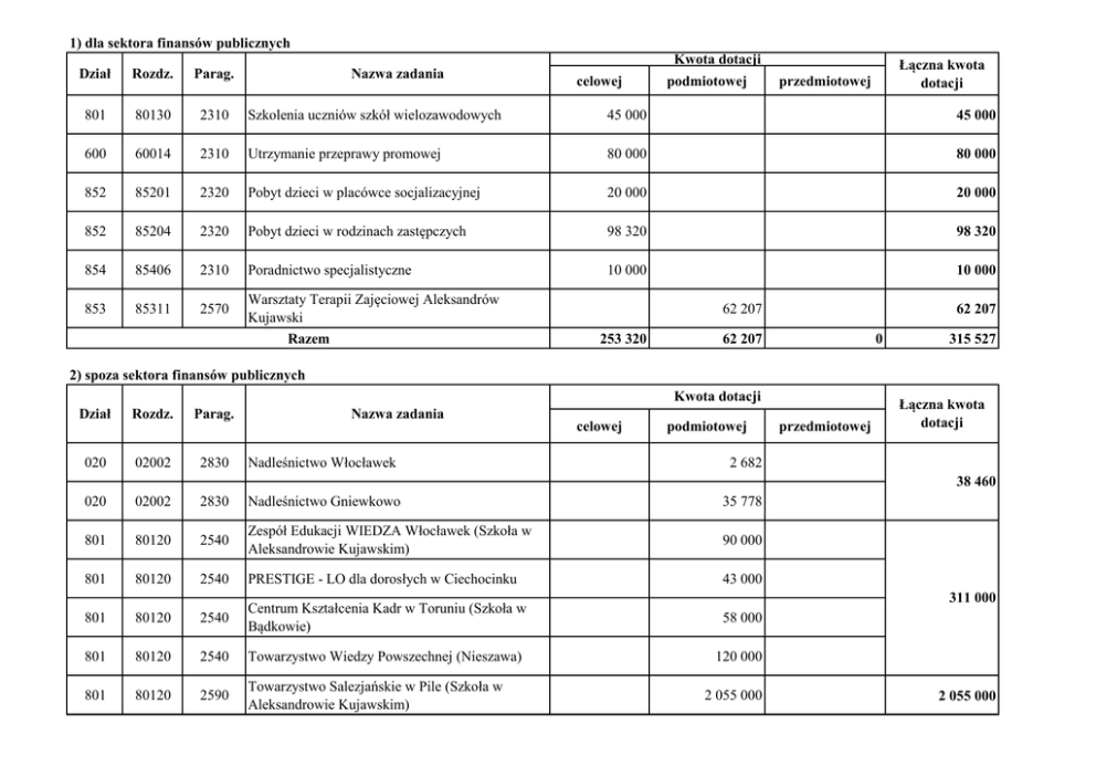 1) dla sektora finansów publicznych Kwota dotacji Łączna kwota dotacji Dział Rozdz. Parag. 801 80130 2310 Szkolenia uczniów szkół wielozawodowych 45 000 45 000 600 60014 2310 Utrzymanie przeprawy promowej 80 000 80 000 852 85201 2320 Pobyt dzieci w placówce socjalizacyjnej 20 000 20 000 852 85204 2320 Pobyt dzieci w rodzinach zastępczych 98 320 98 320 854 85406 2310 Poradnictwo specjalistyczne 10 000 10 000 853 85311 2570 Nazwa zadania Warsztaty Terapii Zajęciowej Aleksandrów Kujawski Razem celowej podmiotowej przedmiotowej 62 207 253 320 62 207 62 207 0 315 527 2) spoza sektora finansów publicznych Kwota dotacji Dział Rozdz. Parag. 020 02002 2830 Nazwa zadania Nadleśnictwo Włocławek celowej podmiotowej przedmiotowej Łączna kwota dotacji 2 682 38 460 020 02002 2830 Nadleśnictwo Gniewkowo 35 778 801 80120 2540 Zespół Edukacji WIEDZA Włocławek (Szkoła w Aleksandrowie Kujawskim) 90 000 801 80120 2540 PRESTIGE - LO dla dorosłych w Ciechocinku 43 000 58 000 120 000 801 80120 2540 Centrum Kształcenia Kadr w Toruniu (Szkoła w Bądkowie) 801 80120 2540 Towarzystwo Wiedzy Powszechnej (Nieszawa) 801 80120 2590 Towarzystwo Salezjańskie w Pile (Szkoła w Aleksandrowie Kujawskim) 311 000 2 055 000 2 055 000 801 80130 2540 Towarzystwo Wiedzy Powszechnej (Szkoła policealna w Nieszawie) Szkoła Techniczna Bydgoskiego Zakładu Doskonalenia Zawodowego w Aleksandrowie Kujawskim Towarzystwo Salezjańskie w Pile (Szkoła w Aleksandrowie Kujawskim) Dom Pomocy Społecznej dla dzieci i młodzieży niepełnosprawnej intelektualnie w Grabiu 55 000 355 000 801 80130 2540 300 000 851 85156 2590 856 85156 2580 852 85202 2830 Domy pomocy społecznej 853 85311 2580 Warsztaty terapii zajęciowej Karczemka 88 867 88 867 921 92105 2580 Jednostki wyłonione w drodze konkursu Organizacja imprez kulturalnych 23 000 23 000 921 92120 2720 Ochrona zabytków i opieka nad zabytkami 926 92605 2820 755 75515 2360 755 75515 2360 328 10 390 10 390 1 006 837 Realizacja zadań w zakresie kultury fizycznej i sportu Ośrodki wsparcia - jednostki wyłonione w drodze konkursu Fundacja Honeste VIVERE W-wa - nieodpłatna pomoc prawna Razem 328 7 000 7 000 23 000 23 000 114 120 114 120 59 946 59 946 1 210 903 Ogółem dotacje udzielone z budżetu: 1 006 837 2 882 045 0 4 092 948 4 408 475