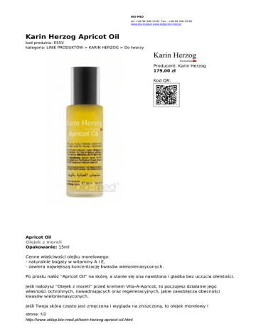 BIO-MED tel. +48 94 348-13-65 Fax.. +48 94 348-13-66 www.bio-med.pl www.sklep.bio-med.pl Karin Herzog Apricot Oil kod produktu: E55V kategoria: LINIE PRODUKTÓW > KARIN HERZOG > Do twarzy Producent: Karin Herzog 179,00 zł Kod QR: Apricot Oil Olejek z moreli Opakowanie: 15ml Cenne właściwości olejku morelowego: - naturalnie bogaty w witaminy A i E, - zawiera największą koncentrację kwasów wielonienasyconych. Po prostu nałóż “Apricot Oil” na skórę, a stanie się ona nawilżona i gładka bez uczucia oleistości. Jeśli nałożysz “Olejek z moreli” przed kremem Vita-A-Apricot, to poczujesz działanie jego własności ochronnych, nawadniających oraz regeneracyjnych, jakie zawdzięcza obecności kwasów wielonienasyconych. Jeśli Twoja skóra często jest zmęczona i wygląda na zniszczoną, to olejek morelowy i strona: 1/2 http://www.sklep.bio-med.pl/karin-herzog-apricot-oil.html Vita-A-Apricot stanowią idealne rozwiązanie tych problemów. Sposób użycia: Nałóż kilka kropel na twarz i pozwól im działać przez kilka minut. Potem nałóż krem “Vita-A-Apricot". Skład: Apricot Oil Kemel Oil PEG-6 Esthers Daucus Carota Hypericum Perforatum Valeriana Officinalis Sesamum indicum ************************************************************************************************* ***** DLACZEGO LINIA KOSMETYKÓW KARIN HERZOG JEST TAKA WYJĄTKOWA? Tlen działa antybakteryjnie, usuwa toksyny. Jest antyseptyczy i przeciwzapalny. Kontroluje wytwarzanie sebum i wspomaga wytwarzanie kolagenu, przez co następuje normalizacja skóry i jej rewitalizacja. Wspomaga działanie takich substancji jak: witamina A, H, glukoza, olejek różany, awokado, rumianek, kakao i innych składników wchodzących w skład produktów KH. Tlen jest znakomitym nośnikiem tych substancji. Umożliwia ich wniknięcie w głębiej położone warstwy skóry, ponieważ będąc w postaci płynnej w kremie uwalnia się w kontakcie ze skórą do postaci gazu. Następnie zwiększa swoją objętość ponad 20 razy i wytwarza ciśnienie pozwalające mu wniknąć do skóry właściwej. STOSOWANIE KOSMETYKÓW Z TLENEM KARIN HERZOG Nie powinno się łączyć produktów z tlenem KH z innymi markami kosmetyków. Tlen może spowodować niepożądane reakcje na skórze i wnieść nieznane substancje z innych kosmetyków do głębszych warstw skóry. Jeśli masz np. swoje ulubione mleczko lub tonik zmyj je wodą przed nałożeniem kremu z tlenem. Kosmetyki tlenowe KH zawierają ustabilizowany tlen (Hydrogen Peroxide). Dlatego mają delikatne działanie wybielające. Należy unikać kontaktu z brwiami i rzęsami. Zalecamy nałożenie kremu z tlenem na pędzelek i rozprowadzenie na wybrane części ciała bez wmasowywania w skórę. Ponieważ skóra rąk wchłonie więcej tlenu. Zrobi to szybciej niż np. skóra na twarzy. Efektywne działanie kremu ograniczy się wówczas do skóry dłoni, zamiast działać tam gdzie tego chcemy. Ze względu na tlen, który jest aktywnym czynnikiem, kosmetyki KH można zaliczyć do tzw. grupy kosmeceutyków. Produkty KH nie są testowane na zwierzętach i nie zawierają ekstraktów zwierzęcych. Testy produktów KH zostały przeprowadzone in vitro lub na wolontariuszach. Kosmetyki z tlenem KH nie zawierają konserwantów. strona: 2/2 http://www.sklep.bio-med.pl/karin-herzog-apricot-oil.html