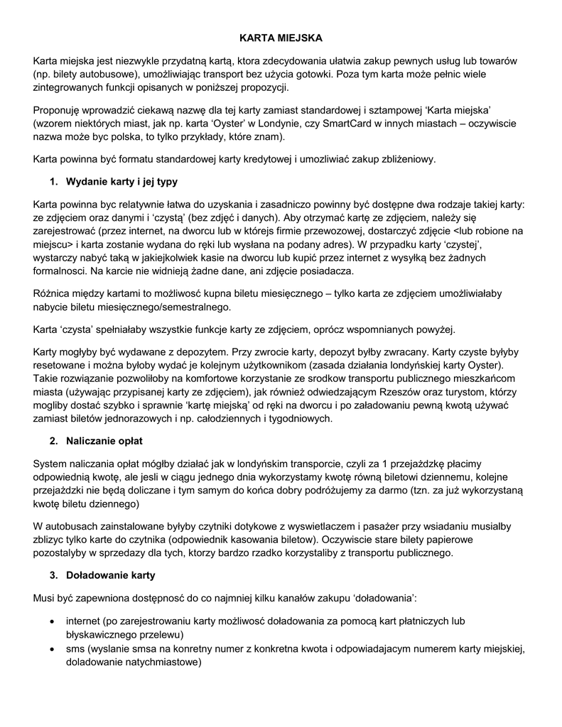 KARTA MIEJSKA Karta miejska jest niezwykle przydatną kartą, ktora zdecydowania ułatwia zakup pewnych usług lub towarów (np. bilety autobusowe), umożliwiając transport bez użycia gotowki. Poza tym karta może pełnic wiele zintegrowanych funkcji opisanych w poniższej propozycji. Proponuję wprowadzić ciekawą nazwę dla tej karty zamiast standardowej i sztampowej ‘Karta miejska’ (wzorem niektórych miast, jak np. karta ‘Oyster’ w Londynie, czy SmartCard w innych miastach – oczywiscie nazwa może byc polska, to tylko przykłady, które znam). Karta powinna być formatu standardowej karty kredytowej i umozliwiać zakup zbliżeniowy. 1. Wydanie karty i jej typy Karta powinna byc relatywnie łatwa do uzyskania i zasadniczo powinny być dostępne dwa rodzaje takiej karty: ze zdjęciem oraz danymi i ‘czystą’ (bez zdjęć i danych). Aby otrzymać kartę ze zdjęciem, należy się zarejestrować (przez internet, na dworcu lub w którejs firmie przewozowej, dostarczyć zdjęcie <lub robione na miejscu> i karta zostanie wydana do ręki lub wysłana na podany adres). W przypadku karty ‘czystej’, wystarczy nabyć taką w jakiejkolwiek kasie na dworcu lub kupić przez internet z wysyłką bez żadnych formalnosci. Na karcie nie widnieją żadne dane, ani zdjęcie posiadacza. Różnica między kartami to możliwosć kupna biletu miesięcznego – tylko karta ze zdjęciem umożliwiałaby nabycie biletu miesięcznego/semestralnego. Karta ‘czysta’ spełniałaby wszystkie funkcje karty ze zdjęciem, oprócz wspomnianych powyżej. Karty mogłyby być wydawane z depozytem. Przy zwrocie karty, depozyt byłby zwracany. Karty czyste byłyby resetowane i można byłoby wydać je kolejnym użytkownikom (zasada działania londyńskiej karty Oyster). Takie rozwiązanie pozwoliłoby na komfortowe korzystanie ze srodkow transportu publicznego mieszkańcom miasta (używając przypisanej karty ze zdjęciem), jak również odwiedzającym Rzeszów oraz turystom, którzy mogliby dostać szybko i sprawnie ‘kartę miejską’ od ręki na dworcu i po załadowaniu pewną kwotą używać zamiast biletów jednorazowych i np. całodziennych i tygodniowych. 2. Naliczanie opłat System naliczania opłat mógłby działać jak w londyńskim transporcie, czyli za 1 przejażdzkę płacimy odpowiednią kwotę, ale jesli w ciągu jednego dnia wykorzystamy kwotę równą biletowi dziennemu, kolejne przejażdzki nie będą doliczane i tym samym do końca dobry podróżujemy za darmo (tzn. za już wykorzystaną kwotę biletu dziennego) W autobusach zainstalowane byłyby czytniki dotykowe z wyswietlaczem i pasażer przy wsiadaniu musialby zblizyc tylko karte do czytnika (odpowiednik kasowania biletow). Oczywiscie stare bilety papierowe pozostalyby w sprzedazy dla tych, ktorzy bardzo rzadko korzystaliby z transportu publicznego. 3. Doładowanie karty Musi być zapewniona dostępnosć do co najmniej kilku kanałów zakupu ‘doładowania’: internet (po zarejestrowaniu karty możliwosć doładowania za pomocą kart płatniczych lub błyskawicznego przelewu) sms (wyslanie smsa na konretny numer z konkretna kwota i odpowiadajacym numerem karty miejskiej, doladowanie natychmiastowe) biletomaty – zakładam, że będą instalowane w przyszłosci – możliwosć doładowania kart za pomocą gotówki (monety + banknoty) oraz kart płatniczych obsługa na dworcach i u przewoźników punkty sprzedaży? (tak jak doładowuje się karty prepaid operatorów sieci komórkowych) Poprzez te punkty byłaby również łatwa możliwosć zakupienia/przedłużenia biletów miesięcznych i semestralnych. Wszystkie automaty i czytniki powinny pokazywać stan konta w momencie skasowania/zakupu oraz datę ważnosci, jesli zakupilo sie bilety miesięczne/semestralne/tygodniowe/weekendowe itp (w przypadku sms, powinno przyjsc takie potwierdzenie smsem zwrotnym). Stan konta i ważnosć oczywiscie możnaby sprawdzić na stronie internetowej karty po zarejestrowaniu się (gdzie byłyby również wyszczególnione wszystkie wydatki/podróże). 4. Zwrot karty Przy opuszczeniu miasta, karta może być szybko oddana (np. na dworcu lub u przewoźników) i następuje zwrot depozytu oraz srodkow pozostalych na koncie. Może również zostać zachowana do kolejnej wizyty. MOŻLIWOŚCI KARTY: Zapłata za usługi następuje poprzez przyłożenie karty do odpowiedniego terminala, zainstalowanego przy konkretnym miejscu (podobnie jak płatnosć kartami zbliżeniowymi). Jest to karta typu prepaid, a więc muszą być na niej wczesniej dostepne srodki pieniężne! Zakup biletów autobusowych pojedynczych oraz miesięcznych itp (opisane powyżej), Możliwosć wypożyczania rowerów miejskich bez zbędnej dodatkowej rejestracji, Możliwosć zapłaty za parking (w przypadku płatnych parkingów), Bilety wstępu do rożnych budynków (np. muzea, trasa podziemna, teatr, biblioteki, inne instytucje publiczne i po odpowiedniej umowie również prywatne). Dodatkowo, gdyby wprowadzić kartę turystyczną (uprawniającą do wejsć do wszelkich atrakcji za okresloną kwotę, tzw. ‘City Pass’ ważną na np. 24 i 48 h), karta miejska mogłaby również służyć za kartę turystyczną e) Zapłata za toalety publiczne w miescie (w założeniu, że będą bezobsługowe przez wchodzenie przez płatne bramki, jak opisane w ‘Propozycji’ centrum przesiadkowego) f) Inne płatnosci a) b) c) d) W celu zwiększenia bezpieczeństwa, w transakcjach b-f nalezaloby wpisac PIN (czyli podobnie jak płatnosć kartą płatniczą). W autobusach ze względów praktycznych, wystarczyłoby przyłożenie karty do czytnika. Powinna być również dostępna szybka opcja zastrzeżenia karty, np. poprzez telefon na serwis lub wyslanie smsa na odpowiedni numer [oprócz numeru karty, należałoby podać również indywidualny nr zapisany na odwrocie karty, podobnie jak w kartach płatniczych – w ten sposób można uniknąć działania celowego blokowania czyichs kart]. Dla kart 