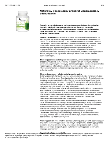 2017-03-03 12:30 www.artofbeauty.com.pl 1/3 Naturalny i bezpieczny preparat wspomagający odchudzanie Produkt wyprodukowany z ekologicznego młodego jęczmienia. Produkt ekologiczny gwarantuje, że na żadnym z etapów wytwarzania jęczmienia nie stosowano chemicznych dodatków. Gwarantuje to utrzymanie najcenniejszych dla tego produktu witamin i minerałów. Efekty Zdrowotne jakie można uzyskać po stosowaniu suplementu są zaskakujące. Jęczmień w swym składzie poza mikrolementami takimi jak cynk a także witaminami (B2, C, E) zawiera substancję o nazwie chlorofil. Chlorofil jest naturalnym zielonym barwnikiem młodego jęczmienia. Lista pozytywnych właściwości przyjmowania chlorofilu jest długa, wśród najważniejszych wymienia się przyśpieszenie przemiany materii, przyśpieszenie spalania tkanki tłuszczowej, zwiększenie liczebności czerwonych krwinek, zapobieganie nowotworom, dostarczanie organizmowi żelaza, oczyszczanie organizmu z toksyn, zwalczanie anemii a także oczyszczanie jelit. Zielony jęczmień działa przeciwzapalnie, przeciwnowotworowo i przeciwwirusowo. Jest pomocny w leczeniu zmian skórnych, chorób sercowo-naczyniowych i cukrzycy. Coraz częściej jest stosowany jako środek wspomagający odchudzanie. Zielony jęczmień ze względu na swe właściwości znajduje zastosowanie jako preparat do odświeżania oddechu i płukania gardła. Zielony jęczmień – właściwości prozdrowotne Zielony jęczmień stanowi bogactwo witamin i składników mineralnych. Jest źródłem witamin z grupy B, antyoksydantów (witaminy C i E, beta-karotenu), żelaza, wapnia, magnezu i cynku. Oprócz tego zielone łodygi jęczmienia zawierają naturalne hormony i chlorofil. W porównaniu z innymi roślinami zielony jęczmień jest bogaty w niezbędne aminokwasy, a więc te, których nasz organizm nie potrafi sam wyprodukować. Młody jęczmień ma więc silne właściwości przeciwutleniające, co warunkuje jego działanie przeciwzapalne, przeciwnowotworowe i przeciwwirusowe. Zielony jęczmień pomaga w leczeniu trądziku i owrzodzeń. Ponadto łagodzi bóle żołądka, bóle stawów i zmniejsza stany zapalne. Dodatkowo wysoka zawartość chlorofilu sprzyja odkwaszeniu organizmu, zapewniając równowagę kwasowo-zasadową organizmu. Zielony jęczmień oprócz bogactwa witamin i składników mineralnych jest także źródłem rozpuszczalnego błonnika pokarmowego, który przyspiesza metabolizm tłuszczu w organizmie i obniża stężenie cholesterolu we krwi. Ponadto w zielonym jęczmieniu występują frakcje błonnika nierozpuszczalnego warunkujące korzystny wpływ na pracę układu pokarmowego i zmniejszające ryzyko nowotworu jelita grubego. Dodatkowo zielony jęczmień może być pomocny w prewencji i leczeniu cukrzycy, chorób, serca, nadciśnienia tętniczego, hipercholesterolemii, bezsenności czy nadwagi i otyłości. Młody jęczmień robi ostatnio zawrotną karierę jako specyfik oczyszczający organizm, usprawniający usuwanie toksyn z organizmu, opóźniający proces starzenia się. Suplementy diety zawierające ten preparat są bez trudu dostępne w wielu sklepach. Jakie są korzyści wynikające ze spożywania młodego jęczmienia? jest młody jęczmień? Korzystanie z artykułów publikowanych wCzym portalu artofbeauty.com.pl dla celów komercyjnych bądź dokonywanie ich opracowań wymaga zgody wydawcy - spółki Estetica Polska. W tym celu prosimy o kontakt z Ewą Cesarz, [email protected] 2017-03-03 12:30 www.artofbeauty.com.pl 2/3 Młody jęczmień można spotkać w postaci proszku z około siedmiodniowych łodyżek jęczmienia. Nie jest to, jak sądzą niektórzy, zmielona trawa jęczmienna, lecz sok. Młode listki ścina się, płucze, a następnie wyciska sok w specjalnych wyciskarkach. Następnie tak uzyskany płyn jest wirowany, następuje odparowanie części wody pod ciśnieniem, w temperaturze około 30 stopni Celsjusza. Zbyt wysoka temperatura spowodowałaby utratę części składników zawartych w jęczmieniu, na przykład niektórych witamin. Tak przygotowany proszek trafia na półki sklepów. Skład chemiczny: Przyjrzyjmy się bliżej, jakie składniki są zawarte w wysuszonym, sproszkowanym jęczmieniu. Wartość odżywcza w 100 g proszku Białko 30-40 g Węglowodany przyswajalne 25-35 g Błonnik 3-6 g Tłuszcze 3-4 g Wartość energetyczna 315 kcal Zawartość witamin w 100 g proszku: Witamina C 457 mg Tiamina 0,4 mg Ryboflawina 2,4 mg Niacyna 3,6 mg Pirydoksyna 17,8 mg Kwas pantotenowy 5,1 mg Kwas foliowy 946 μg β-karoten 1320 μg Witamina E 7,4 mg Witamina K 776 μg Zawartość składników mineralnych w 1 g proszku: Nazwa Zawartość w 1 g Mangan 0,14 mg Potas 68,3 mg Chrom 1,09 μg Magnez 3,96 mg Żelazo 0,13 mg Wapń 5,48 mg Miedź 0,015 mg Fosfor 3,94 mg Cynk 0,03 mg Krzem 0,04 mg Sód 4,74 mg Bor 26,2 μg Co jeszcze wchodzi w skład młodego jęczmienia? Zawartość białka w sproszkowanym soku z trawy jęczmiennej wynosi około 30-40 g w 100 gramach suplementu. Jaki jest skład aminokwasowy tego białka? Kwas glutaminowy, kwas asparaginowy, alanina, leucyna, lizyna, prolina, fenyloalanina to tylko niektóre z aminokwasów występujących w młodym jęczmieniu. Znaleźć w nim możemy aminokwasy egzogenne, niezbędne dla człowieka, które muszą być dostarczane z pożywieniem, takie jak wspomniana wyżej leucyna czy fenyloalanina. Producenci często podają zawartość chlorofilu, która wynosi ok. 300 mg w 100 g produktu. Skład takiego jęczmienia może budzić podziw, ale jest on podany dla proszku, nie sporządzonego z niego roztworu. Podobnie rzecz się ma na przykład z mlekiem w proszku i zwykłym płynnym mlekiem – to pierwsze, z racji zdecydowanie mniejszej zawartości wody, ma znacznie wyższe wartości składników odżywczych czy mineralnych. Korzystanie z artykułów publikowanych w portalu artofbeauty.com.pl dla celów komercyjnych bądź dokonywanie ich opracowań wymaga zgody wydawcy - spółki Estetica Polska. 