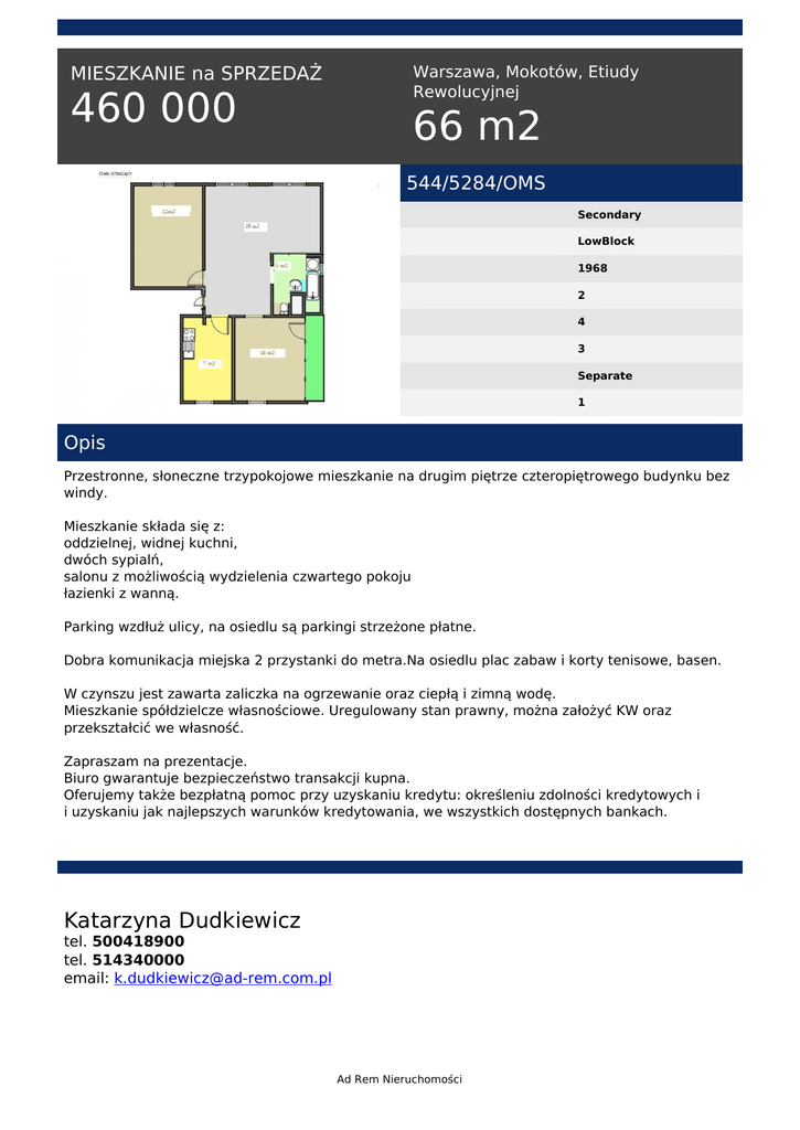 Warszawa, Mokotów, Etiudy Rewolucyjnej MIESZKANIE na SPRZEDAŻ 460 000 66 m2 544/5284/OMS Secondary LowBlock 1968 2 4 3 Separate 1 Opis Przestronne, słoneczne trzypokojowe mieszkanie na drugim piętrze czteropiętrowego budynku bez windy. Mieszkanie składa się z: oddzielnej, widnej kuchni, dwóch sypialń, salonu z możliwością wydzielenia czwartego pokoju łazienki z wanną. Parking wzdłuż ulicy, na osiedlu są parkingi strzeżone płatne. Dobra komunikacja miejska 2 przystanki do metra.Na osiedlu plac zabaw i korty tenisowe, basen. W czynszu jest zawarta zaliczka na ogrzewanie oraz ciepłą i zimną wodę. Mieszkanie spółdzielcze własnościowe. Uregulowany stan prawny, można założyć KW oraz przekształcić we własność. Zapraszam na prezentacje. Biuro gwarantuje bezpieczeństwo transakcji kupna. Oferujemy także bezpłatną pomoc przy uzyskaniu kredytu: określeniu zdolności kredytowych i i uzyskaniu jak najlepszych warunków kredytowania, we wszystkich dostępnych bankach. Katarzyna Dudkiewicz tel. 500418900 tel. 514340000 email: [email protected] Ad Rem Nieruchomości Powered by TCPDF (www.tcpdf.org)