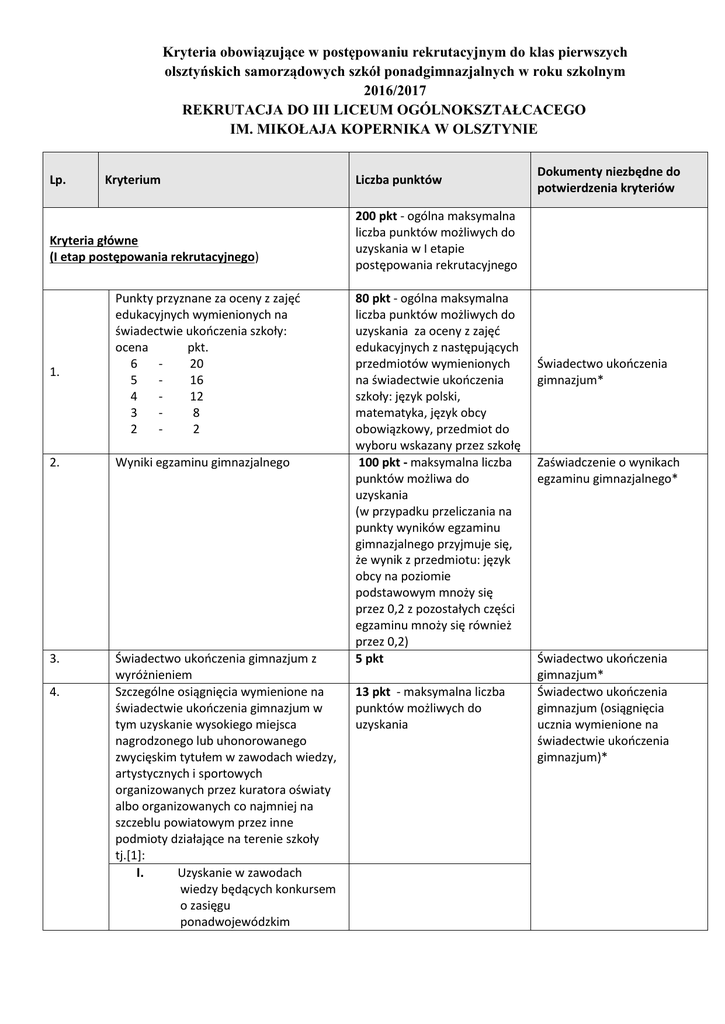 Kryteria obowiązujące w postępowaniu rekrutacyjnym do klas pierwszych olsztyńskich samorządowych szkół ponadgimnazjalnych w roku szkolnym 2016/2017 REKRUTACJA DO III LICEUM OGÓLNOKSZTAŁCACEGO IM. MIKOŁAJA KOPERNIKA W OLSZTYNIE Lp. Kryterium Kryteria główne (I etap postępowania rekrutacyjnego) 1. Punkty przyznane za oceny z zajęć edukacyjnych wymienionych na świadectwie ukończenia szkoły: ocena pkt. 6 20 5 16 4 12 3 8 2 2 2. Wyniki egzaminu gimnazjalnego 3. Świadectwo ukończenia gimnazjum z wyróżnieniem Szczególne osiągnięcia wymienione na świadectwie ukończenia gimnazjum w tym uzyskanie wysokiego miejsca nagrodzonego lub uhonorowanego zwycięskim tytułem w zawodach wiedzy, artystycznych i sportowych organizowanych przez kuratora oświaty albo organizowanych co najmniej na szczeblu powiatowym przez inne podmioty działające na terenie szkoły tj.[1]: I. Uzyskanie w zawodach wiedzy będących konkursem o zasięgu ponadwojewódzkim 4. Liczba punktów Dokumenty niezbędne do potwierdzenia kryteriów 200 pkt - ogólna maksymalna liczba punktów możliwych do uzyskania w I etapie postępowania rekrutacyjnego 80 pkt - ogólna maksymalna liczba punktów możliwych do uzyskania za oceny z zajęć edukacyjnych z następujących przedmiotów wymienionych na świadectwie ukończenia szkoły: język polski, matematyka, język obcy obowiązkowy, przedmiot do wyboru wskazany przez szkołę 100 pkt - maksymalna liczba punktów możliwa do uzyskania (w przypadku przeliczania na punkty wyników egzaminu gimnazjalnego przyjmuje się, że wynik z przedmiotu: język obcy na poziomie podstawowym mnoży się przez 0,2 z pozostałych części egzaminu mnoży się również przez 0,2) 5 pkt 13 pkt - maksymalna liczba punktów możliwych do uzyskania Świadectwo ukończenia gimnazjum* Zaświadczenie o wynikach egzaminu gimnazjalnego* Świadectwo ukończenia gimnazjum* Świadectwo ukończenia gimnazjum (osiągnięcia ucznia wymienione na świadectwie ukończenia gimnazjum)* organizowanym przez kuratorów oświaty na podstawie zawartych porozumień tytułu finalisty konkursu przedmiotowego tytułu laureata konkursu tematycznego lub interdyscyplinarnego tytułu finalisty konkursu tematycznego lub interdyscyplinarnego II. Uzyskanie w zawodach wiedzy będących konkursem o zasięgu ogólnopolskim lub międzynarodowym albo turniejem o zasięgu ogólnopolskim, przeprowadzanym dla uczniów publicznych szkół i placówek artystycznych, zgodnie z przepisami wydanymi na podstawie art. 32a ust. 4 i art. 22 ust. 2 pkt 8 ustawy o systemie oświaty: tytułu finalisty konkursu z przedmiotu lub przedmiotów artystycznych, objętych ramowym planem nauczania szkoły artystycznej tytułu laureata turnieju z przedmiotu lub przedmiotów artystycznych, nieobjętych ramowym planem nauczania szkoły artystycznej tytułu finalisty turnieju z przedmiotu lub przedmiotów artystycznych, nieobjętych ramowym planem nauczania szkoły artystycznej III. Uzyskanie w zawodach wiedzy będących konkursem o zasięgu wojewódzkim organizowanym przez kuratora oświaty: tytułu finalisty konkursu przedmiotowego dwóch lub więcej tytułów finalisty konkursu przedmiotowego tytułu laureata konkursu tematycznego lub interdyscyplinarnego dwóch lub więcej tytułów laureata konkursu tematycznego lub interdyscyplinarnego tytułu finalisty konkursu tematycznego lub interdyscyplinarnego dwóch lub więcej tytułów finalisty konkursu tematycznego lub interdyscyplinarnego IV. Uzyskanie wysokiego miejsca[2] w zawodach 10 pkt 7 pkt 5 pkt 10 pkt 4 pkt 3 pkt 7 pkt 10 pkt 5 pkt 7 pkt 3 pkt 5 pkt 5. wiedzy innych niż wymienione w pkt I-III, organizowanych przez kuratora oświaty lub inne podmioty działające na terenie szkoły, na szczeblu: międzynarodowym krajowym wojewódzkim powiatowym V. Uzyskanie wysokiego miejsca[2] w zawodach artystycznych organizowanych przez kuratora oświaty lub inne podmioty działające na terenie szkoły, na szczeblu: międzynarodowym krajowym wojewódzkim powiatowym VI. Uzyskanie wysokiego miejsca[2] w zawodach sportowych organizowanych przez kuratora oświaty lub inne podmioty działające na terenie szkoły, na szczeblu: międzynarodowym krajowym wojewódzkim powiatowym osiągnięcia w zakresie aktywności społecznej, w tym na rzecz środowiska szkolnego, w szczególności w formie wolontariatu 4 pkt 3 pkt 2 pkt 1 pkt 4 pkt 3 pkt 2 pkt 1 pkt 4 pkt 3 pkt 2 pkt 1 pkt 2 pkt Kryteria dodatkowe – w przypadku równorzędnych wyników uzyskanych na I etapie rekrutacyjnym (brane pod uwagę łącznie) Kandydat spełnia/nie spełnia kryterium 1. Kandydat z rodziny wielodzietnej [3] Kandydat spełnia/nie spełnia kryterium 2. Kandydat niepełnosprawny Kandydat spełnia/nie spełnia kryterium Świadectwo ukończenia gimnazjum* Oświadczenie o wielodzietności kandydata zaopatrzone klauzulą „Jestem świadomy odpowiedzialności karnej za złożenie fałszywego oświadczenia” lub Olsztyńska Karta Dużej Rodziny 3+ (OKDR3+) Orzeczenie o potrzebie kształcenia specjalnego wydane ze względu na niepełnosprawność lub 3. Niepełnosprawność jednego z rodziców kandydata Kandydat spełnia/nie spełnia kryterium 4. Niepełnosprawność obojga rodziców kandydata Kandydat spełnia/nie spełnia kryterium 5. Kandydat posiadający niepełnosprawne rodzeństwo Kandydat spełnia/nie spełnia kryterium 6. Samotne wychowywanie kandydata w rodzinie [4] Kandydat spełnia/nie spełnia kryterium orzeczenie o niepełnosprawności lub o stopniu niepełnosprawności lub orzeczenie równoważne w rozumieniu przepisów ustawy z dnia 27 sierpnia 1997 r. o rehabilitacji zawodowej i społecznej oraz zatrudnianiu osób niepełnosprawnych (tj. Dz. U. z 2011 r. Nr 127, poz. 721, z późn. zm.)** Orzeczenie o niepełnosprawności lub o stopniu niepełnosprawności lub orzeczenie równoważne w rozumieniu przepisów ustawy z dnia 27 sierpnia 1997 r. o rehabilitacji zawodowej i społecznej oraz zatrudnianiu osób niepełnosprawnych 