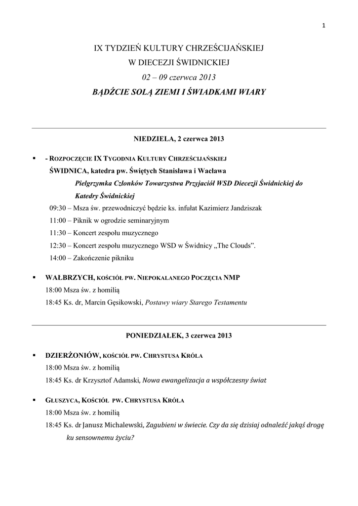 1 IX TYDZIEŃ KULTURY CHRZEŚCIJAŃSKIEJ W DIECEZJI ŚWIDNICKIEJ 02 – 09 czerwca 2013 BĄDŹCIE SOLĄ ZIEMI I ŚWIADKAMI WIARY NIEDZIELA, 2 czerwca 2013 - ROZPOCZĘCIE IX TYGODNIA KULTURY CHRZEŚCIJAŃSKIEJ ŚWIDNICA, katedra pw. Świętych Stanisława i Wacława Pielgrzymka Członków Towarzystwa Przyjaciół WSD Diecezji Świdnickiej do Katedry Świdnickiej 09:30 – Msza św. przewodniczyć będzie ks. infułat Kazimierz Jandziszak 11:00 – Piknik w ogrodzie seminaryjnym 11:30 – Koncert zespołu muzycznego 12:30 – Koncert zespołu muzycznego WSD w Świdnicy „The Clouds”. 14:00 – Zakończenie pikniku WAŁBRZYCH, KOŚCIÓŁ PW. NIEPOKALANEGO POCZĘCIA NMP 18:00 Msza św. z homilią 18:45 Ks. dr, Marcin Gęsikowski, Postawy wiary Starego Testamentu PONIEDZIAŁEK, 3 czerwca 2013 DZIERŻONIÓW, KOŚCIÓŁ PW. CHRYSTUSA KRÓLA 18:00 Msza św. z homilią 18:45 Ks. dr Krzysztof Adamski, Nowa ewangelizacja a współczesny świat GŁUSZYCA, KOŚCIÓŁ PW. CHRYSTUSA KRÓLA 18:00 Msza św. z homilią 18:45 Ks. dr Janusz Michalewski, Zagubieni w świecie. Czy da się dzisiaj odnaleźć jakąś drogę ku sensownemu życiu? 2 STRZEGOM, BAZYLIKA PW. ŚWIĘTYCH PIOTRA I PAWŁA 18:00 Msza św. z homilią 18:45 Ks. dr hab. Jan Klinkowski , Od wiary Abrahama do wyznania wiary Piotra ŚWIEBODZICE, KOŚCIÓŁ PW. ŚW. BRATA ALBERTA CHMIELOWSKIEGO 18:00 Msza św. z homilią 18:45 Ks. mgr lic. Tomasz Federkiewicz, „Jeśli sól utraci swój smak…”. Apostołowie wobec próby wiary na podstawie relacji ewangelicznych i Dziejów Apostolskich. ŚWIDNICA, KOŚCIÓŁ PW. ŚW. JÓZEFA OBLUBIEŃCA NMP 18:00 Msza św. z homilią 18:45 Ks. dr Arkadiusz Chwastyk, Wierność małżeńska a zgoda Kościoła na rozejście się osób po ślubie kościelnym ŚWIDNICA, KOŚCIÓŁ PW. ŚWIĘTEGO DUCHA 18:00 Msza św. z homilią 18:45 ks. dr. Krzysztof Moszumański, Świadkowie wiary z tej ziemi - śląscy święci i błogosławieni WAŁBRZYCH, KOŚCIÓŁ PW. ŚW. JÓZEFA ROBOTNIKA 17:30 Msza św. z homilią 18:15 Ks. dr Krzysztof Ora, Nie jest dobrze, aby człowiek był sam. Rola i miejsce wspólnot w życiu Kościoła WTOREK, 4 czerwca 2013 BIELAWA, KAPLICA PARAFII PW. MIŁOSIERDZIA BOŻEGO 18:00 Msza św. z homilią 18:45 Ks. dr Arkadiusz Chwastyk, Wierność małżeńska a zgoda Kościoła na rozejście się osób po ślubie kościelnym BIELAWA, KOŚCIÓŁ PW. WNIEBOWZIĘCIA NMP 18:00 Msza św. z homilią 18:45 Ks. dr Janusz Michalewski, Zagubieni w świecie. Czy da się dzisiaj odnaleźć jakąś drogę ku sensownemu życiu? 3 ŚWIDNICA, KOŚCIÓŁ PW. ŚW. ANDRZEJA BOBOLI 18:00 Msza św. z homilią 18:45 Ks. dr Krzysztof Adamski, Nowa ewangelizacja a współczesny świat ŚWIDNICA, KOŚCIÓŁ PW. MIŁOSIERDZIA BOŻEGO 18:00 Msza św. z homilią 18:45 Ks. dr Witold Baczyński, Kościół a nowe technologie ŚWIDNICA, KOŚCIÓŁ PW. ŚW. JÓZEFA OBLUBIEŃCA NMP 18:00 Msza św. z homilią 18:45 Ks. mgr lic. Tomasz Federkiewicz, „Jeśli sól utraci swój smak…”. Apostołowie wobec próby wiary na podstawie relacji ewangelicznych i Dziejów Apostolskich WAŁBRZYCH, KOŚCIÓŁ PW. NIEPOKALANEGO POCZĘCIA NMP 18:00 Msza św. z homilią 18:45 Ks. dr , Ks. dr Julian Nastałek, Nauczmy się wierzyć. Zaproszenie do wiary Benedykta XVI ŚRODA, 5 czerwca 2013 GŁUSZYCA, KOŚCIÓŁ PW. CHRYSTUSA KRÓLA 18:00 Msza św. z homilią 18:45 Ks. dr, Krzysztof Ora, Nie jest dobrze, aby człowiek był sam. Rola i miejsce wspólnot w życiu Kościoła STRZEGOM, KOŚCIÓŁ PW. NAJŚWIĘTSZEGO ZBAWICIELA ŚWIATA I MATKI BOŻEJ SZKAPLERZNEJ 17:30 Msza św. z homilią 18:15 Ks. dr hab. Jan Klinkowski , Od wiary Abrahama do wyznania wiary Piotra ŚWIDNICA, WSD IX POSIEDZENIE ŚWIDNICKIEGO TOWARZYSTWA TEOLOGICZNEGO) Godz. 16:30 Adoracja Najświętszego Sakramentu (kaplica główna) Godz. 17:00 Wykład Ks. dra Tadeusz Chlipały, Problematyka pracy ludzkiej w ujęciu ks. Józefa Majki. Aspekt teologicznomoralny (mała aula) 4 WAŁBRZYCH, KOŚCIÓŁ PW. ŚW. JERZEGO 18:00 Msza św. z homilią 18:45 Ks. dr hab. Jarosław Lipniak, Czy dialog z judaizmem jest możliwy? ŚWIDNICA, KOŚCIÓŁ PW. ŚW. NMP KRÓLOWEJ POLSKI 18:00 Nowenna do NMP Nieustającej Pomocy z rozważaniem Ks. dra Dominika Ostrowskiego 18:30 Msza św. z homilią CZWARTEK, 6 czerwca 2013 DZIERŻONIÓW, MUZEUM MIEJSKIE DZIERŻONIOWA, UL. ŚWIDNICKA 30 10:00 – 10:45 Prelekcja Ks. dra Krzysztofa Moszumańskiego, Świadkowie wiary z tej ziemi śląscy święci i błogosławieni ŚWIDNICA, KATEDRA PW. ŚWIĘTYCH STANISŁAWA I WACŁAWA ZAKOŃCZENIE OKRAWY UROCZYSTOŚCI NAJŚWIĘTSZEGO CIAŁA I KRWI CHRYSTUSA 18:00 Msza św. z homilią 18:45 Procesja eucharystyczna PIĄTEK, 7 czerwca 2013 DZIERŻONIÓW, KOŚCIÓŁ PW. CHRYSTUSA KRÓLA 18:00 Msza św. z homilią 18:45 Ks. dr Arkadiusz Chwastyk, Wierność małżeńska a zgoda Kościoła na rozejście się osób po ślubie kościelnym KUDOWA ZDRÓJ, KOŚCIÓŁ PW. ŚW. BARTŁOMIEJA 18:00 Msza św. z homilią 18:45 Ks. dr Julian Nastałek, Nauczmy się wierzyć. Zaproszenie do wiary Benedykta XVI STRZEGOM, BAZYLIKA PW. ŚWIĘTYCH PIOTRA I PAWŁA 18:00 Msza św. z homilią 18:45 Ks. mgr lic. Tomasz Federkiewicz, „Jeśli sól utraci swój smak…”. Apostołowie wobec próby wiary na podstawie relacji ewangelicznych i Dziejów Apostolskich. 5 ŚWIDNICA, KOŚCIÓŁ PW. MIŁOSIERDZIA BOŻEGO 18:00 Msza św. z homilią 18:45 Ks. dr Krzysztof Moszumański, Świadkowie wiary z tej ziemi - śląscy święci i błogosławieni WAŁBRZYCH, KOŚCIÓŁ PW. ŚW. JERZEGO 18:00 Msza św. z homilią 18:45 Ks. dr Wiesław Rusin, Kryzys ekologiczny a chrześcijańska doktryna religijna SOBOTA, 8 czerwca 2013 DZIERŻONIÓW, KOŚCIÓŁ PW. KRÓLOWEJ RÓŻAŃCA ŚWIĘTEGO 18:30 Msza św. z homilią 19:15 Ks. dr Janusz Michalewski, Zagubieni w świecie. Czy da się dzisiaj odnaleźć jakąś drogę ku sensownemu życiu? STRZEGOM, KOŚCIÓŁ PW. NAJŚWIĘTSZEGO ZBAWICIELA ŚWIATA I MATKI BOŻEJ SZKAPLERZNEJ 18:30 Msza św. z homilią 19:15 K