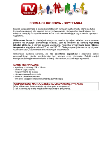 FORMA SILIKONOWA - BRYTFANKA Można już zapomnieć o ciężkich metalowych formach kuchennych, które nie tylko trudno było domyć, ale również ich przechowywanie nie było zbyt komfortowe. Ich miejsce zastąpiły formy silikonowe, które znacznie ułatwiają przygotowanie pysznych wypieków. Silikonowa forma do ciasta jest elastyczna, można ją zwijać, składać, a ona zawsze powróci do swojego pierwotnego kształtu. Jest to możliwe za sprawą wysokiej jakości silikonu, z którego została wykonana. Foremka wytrzymuje duże różnice temperatur sięgające od – 40°C aż do 230 °C. Dlatego spokojnie można jej używać w piekarnikach, kuchenkach mikrofalowych i lodówkach. Silikonowa budowa sprawia, że nie pochłania zapachów i zapewnia dobre przewodnictwo ciepła, zmniejszając tym samym czas pieczenia. Dzięki swojej elastyczności wyjmowanie ciasta z formy nie stanowi już żadnego wyzwania. DANE TECHNICZNE: - wymiary podstawy: 24 x 18 cm - łatwa w czyszczeniu - nie przywiera do ciasta - nie wymaga natłuszczania - łatwa w przechowywaniu - wysokiej jakości silikon do kontaktu z żywnością ODPOWIEDZI NA NAJCZĘŚCIEJ ZADAWANE PYTANIA Czy silikonowa forma nadaje się do mycia w zmywarce? Tak. Silikonową formę można myć również w zmywarce.