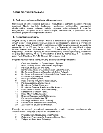 OCENA SKUTKÓW REGULACJI 1. Podmioty, na które oddziałuje akt normatywny. Nowelizacja obejmie uczelnie publiczne i niepubliczne, jednostki naukowe Polskiej Akademii Nauk, instytuty badawcze, studentów, doktorantów, nauczycieli akademickich, osoby pełniące funkcje organów jednoosobowych i organów kolegialnych, założycieli uczelni niepublicznych, absolwentów, a pośrednio także otoczenie gospodarcze i społeczne uczelni. 2. Konsultacje społeczne. Projekt ustawy o zmianie ustawy - Prawo o szkolnictwie wyższym oraz niektórych innych ustaw (dalej: projekt ustawy) zostanie zamieszczony, zgodnie z wymogami art. 5 ustawy z dnia 7 lipca 2005 r. o działalności lobbingowej w procesie stanowienia prawa (Dz. U. Nr 169, poz. 1414, z późn. zm.), w Biuletynie Informacji Publicznej na stronie internetowej Ministerstwa Nauki i Szkolnictwa Wyższego oraz w BIP Rządowego Centrum Legislacji, w zakładce Rządowy proces legislacyjny, stosownie do przepisów uchwały nr 49 Rady Ministrów z dnia 19 marca 2002 r. - Regulamin pracy Rady Ministrów (M.P. Nr 13, poz. 221, z późn. zm.). Projekt ustawy zostanie skonsultowany z następującymi podmiotami: 1) 2) 3) 4) 5) 6) 7) 8) 9) 10) 11) 12) 13) 14) 15) 16) 17) 18) 19) 20) Centralną Komisją do Spraw Stopni i Tytułów, Radą Główną Nauki i Szkolnictwa Wyższego, Polską Komisją Akredytacyjną, Konferencją Rektorów Akademickich Szkół Polskich, Konferencją Rektorów Zawodowych Szkół Polskich, Konferencją Rektorów Publicznych Szkół Zawodowych, Konferencją Episkopatu Polski, Polską Akademią Nauk, Radą Główną Instytutów Badawczych, Polską Akademią Umiejętności, Komitetem Polityki Naukowej, Komitetem Ewaluacji Jednostek Naukowych, Narodowym Centrum Badań i Rozwoju, Narodowym Centrum Nauki, Radą Młodych Naukowców, Krajową Reprezentacją Doktorantów, Parlamentem Studentów RP, Fundacją na Rzecz Nauki Polskiej, Niezależnym Zrzeszeniem Studentów, Zrzeszeniem Studentów Polskich. Ponadto, w ramach konsultacji społecznych, projekt zostanie przekazany do zaopiniowania następującym partnerom społecznym: 1) 2) 3) Pracodawcom Rzeczypospolitej Polskiej, Związkowi Pracodawców Business Centre Club, Związkowi Rzemiosła Polskiego, 4) 5) 6) 7) 8) 9) 10) 11) 12) 13) Polskiej Konfederacji Pracodawców Prywatnych Lewiatan, Krajowej Sekcji Nauki NSZZ „Solidarność”, Ogólnopolskiemu Porozumieniu Związków Zawodowych, Radzie Szkolnictwa Wyższego i Nauki Związku Nauczycielstwa Polskiego, Forum Związków Zawodowych, Wolnym Związkom Zawodowym „Sierpień 80”, Niezależnemu Samorządnemu Związkowi Zawodowemu „Solidarność”, Radzie Działalności Pożytku Publicznego przy Ministrze Pracy i Polityki Społecznej, Stowarzyszeniu Księgowych w Polsce, Polskiemu Stowarzyszeniu Upowszechniania Komputerowych Systemów Inżynierskich "ProCAx". Projekt ustawy został poprzedzony przyjęciem przez Radę Ministrów założeń do projektu ustawy o zmianie ustawy - Prawo o szkolnictwie wyższym oraz niektórych innych ustaw (dalej: projekt założeń). Projekt założeń został szeroko skonsultowany, a wyniki konsultacji zostały przedstawione poniżej. Projekt założeń został także skierowany do Komisji Wspólnej Rządu i Samorządu Terytorialnego. Komisja w dniu 27 lutego 2013 r. zaopiniowała projekt pozytywnie. Omówienie wyników konsultacji społecznych założeń do projektu ustawy 1. Potwierdzanie efektów uczenia się pozaformalnego i nieformalnego. Szczegółowe uwagi w tym zakresie zgłosiły: Konferencja Rektorów Akademickich Szkół Polskich (KRASP), Konferencja Rektorów Publicznych Szkół Zawodowych (KRePSZ), Rada Główna Nauki i Szkolnictwa Wyższego (RGNiSzW), Polska Komisja Akredytacyjna (PKA), Rada Młodych Naukowców, Polska Konfederacja Pracodawców Prywatnych Lewiatan (PKPP Lewiatan), Krajowa Izba Diagnostów Laboratoryjnych, uczelnie medyczne. KRASP podniósł, że uzyskanie potwierdzenia efektów kształcenia zdobytych poza edukacją formalną powinno być zależne od już osiągniętych efektów uczenia się, a nie od wieku osoby ocenianej. Uwagę uwzględniono – zmieniono wymagania stawiane osobom, które zamierzają skorzystać z instytucji potwierdzania efektów uczenia się, przyznając to prawo osobom posiadającym świadectwo dojrzałości i 5 lat doświadczenia po maturze – w przypadku ubiegania się o przyjęcie na studia pierwszego stopnia lub jednolite studia magisterskie albo tytuł zawodowy licencjata (inżyniera lub inny równorzędny) i 3 lata doświadczenia po ukończeniu studiów pierwszego stopnia – w przypadku ubiegania się o przyjęcie na studia drugiego stopnia. W przypadku posiadania tytułu zawodowego magistra wystarczające byłoby dwuletnie doświadczenie zawodowe. Ponadto wyrażano wątpliwości wobec proponowanych wymagań, jakie muszą spełnić jednostki organizacyjne uczelni, aby móc potwierdzać efekty uczenia się uzyskane drogą inną niż formalna. W celu zagwarantowania jakości kształcenia proponuje się, aby prawo do potwierdzania efektów uczenia się miały tylko te podstawowe jednostki organizacyjne, które posiadają przynajmniej pozytywną ocenę programową lub instytucjonalną Polskiej Komisji Akredytacyjnej, a w przypadku nieprzeprowadzenia jeszcze oceny – jednostki, które posiadają uprawnienia do nadawania stopnia doktora. Ponadto dokonywana będzie przez Polską Komisję Akredytacyjną ocena jakości potwierdzania przez uczelnię ww. efektów. Wnoszono także o wyłączenie wszystkich kierunków medycznych z procedury potwierdzania efektów uczenia się uzyskanych drogą inną niż formalna, podnosząc, iż projektowane rozwiązanie zagraża jakości kształcenia na tych właśnie kierunkach. Rozwiązania planowane dla instytucji potwierdzania efektów uczenia się mają na celu przede wszystkim zapewnienie wysokiej jakości kształcenia. Ich istotą będzie weryfikacja efektów uczenia się w oparciu o efekty określone w programie 