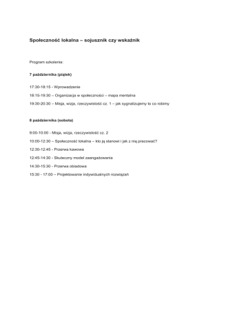Społeczność lokalna – sojusznik czy wskaźnik Program szkolenia: 7 października (piątek) 17:30-18:15 - Wprowadzenie 18:15-19:30 – Organizacja w społeczności – mapa mentalna 19:30-20:30 – Misja, wizja, rzeczywistość cz. 1 – jak sygnalizujemy to co robimy 8 października (sobota) 9:00-10:00 - Misja, wizja, rzeczywistość cz. 2 10:00-12:30 – Społeczność lokalna – kto ją stanowi i jak z nią pracować? 12:30-12:45 - Przerwa kawowa 12:45-14:30 - Skuteczny model zaangażowania 14:30-15:30 - Przerwa obiadowa 15:30 - 17:00 – Projektowanie indywidualnych rozwiązań