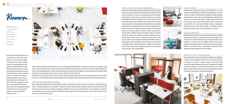 10 meble biurowe, konferencyjne KINNARPS POLSKA Sp. z o.o. ul. Puławska 354/356 02-819 Warszawa tel. 22/ 314 64 70 (74) tel. 22/ 899 10 29 fax 22/ 899 10 43 [email protected] www.kinnarps.pl W pracy spędzamy od 1500 do 2000 godzin rocznie, z tego większość na tym samym krześle, przy tym samym biurku i w tym samym otoczeniu. Dlatego tak dużym wyzwaniem jest stworzenie środowiska biurowego, które wspomaga efektywność i dobre samopoczucie pracowników. Dzięki Kinnarps mają Państwo dostęp do mebli, akcesoriów i usług, które umożliwią realizację poszukiwanego przez Państwa rozwiązania. Kinnarps jest czołowym w Skandynawii oraz drugim co do wielkości w Europie dostawcą kompleksowego wyposażenia biur i miejsc pracy. Dzięki przedstawicielstwom zlokalizowanym w 40 krajach oraz 200 salonom ekspozycyjnym na całym świecie, w ciągu swojej blisko 70-letniej historii Kinnarps stał się firmą o zasięgu globalnym, spełniając oczekiwania klientów nie tylko wobec elementów umeblowania, ale również całego wachlarza związanych z tym usług. 184 Miejsca wypoczynku i regeneracji Miejsca pracy W biurze ważne są nie tylko miejsca pracy i spotkań, ale także pomieszczenia, które wyraźnie służą wypoczynkowi i regeneracji sił witalnych. Dzięki przerwom spędzonym w atrakcyjnym środowisku pracownicy czują się dobrze, są zmotywowani i lepiej wykonują swoją pracę. Kinnarps posiada szereg urozmaiconych rozwiązań, które można zastosować w każdym biurze od wyposażenia mikroskopijnych coffee points poprzez ascetyczny lunch room, nowoczesną kawiarenkę, po dużą, reprezentacyjną restaurację w biurowcu. Współpraca z Kinnarps zapewnia dostęp do szerokiego zakresu interesujących marek. Produkty włączone do naszych kompleksowych rozwiązań powstały we współpracy ze słynnymi projektantami i dzięki temu z powodzeniem mogą stanowić zarówno podstawę wystroju wnętrza lub dodatek do niego. W Kinnarps dysponujemy siecią wybranych partnerów, którzy zapewniają profesjonalne rozwiązania w dziedzinie wyposażenia wnętrz, ergonomii, akustyki, oświetlenia itp. Rozwiązania firmy Kinnarps opierają się na najnowszych spostrzeżeniach, dotyczących natury ludzkiej, życia zawodowego i infrastruktury biurowej oraz połączenia zdrowia i dobrego samopoczucia z ekonomią. Wiele badań wykazuje, że ludzie wypoczęci i zadowoleni z życia, pracują lepiej. Blisko siedem dekad doświadczenia powoduje, że Kinnarps zapewnia bezpieczne i kompleksowe rozwiązania skupiające się na funkcji, ergonomii i skandynawskim designie. Obecnie Kinnarps jest jednym z największych producentów mebli w Europie i jednym z niewielu, którzy sami projektują, produkują, dostarczają i montują swoje rozwiązania. Wszystko z myślą o potrzebach klientów. Fundamentem wielu rozwiązań jest nasz elastyczny system modułowy, który można ściśle dostosować do potrzeb konkretnego biura, wynikających z rodzaju wykonywanych w nim czynności i charakteru pracy danej firmy, warunków pomieszczeń i indywidualnych wymagań poszczególnych pracowników. Każda część naszego systemu jest tak zaprojektowana, aby mogła funkcjonować autonomicznie lub jako element całości. Dzięki temu możemy zaoferować projekt wnętrza, które ma przejrzystą strukturę, podnosi wydajność, zapewnia porządek i oszczędza miejsce, a w przyszłości może zostać w prosty sposób zmodyfikowane, stosownie do zmieniających się potrzeb. Oferowane przez nas systemy mebli są uniwersalne – tworzą efektywne i elastyczne środowiska pracy niezależnie od tego, czy w biurze pracuje dziesięć, sto czy tysiąc osób. Miejsca spotkań Podstawą filozofii Kinnarps jest fakt, że ludzie są istotami społecznymi, są towarzyscy i optymalnie funkcjonują w grupie. Dlatego nasze rozwiązania dotyczące miejsc spotkań i szkoleń stworzono w taki sposób, aby uczynić je jak najbardziej ekscytującymi, aby usprawnić komunikację i wzmóc kreatywność, a w ten sposób przyczynić się do wydajniejszej i bardziej twórczej pracy. Nasze rozwiązania dają szeroki wachlarz zastosowań: od codziennych, spontanicznych i przypadkowych kontaktów, do tych bardziej formalnych i reprezentacyjnych. Od kameralnego środowiska szkoleniowego do oficjalnych wystąpień przed tłumnymi audytoriami. Recepcje, hole i poczekalnie Oferujemy zintegrowane rozwiązania, które obejmują cały proces od analizy wymagań, poprzez projekt aranżacyjny i dostawę gotowych rozwiązań po serwis posprzedażny. Pozycja Kinnarps w świecie wyposażenia biur wynika z połączenia solidnej wiedzy o potrzebach klientów, nowoczesnej organizacji sprzedaży oraz stałego rozwoju produktów. Większość oferty pochodzi z 7 własnych fabryk zlokalizowanych w Szwecji i Niemczech. Portfolio grupy liczy 9 marek. Oprócz Kinnarps znajdują się w nim także skandynawskie marki: Skandiform, Materia i NC Nordic Care. Po przejęciu niemieckiej części firmy Samas, wiosną 2010 r. dołączyły do nich: Drabert i Martin Stoll. W Polsce od lat 90. XX w. Kinnarps jest uznawany za eksperta, szczególnie w obszarach dotyczących ekologii, wzornictwa i ergonomii środowiska biurowego. Firma zatrudnia ponad 70 osób, które w 7 biurach handlowych w głównych miastach Polski (Warszawa, Łódź, Poznań, Gdynia, Kraków, Katowice i Wrocław) służą klientom fachową wiedzą i doświadczeniem. Optymalne środowisko pracy Naszym zdaniem dobre funkcjonowanie biura nie polega wyłącznie na zapewnieniu miejsca do pracy i redukcji kosztów, lecz przede wszystkim na organizacji komfortowych, zdrowych i motywujących warunków do wzrostu kreatywności i efektywności pracowników. Nasze przyszłościowe rozwiązania są wynikiem najnowszych spostrzeżeń w wielu dziedzinach związanych z ergonomią oraz zarządzaniem i organizacją pracy. Kładziemy też ogromny nacisk na aspekty psychologiczne i estetyczne środowiska pracy, dzięki którym powstaj