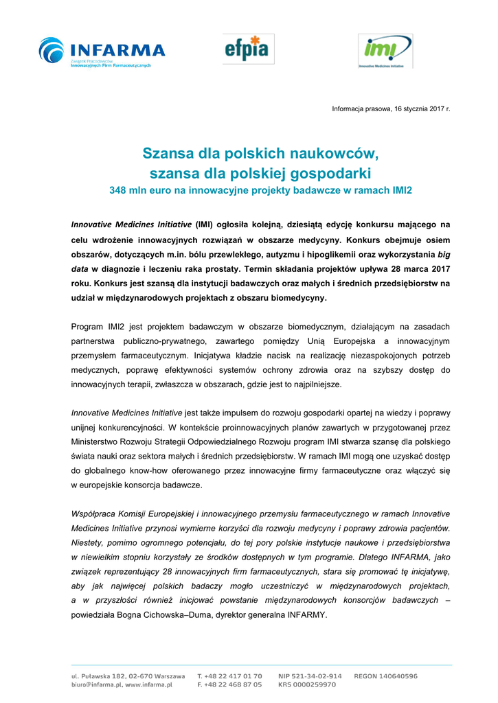 Informacja prasowa, 16 stycznia 2017 r. Szansa dla polskich naukowców, szansa dla polskiej gospodarki 348 mln euro na innowacyjne projekty badawcze w ramach IMI2 Innovative Medicines Initiative (IMI) ogłosiła kolejną, dziesiątą edycję konkursu mającego na celu wdrożenie innowacyjnych rozwiązań w obszarze medycyny. Konkurs obejmuje osiem obszarów, dotyczących m.in. bólu przewlekłego, autyzmu i hipoglikemii oraz wykorzystania big data w diagnozie i leczeniu raka prostaty. Termin składania projektów upływa 28 marca 2017 roku. Konkurs jest szansą dla instytucji badawczych oraz małych i średnich przedsiębiorstw na udział w międzynarodowych projektach z obszaru biomedycyny. Program IMI2 jest projektem badawczym w obszarze biomedycznym, działającym na zasadach partnerstwa publiczno-prywatnego, zawartego pomiędzy Unią Europejska a innowacyjnym przemysłem farmaceutycznym. Inicjatywa kładzie nacisk na realizację niezaspokojonych potrzeb medycznych, poprawę efektywności systemów ochrony zdrowia oraz na szybszy dostęp do innowacyjnych terapii, zwłaszcza w obszarach, gdzie jest to najpilniejsze. Innovative Medicines Initiative jest także impulsem do rozwoju gospodarki opartej na wiedzy i poprawy unijnej konkurencyjności. W kontekście proinnowacyjnych planów zawartych w przygotowanej przez Ministerstwo Rozwoju Strategii Odpowiedzialnego Rozwoju program IMI stwarza szansę dla polskiego świata nauki oraz sektora małych i średnich przedsiębiorstw. W ramach IMI mogą one uzyskać dostęp do globalnego know-how oferowanego przez innowacyjne firmy farmaceutyczne oraz włączyć się w europejskie konsorcja badawcze. Współpraca Komisji Europejskiej i innowacyjnego przemysłu farmaceutycznego w ramach Innovative Medicines Initiative przynosi wymierne korzyści dla rozwoju medycyny i poprawy zdrowia pacjentów. Niestety, pomimo ogromnego potencjału, do tej pory polskie instytucje naukowe i przedsiębiorstwa w niewielkim stopniu korzystały ze środków dostępnych w tym programie. Dlatego INFARMA, jako związek reprezentujący 28 innowacyjnych firm farmaceutycznych, stara się promować tę inicjatywę, aby jak najwięcej polskich badaczy mogło uczestniczyć w międzynarodowych projektach, a w przyszłości również inicjować powstanie międzynarodowych konsorcjów badawczych – powiedziała Bogna Cichowska–Duma, dyrektor generalna INFARMY. Projekty w ramach 10. edycji konkursu IMI2: Hipoglikemia – zbadanie mechanizmów i uwarunkowań klinicznych leżących u podstaw hipoglikemii poprzez łączenie baz danych uzyskanych z badań klinicznych; Wykorzystanie big data w diagnozie i leczeniu raka prostaty; Poprawa opieki nad pacjentami cierpiącymi z powodu ostrego lub przewlekłego bólu; Stworzenie paneuropejskiej sieci badań klinicznych w pediatrii, które ułatwią opracowanie oraz dostęp do innowacyjnych leków i terapii; Bioprodukcja 2020 – rozwój innowacyjnych narzędzi analitycznych o wysokiej wydajności oraz procesów komercyjnej hodowli komórek; Genetyka – odblokowanie genowej rodziny przenośników substancji rozpuszczalnych w celu zwiększenia efektywności nowych terapii; Wykorzystanie medycyny personalizowanej w zaburzeniach ze spektrum autyzmu; Zwiększanie zaangażowania pacjentów w badania nad nowymi lekami. Zgłoszenia do konkursu w powyższych tematach są przyjmowane od 4 stycznia do 28 marca br. Szczegółowe informacje na temat poszczególnych tematów oraz sposobu aplikacji są dostępne na kanale Youtube oraz stronie IMI. IMI (Innovative Medicines Initiative) IMI jest partnerstwem publiczno-prywatnym (PPP) między Komisją Europejską a Europejską Federacją Przemysłu i Stowarzyszeń Farmaceutycznych (EFPIA). Jest to największe tego typu przedsięwzięcie na świecie. Zadaniem IMI jest działanie na rzecz poprawy zdrowia publicznego poprzez przyspieszanie opracowywania oraz dostępu pacjentów do leków innowacyjnych, szczególnie w obszarach, w których potrzeby medyczne i społeczne nie są zaspokajane. Realizacja tego celu odbywa się poprzez współpracę pomiędzy kluczowymi podmiotami zaangażowanymi w badania medyczne, takimi jak uczelnie wyższe, przemysł farmaceutyczny oraz inne gałęzie przemysłu, małe i średnie przedsiębiorstwa, organizacje pacjentów oraz organy regulacyjne. www.imi.europe.eu O INFARMIE Związek Pracodawców Innowacyjnych Firm Farmaceutycznych INFARMA reprezentuje 28 wiodących firm sektora farmaceutycznego, prowadzących działalność badawczo-rozwojową i produkujących leki innowacyjne. INFARMA jest członkiem międzynarodowej organizacji zrzeszającej innowacyjną branżę farmaceutyczną – Europejskiej Federacji Przemysłu i Stowarzyszeń Farmaceutycznych (EFPIA), a także Pracodawców RP oraz Krajowej Izby Gospodarczej. Dodatkowych informacji udzielają: Ewa Górska - Cal Specjalista ds. Komunikacji INFARMA Tel. kom.: 603 905 252; e-mail: [email protected] Borys Gryniewicz MSLGROUP Poland Biuro Prasowe INFARMA Tel. kom.: 534 734 102; e-mail: [email protected]