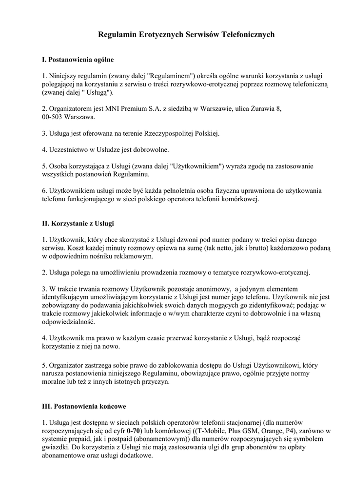 Regulamin Erotycznych Serwisów Telefonicznych I. Postanowienia ogólne 1. Niniejszy regulamin (zwany dalej "Regulaminem") określa ogólne warunki korzystania z usługi polegającej na korzystaniu z serwisu o treści rozrywkowo-erotycznej poprzez rozmowę telefoniczną (zwanej dalej " Usługą"). 2. Organizatorem jest MNI Premium S.A. z siedzibą w Warszawie, ulica Żurawia 8, 00-503 Warszawa. 3. Usługa jest oferowana na terenie Rzeczypospolitej Polskiej. 4. Uczestnictwo w Usłudze jest dobrowolne. 5. Osoba korzystająca z Usługi (zwana dalej "Użytkownikiem") wyraża zgodę na zastosowanie wszystkich postanowień Regulaminu. 6. Użytkownikiem usługi może być każda pełnoletnia osoba fizyczna uprawniona do użytkowania telefonu funkcjonującego w sieci polskiego operatora telefonii komórkowej. II. Korzystanie z Usługi 1. Użytkownik, który chce skorzystać z Usługi dzwoni pod numer podany w treści opisu danego serwisu. Koszt każdej minuty rozmowy opiewa na sumę (tak netto, jak i brutto) każdorazowo podaną w odpowiednim nośniku reklamowym. 2. Usługa polega na umożliwieniu prowadzenia rozmowy o tematyce rozrywkowo-erotycznej. 3. W trakcie trwania rozmowy Użytkownik pozostaje anonimowy, a jedynym elementem identyfikującym umożliwiającym korzystanie z Usługi jest numer jego telefonu. Użytkownik nie jest zobowiązany do podawania jakichkolwiek swoich danych mogących go zidentyfikować; podając w trakcie rozmowy jakiekolwiek informacje o w/wym charakterze czyni to dobrowolnie i na własną odpowiedzialność. 4. Użytkownik ma prawo w każdym czasie przerwać korzystanie z Usługi, bądź rozpocząć korzystanie z niej na nowo. 5. Organizator zastrzega sobie prawo do zablokowania dostępu do Usługi Użytkownikowi, który narusza postanowienia niniejszego Regulaminu, obowiązujące prawo, ogólnie przyjęte normy moralne lub też z innych istotnych przyczyn. III. Postanowienia końcowe 1. Usługa jest dostępna w sieciach polskich operatorów telefonii stacjonarnej (dla numerów rozpoczynających się od cyfr 0-70) lub komórkowej ((T-Mobile, Plus GSM, Orange, P4), zarówno w systemie prepaid, jak i postpaid (abonamentowym)) dla numerów rozpoczynających się symbolem gwiazdki. Do korzystania z Usługi nie mają zastosowania ulgi dla grup abonentów na opłaty abonamentowe oraz usługi dodatkowe. 2. Organizator dołoży wszelkich starań w celu zapewnienia prawidłowego działania Usługi. 3. Organizator nie ponosi odpowiedzialności za: a) treści przekazywane przez Użytkownika w ramach korzystania Usługi, b) korzystanie z Usługi przez osoby niepełnoletnie oraz osoby nieuprawnione do użytkowania telefonu, c) szkody spowodowane nieprawidłowym korzystaniem przez Użytkownika z Usługi, d) nieprawidłowe wybranie przez Użytkownika numeru, a w szczególności za sytuacje, kiedy uniemożliwia mu to prawidłowe skorzystanie z wybranego serwisu, e) ewentualny dyskomfort psychiczno-moralny, jaki może zostać potencjalnie wywołany poprzez treści zasłyszane w trakcie rozmowy telefonicznej, f) problemy w funkcjonowaniu Usługi, jeżeli nastąpiły one wskutek zdarzeń których Organizator przy zachowaniu należytej staranności nie był w stanie przewidzieć, lub którym nie mógł zapobiec, w szczególności w przypadku problemów związanych ze zdarzeniami losowymi o charakterze siły wyższej lub problemy techniczne leżące po stronie podmiotów trzecich, ze szczególnym uwzględnieniem operatorów telefonii komórkowej i stacjonarnej, g) korzystanie z Usługi przez Użytkowników niezgodnie z postanowieniami niniejszego Regulaminu lub bez zapoznania się z Regulaminem, w tym zwłaszcza wynikające z niewłaściwego zrozumienia przez Użytkownika charakteru Usługi oraz związanych z tym postanowień regulaminowych, przerwy w świadczeniu Usługi zaistniałe z przyczyn technicznych (np. konserwacja, przegląd, wymiana sprzętu) lub niezależnych od Organizatora, 4. Organizator zastrzega, iż treści zamieszczone w materiałach reklamowych nie mają charakteru oferty, jak i nie jest w stanie zagwarantować, iż rezultatem rozmowy prowadzonej przez Użytkownika będzie zadzierzgnięcie bezpośredniej formy kontaktu w jakiejkolwiek formie. Wszelkie ewentualne działania podjęte przez Użytkownika na skutek przeprowadzonej rozmowy są dobrowolne, a Organizator nie ponosi za nie odpowiedzialności. 5. Organizator zastrzega sobie prawo zmiany postanowień Regulaminu w razie zmiany przepisów prawnych lub z innej przyczyny. Regulamin w zmienionej formie obowiązuje od chwili podania do wiadomości Użytkowników Usługi. 6. Reklamacje dotyczące Usługi należy zgłaszać pisemnie pod adresem email: [email protected]